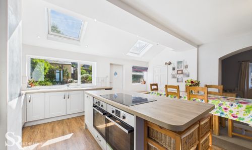 This stunning kitchen/diner has been significantly extended by the current owners, resulting in a wonderfully spacious and exceptionally bright room. Flooded with natural light from large uPVC windows to the rear aspect and stylish Velux ceiling windows, the space features elegant Karndean flooring throughout. Offering ample storage, the room boasts a range of wall and base units with dedicated space for an American-style fridge/freezer, alongside integrated appliances including a dishwasher and wine cooler. The impressive central island unit provides extensive worktop space and incorporates a sleek five-ring glass hob and two under-counter ovens. A tasteful feature wallpaper wall adds a touch of character, and open archways seamlessly connect to a cosy snug area and the main living room. A white painted timber door leads to the utility room.