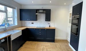 To the rear, the recently upgraded kitchen enjoys a bright, square layout next to the open plan living space. It offers ample workspace, a back door leading directly outside and a conveniently positioned downstairs w/c near the rear entrance.