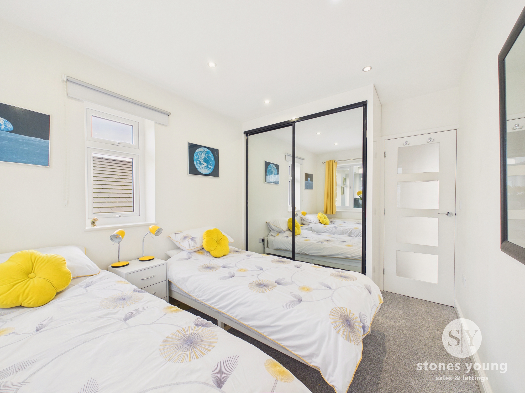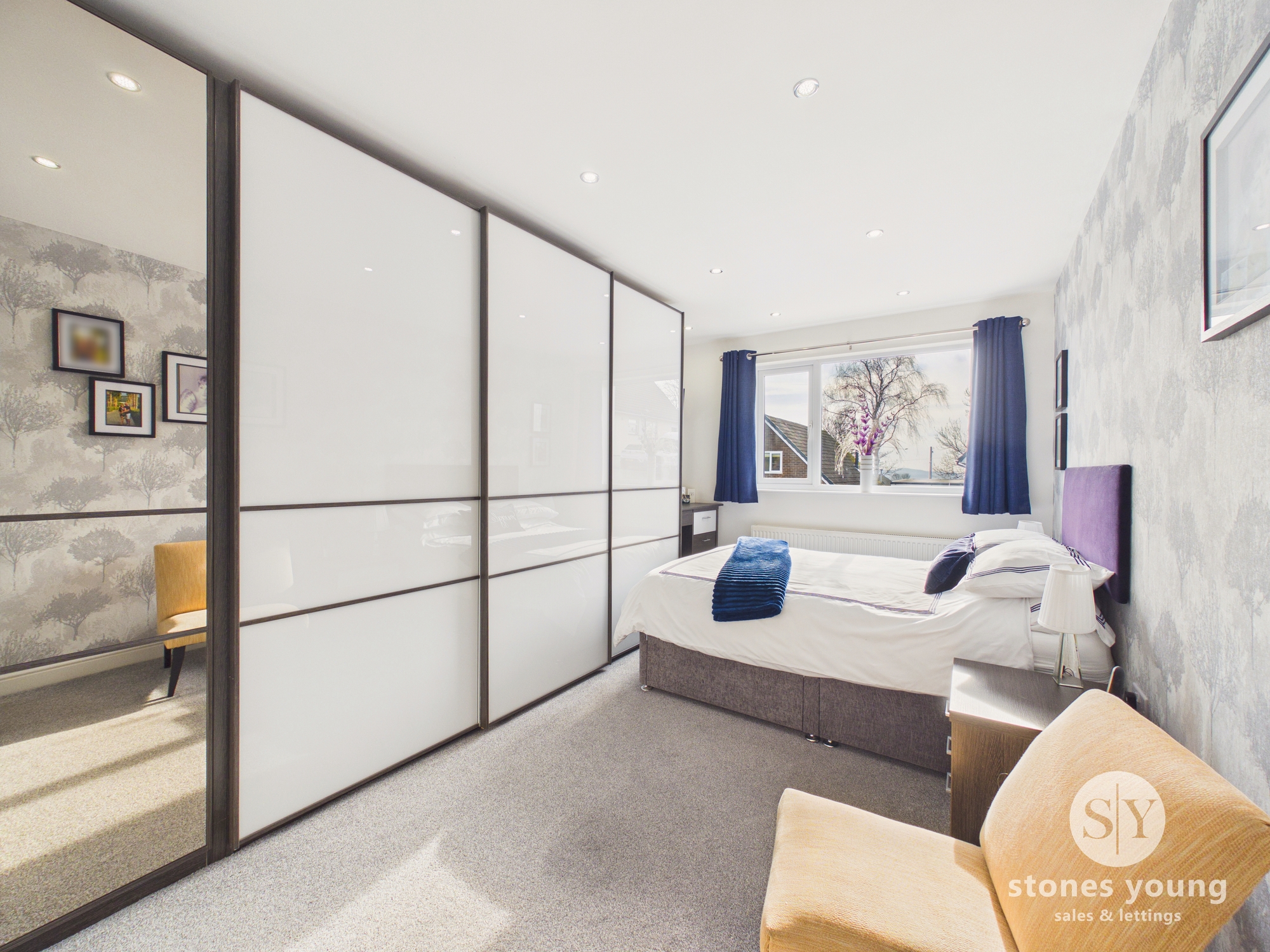 Double room with carpet flooring, modern fitted double wardrobe, recessed spotlighting, uPVC double glazed windows, panel radiator.
