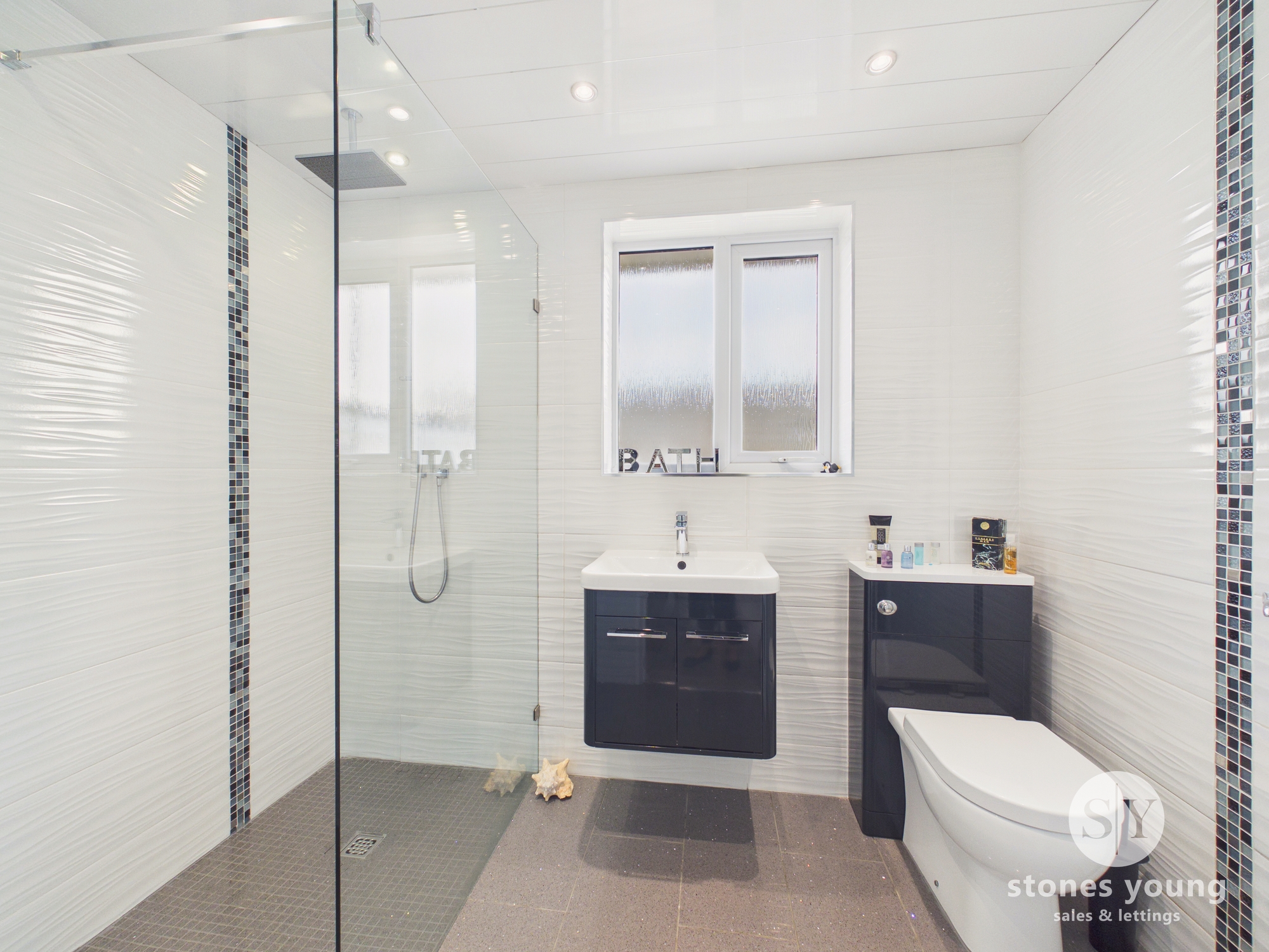 Attractive modern 3-pce suite comprising large walk-in shower with fixed glazed screen with overhead thermostatic rainfall shower and additional wall mounted shower with side control panel, white basin with mixer tap and vanity unit with cupboard under, concealed low level w.c., chrome ladder style radiator, fully tiled walls, tiled flooring, panelled ceiling with recessed spotlighting, uPVC double glazed window.
