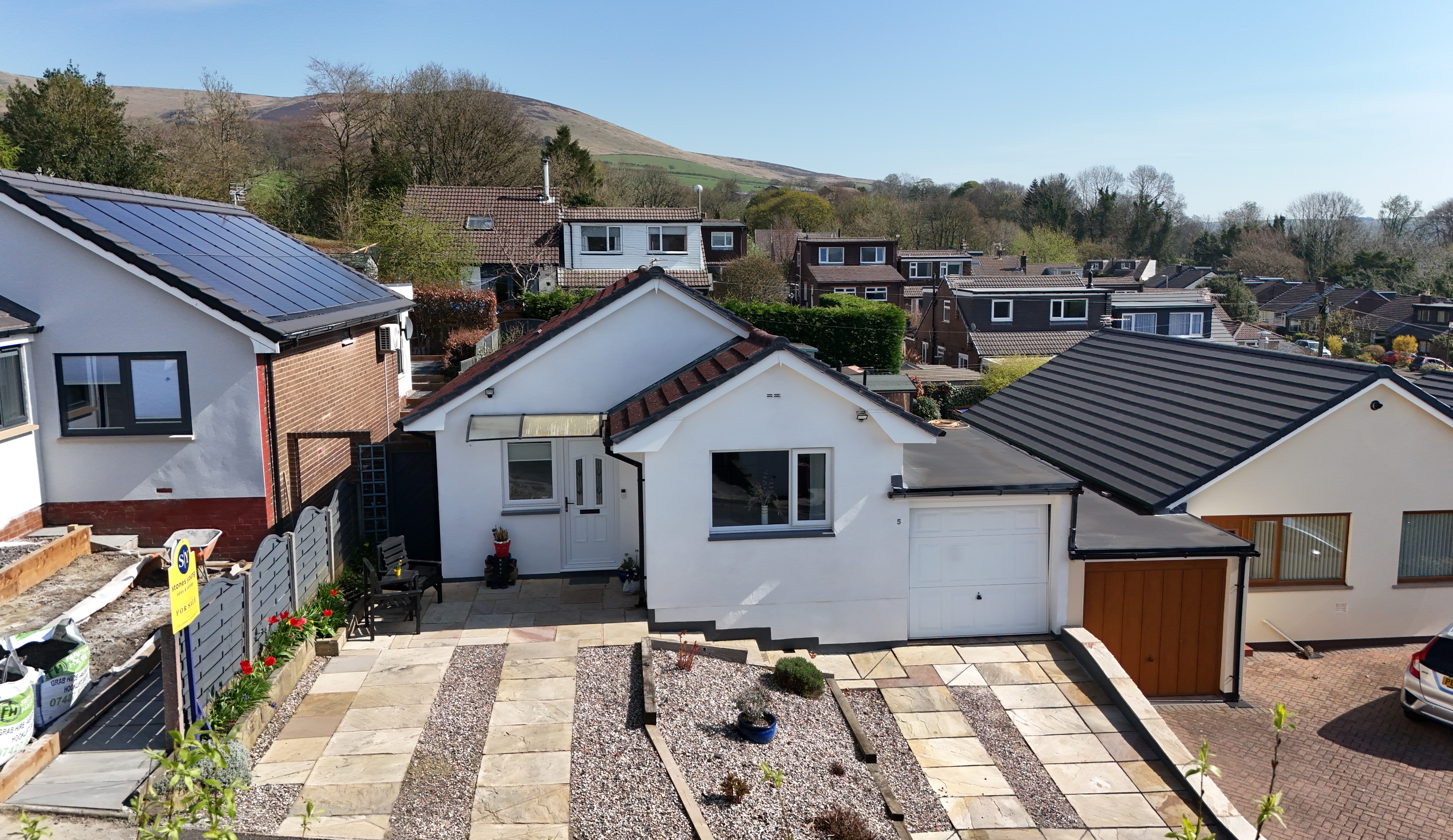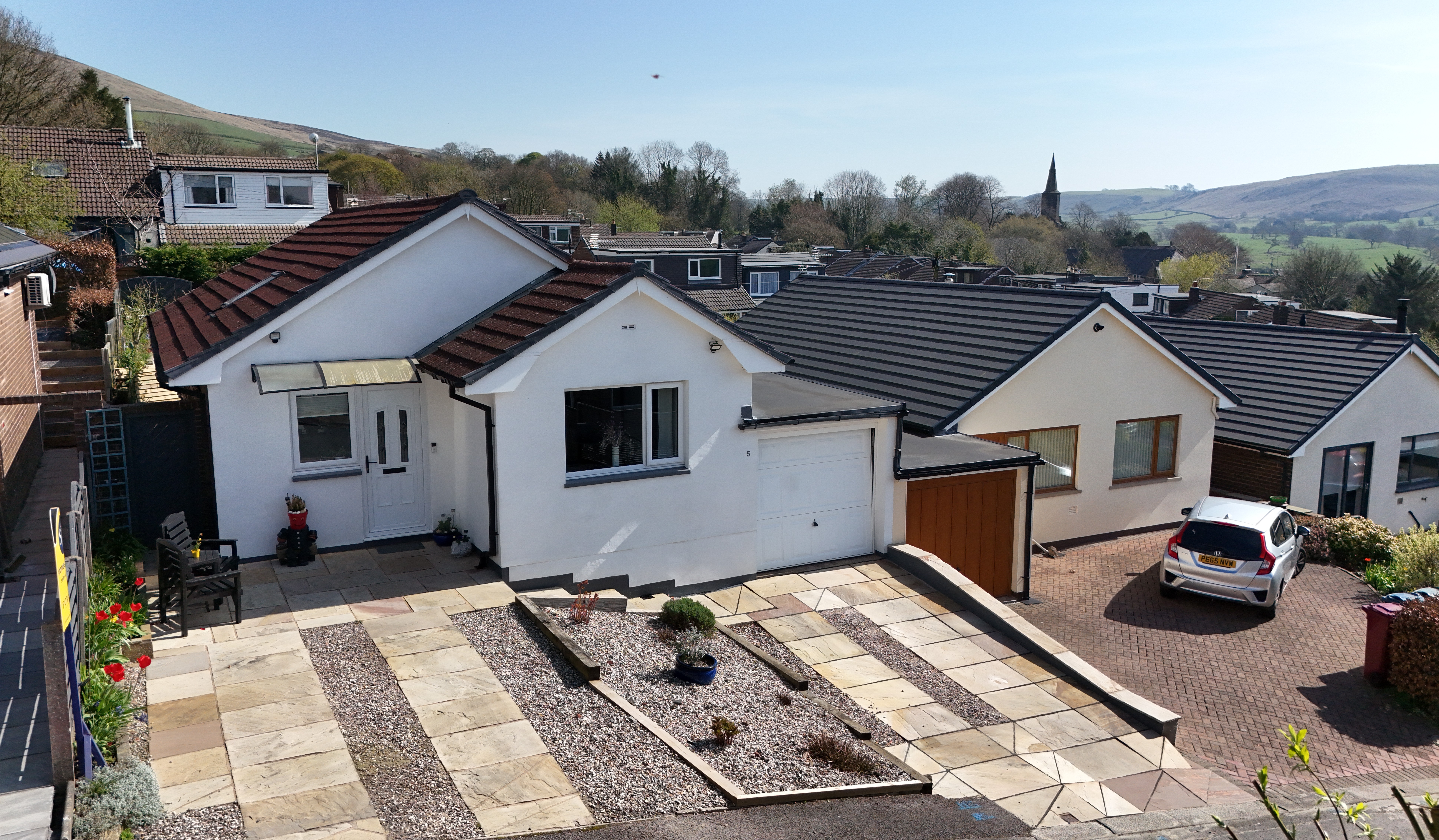 The outside space has been thoughtfully designed for both visual appeal and practicality. The front garden is pleasantly laid with a stone gravelled area, and Indian stone flagged driveways on either side provide private parking for two cars and there is an attached single garage. To the rear is a beautifully tiered, landscaped garden with lovely elevated views across the neighbouring hillside. This outdoor haven is attractively arranged with low maintenance in mind, featuring artificial lawns, a modern glass balustrade, stone flagged and gravelled patios and pathways, and raised planted borders with shrubs and small trees. This property truly offers a fantastic combination of stylish living and superb outdoor space in a sought-after village setting.