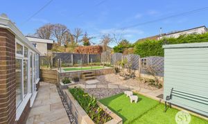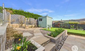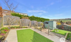 Pleasantly laid front garden with stone graveled area with side planted borders, indian stone flagged driveways to the sides with private parking for 2 cars, timber fencing surround and side gate access. Side attached single garage with up and over door, power and lighting, also housing wall mounted combination gas central heating boiler, plumbing for washing machine, space for tumble dryer, rear uPVC double glazed door to garden. To the rear is a beautiful tiered landscaped garden with lovely elevated views across the neighbouring hillside, attractively laid with low maintenance in mind with artificial lawns, modern glass balustrade, stone flagged and graveled patios and pathways with attractive raised planted garden borders with shrubs and small trees, timber storage shed, side area with greenhouse, cold water tap and timber fencing surround.