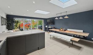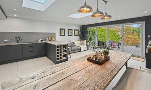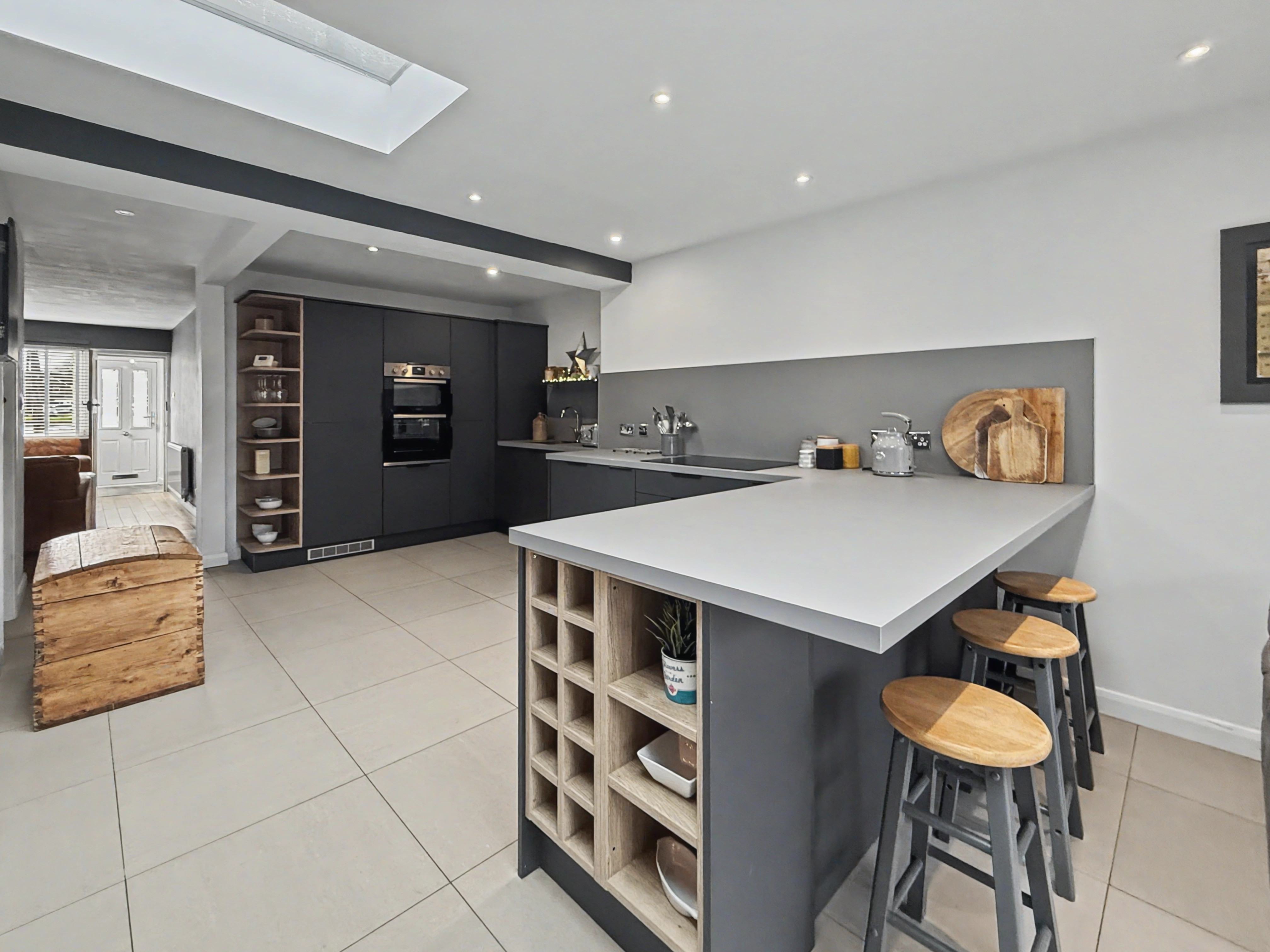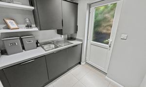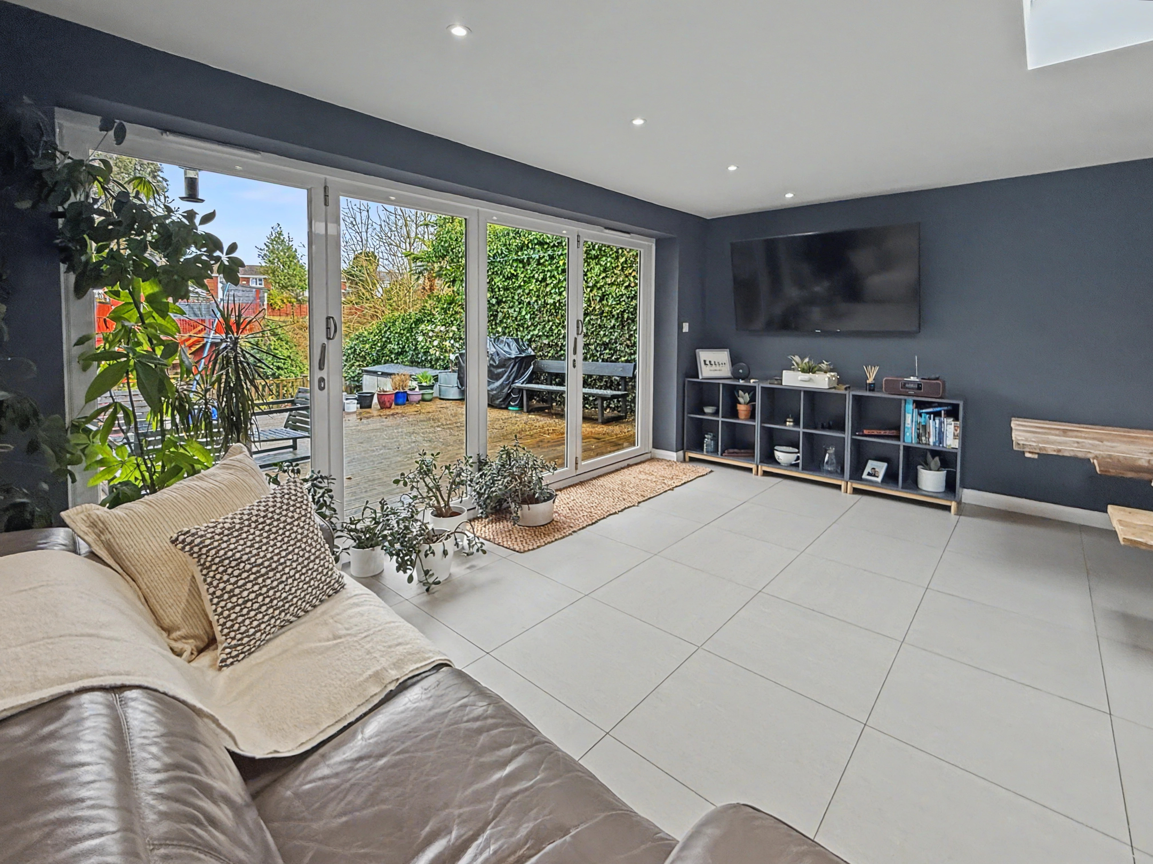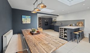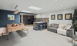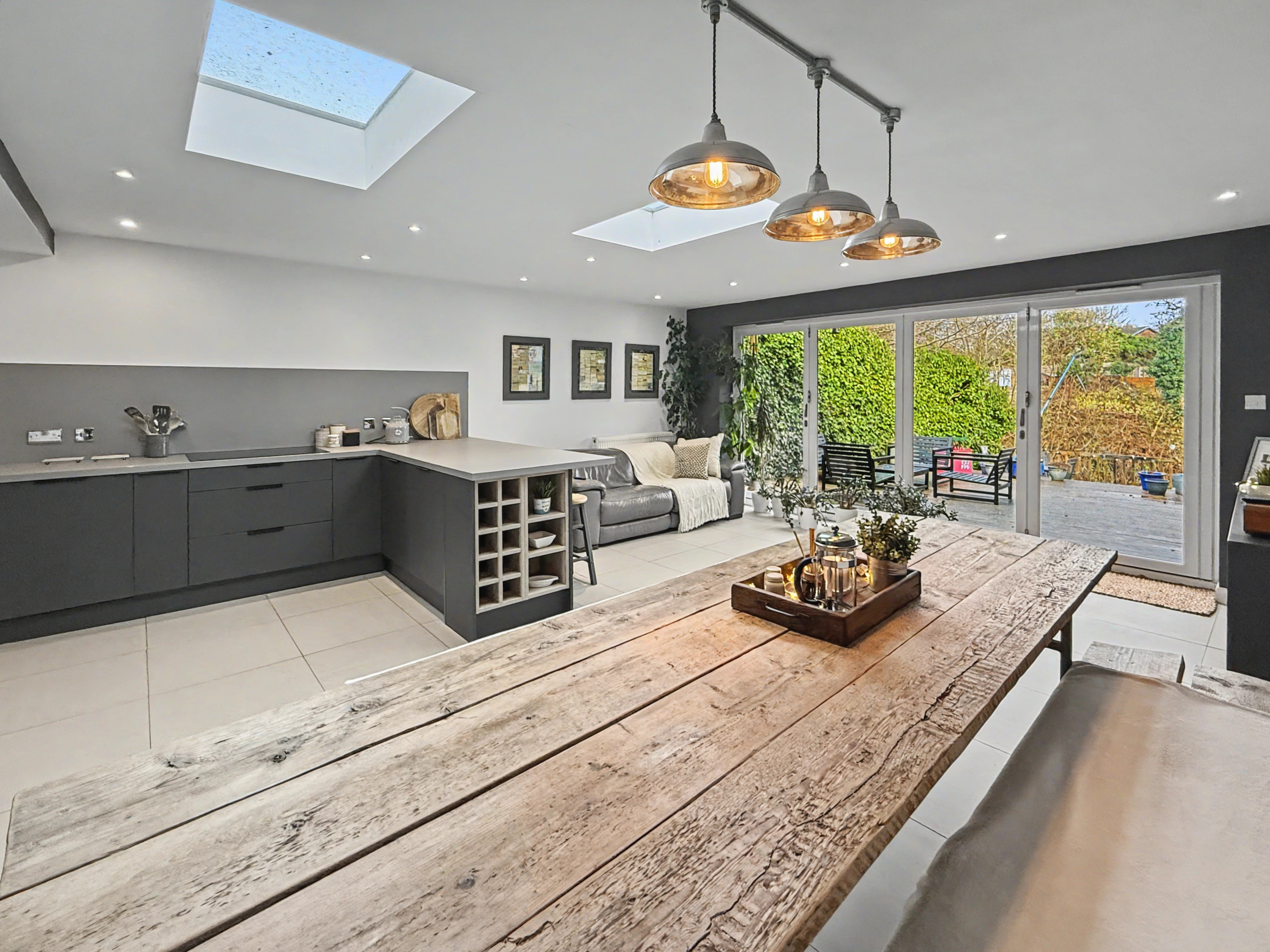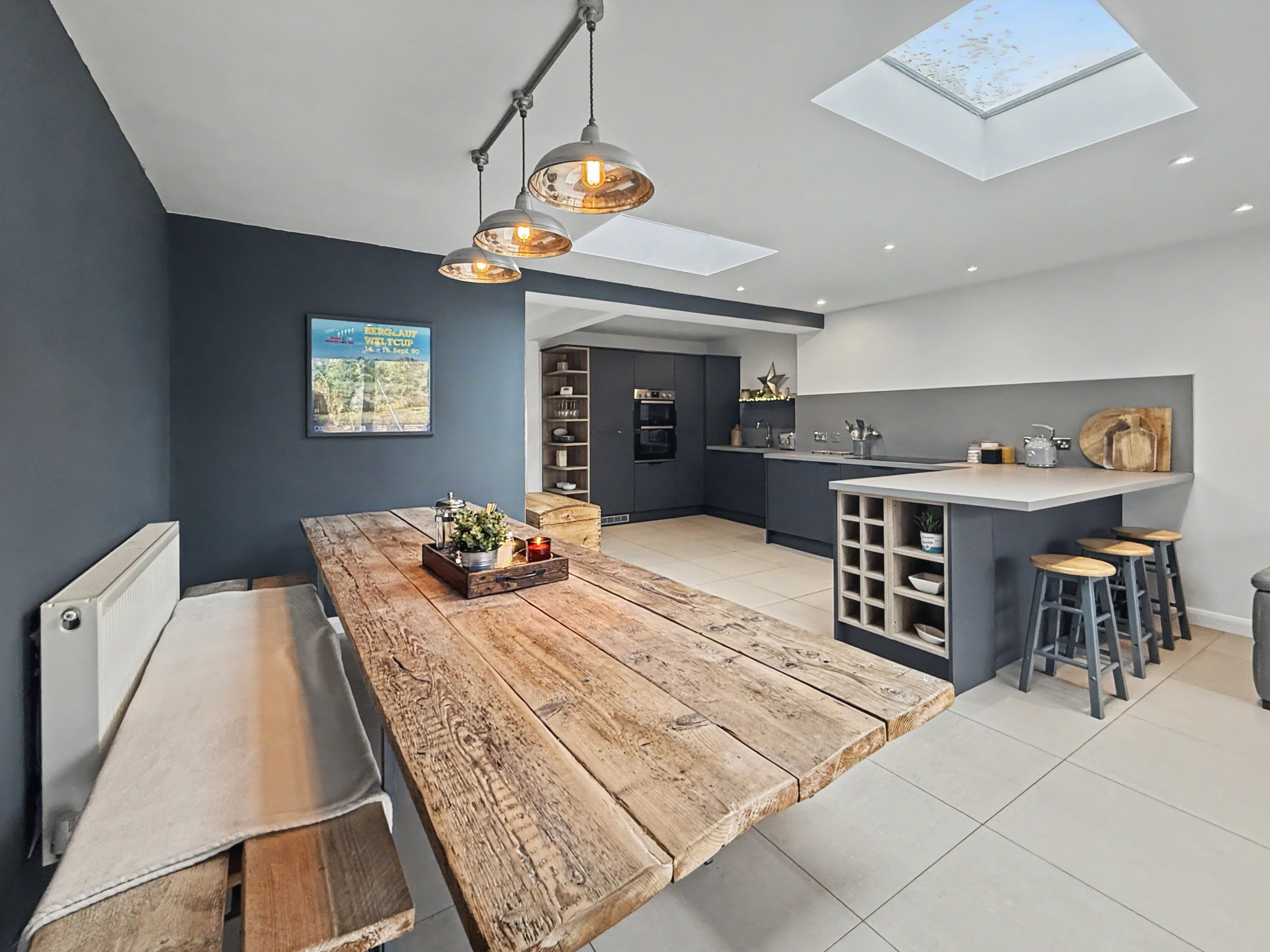 Undoubtedly the centrepiece of this home is the impressive extended kitchen, dining, and family area. Thoughtfully designed with modern living in mind, this expansive space features high-quality finishes, integrated appliances, and ample room for both dining and entertaining. Flooded with natural light from large windows and bi-folding doors, the room enjoys uninterrupted views across the garden and towards the River Roch, while effortlessly connecting indoor and outdoor living.