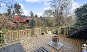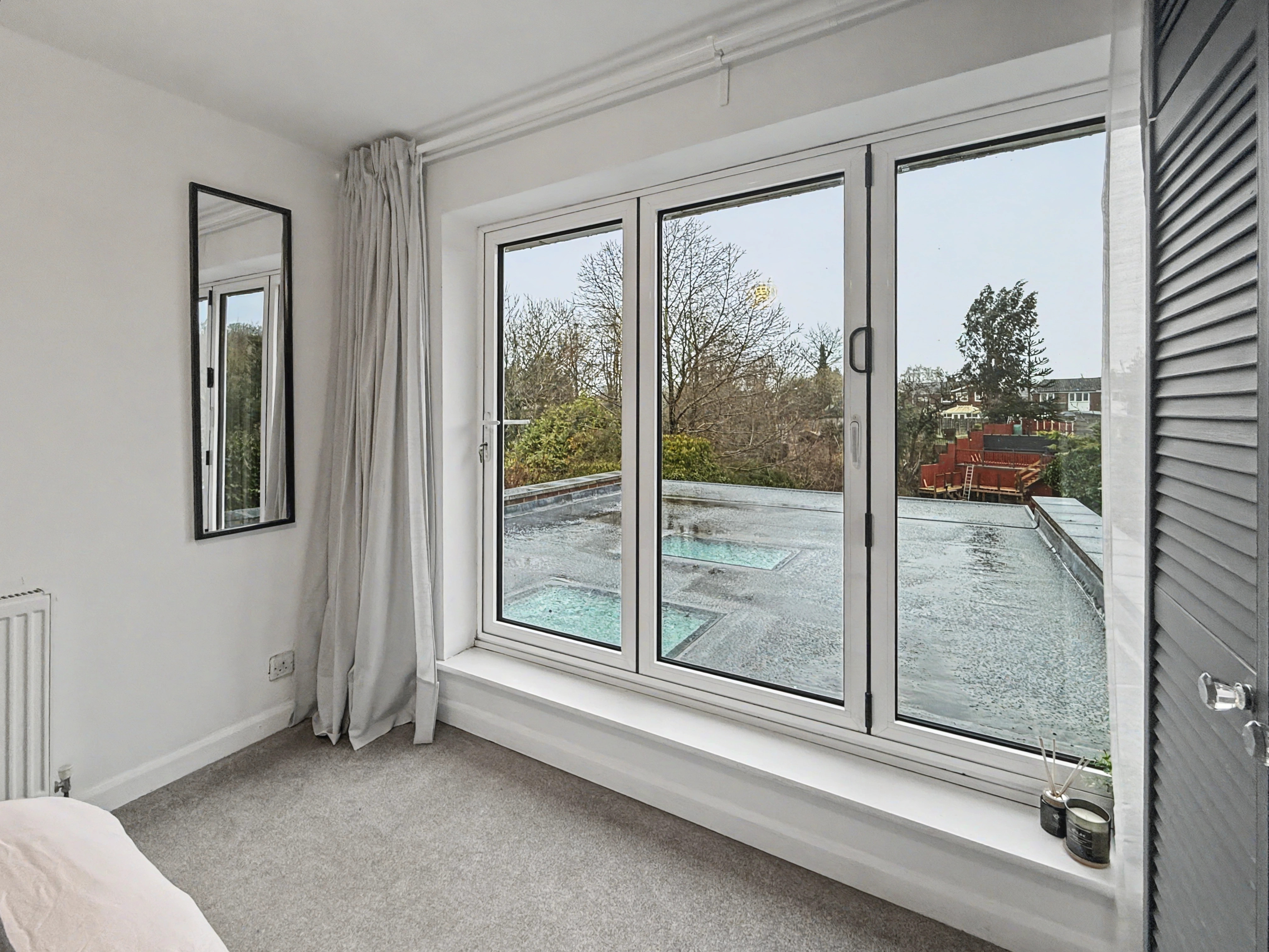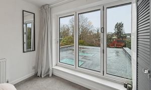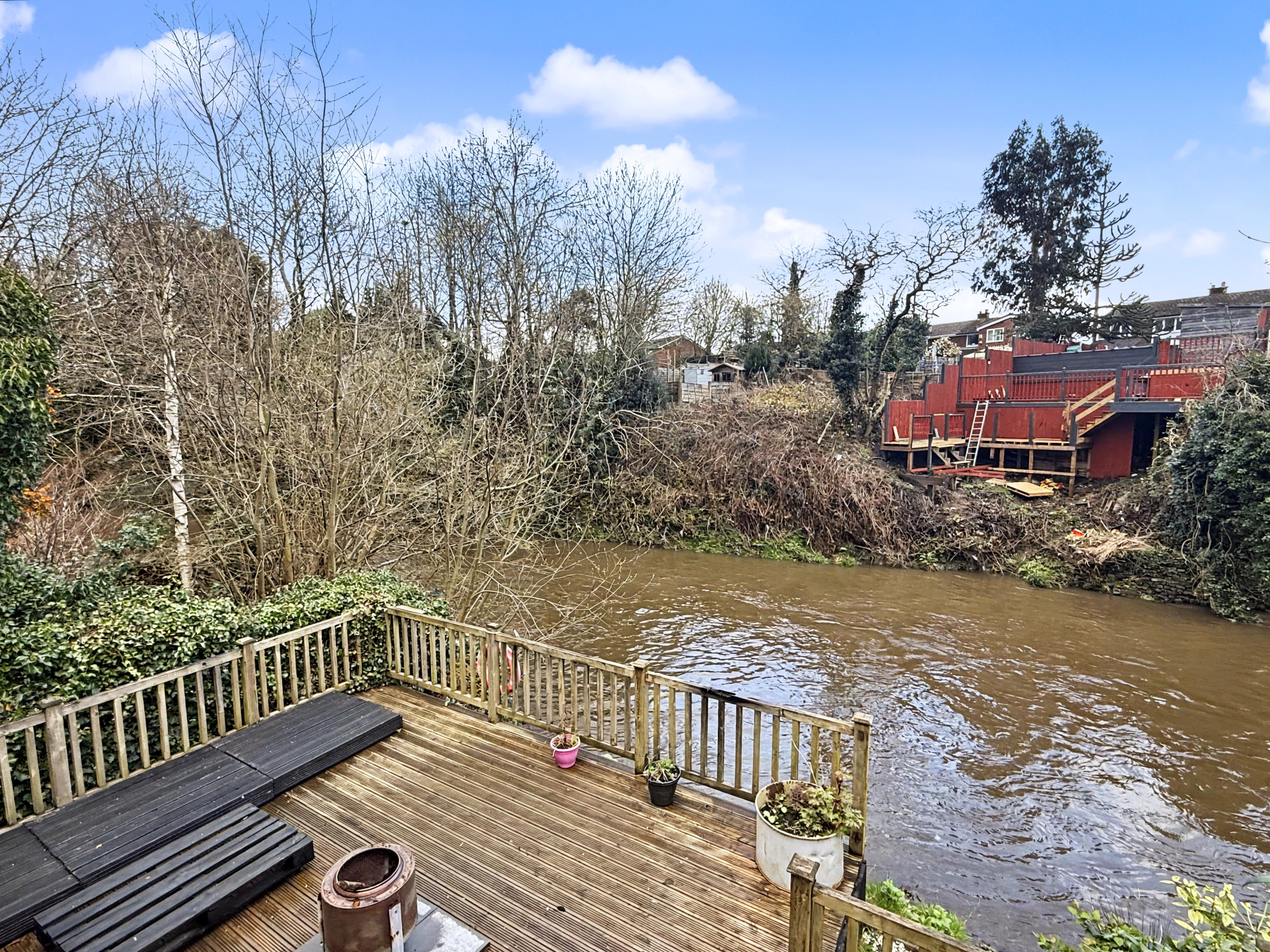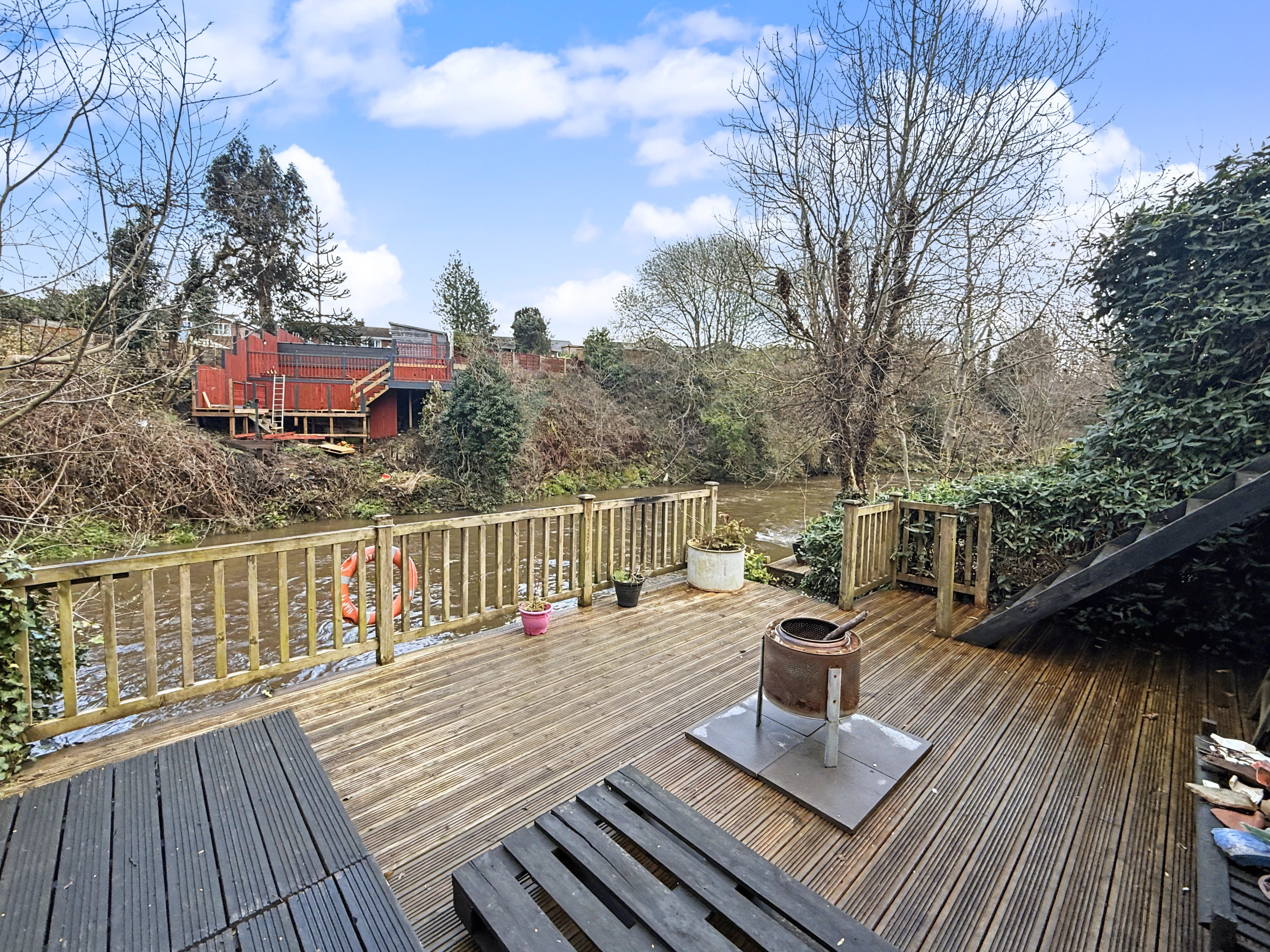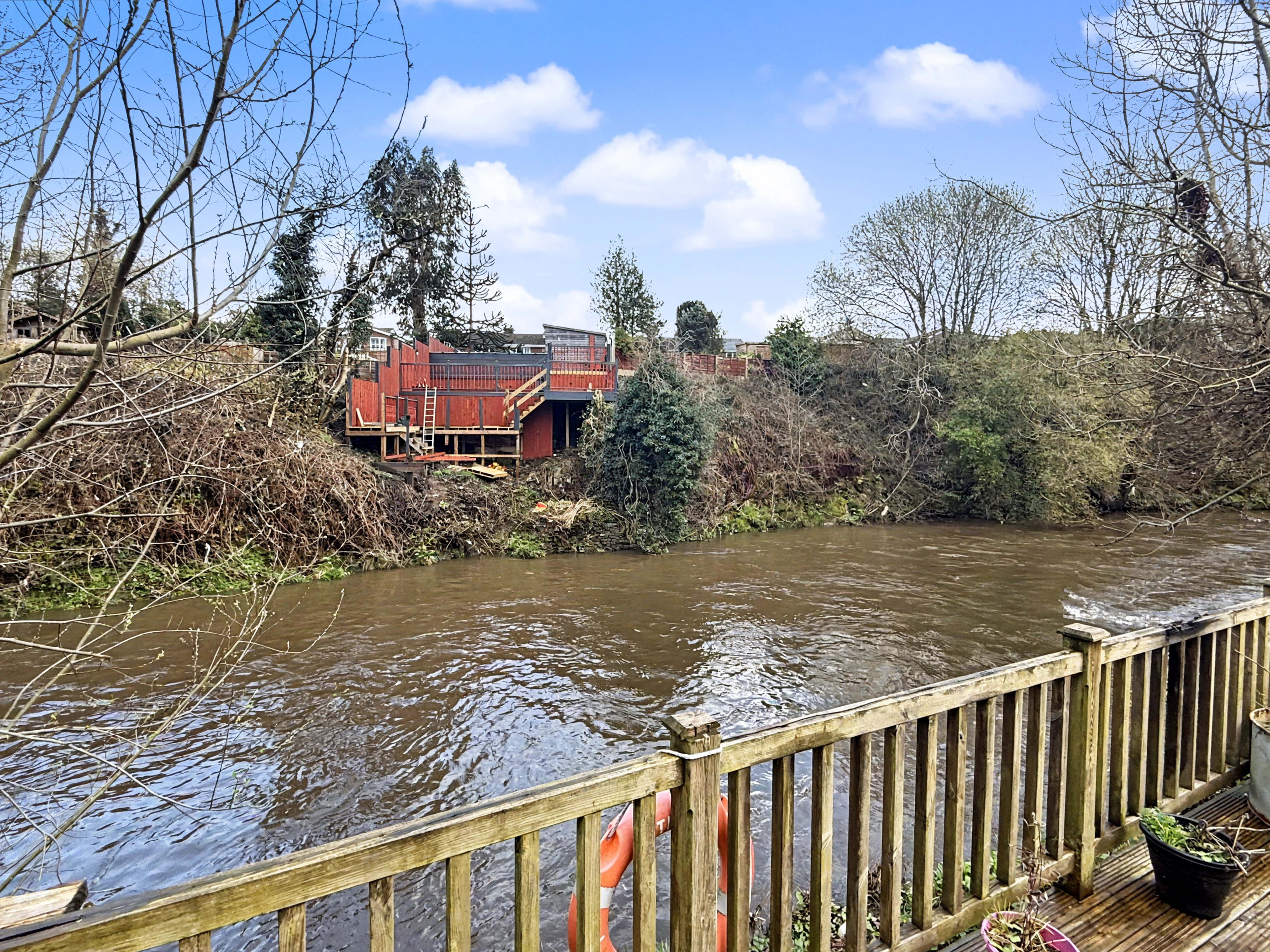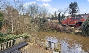 To the first floor, three well-proportioned bedrooms provide comfortable living spaces, each finished with care and attention. The principal bedroom is particularly striking, featuring bi-folding doors that open onto a unique elevated outdoor terrace, positioned above the kitchen extension. This tranquil space offers the perfect spot to enjoy a morning coffee or unwind while taking in the peaceful riverside outlook.