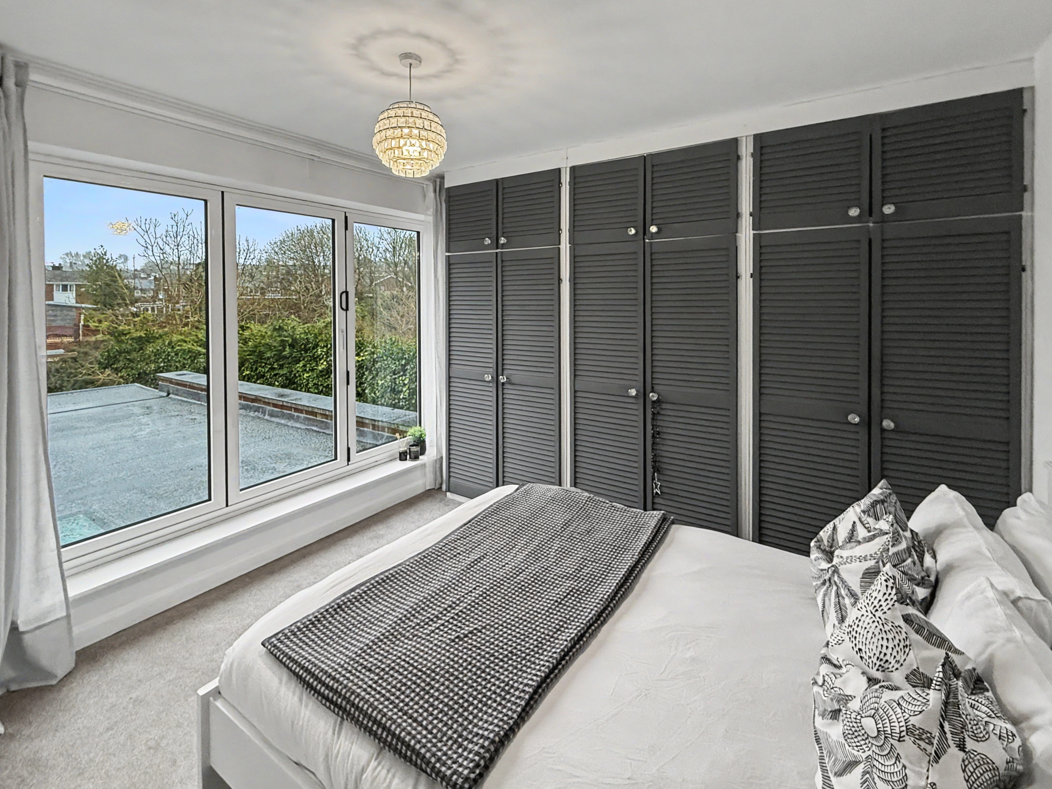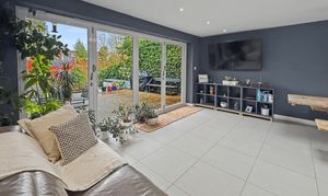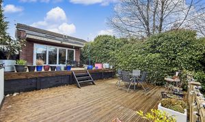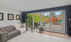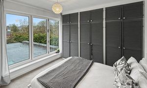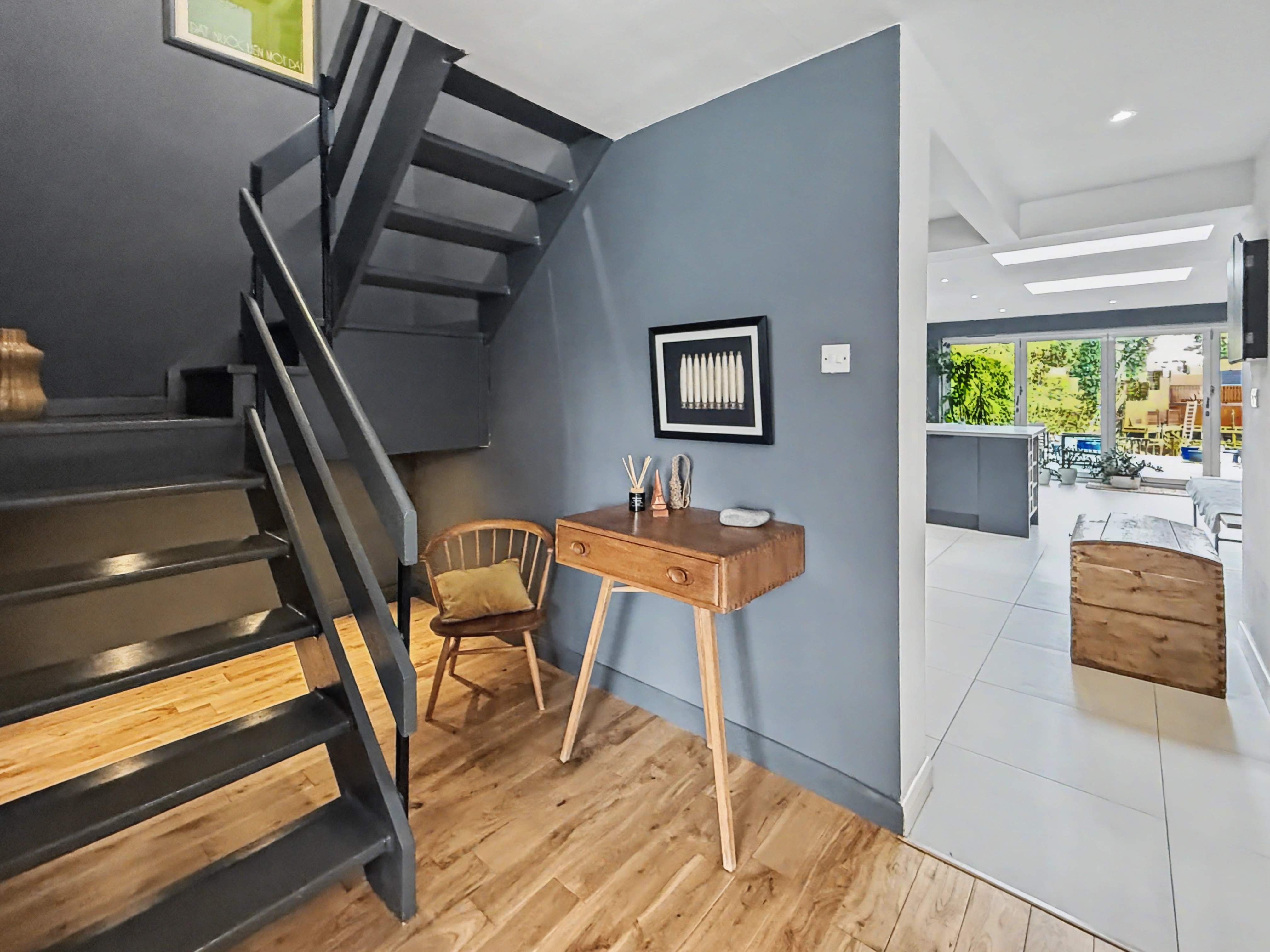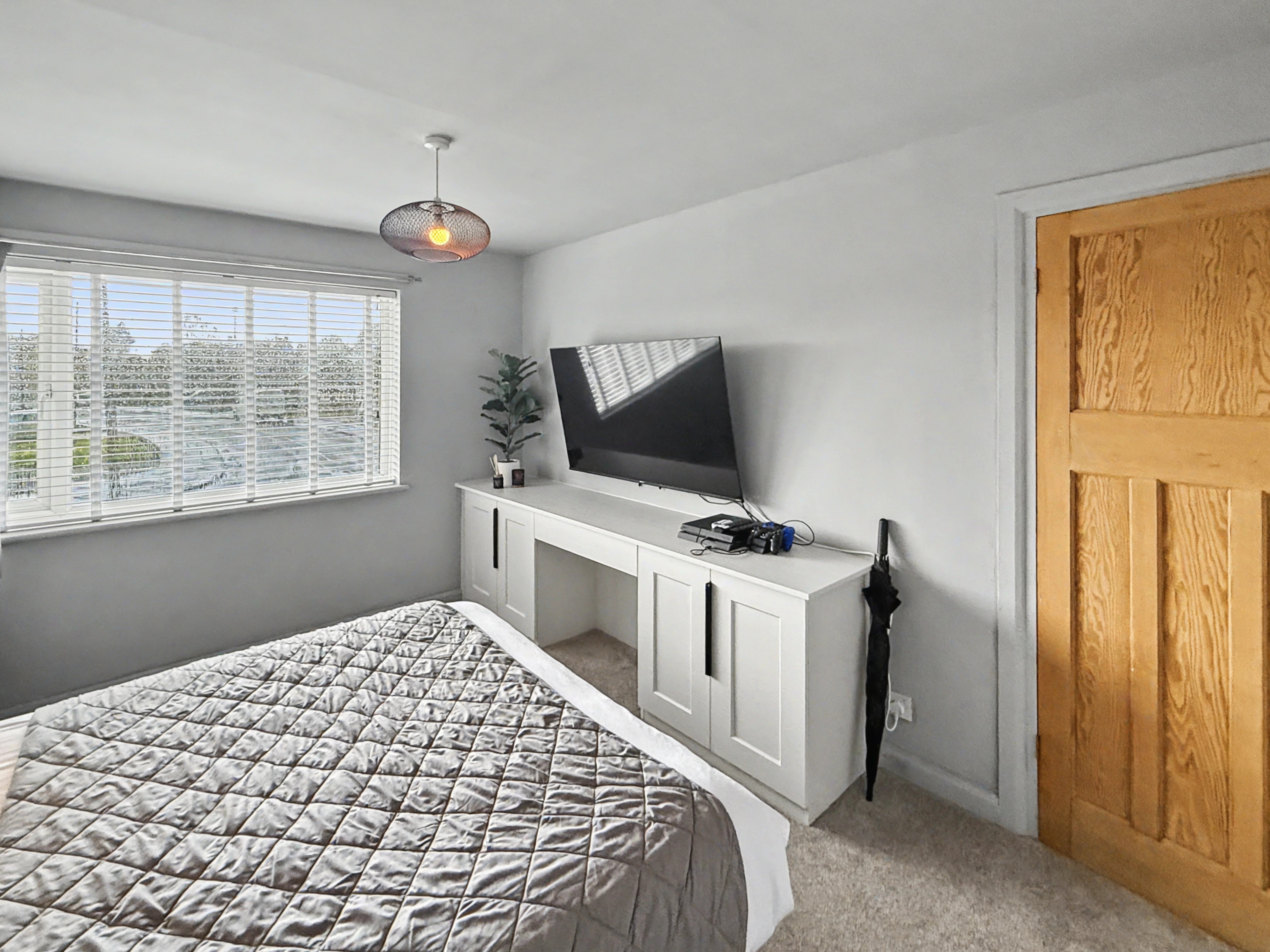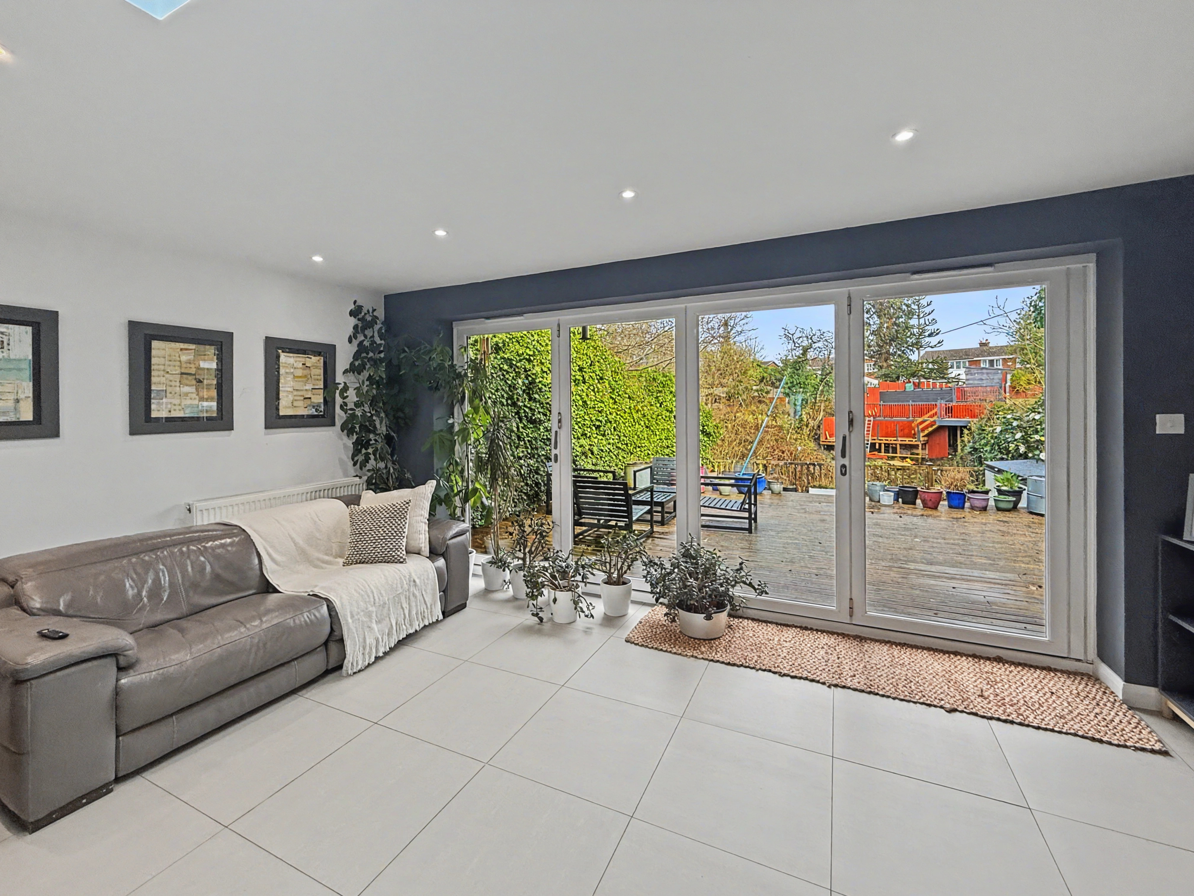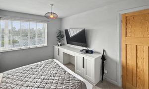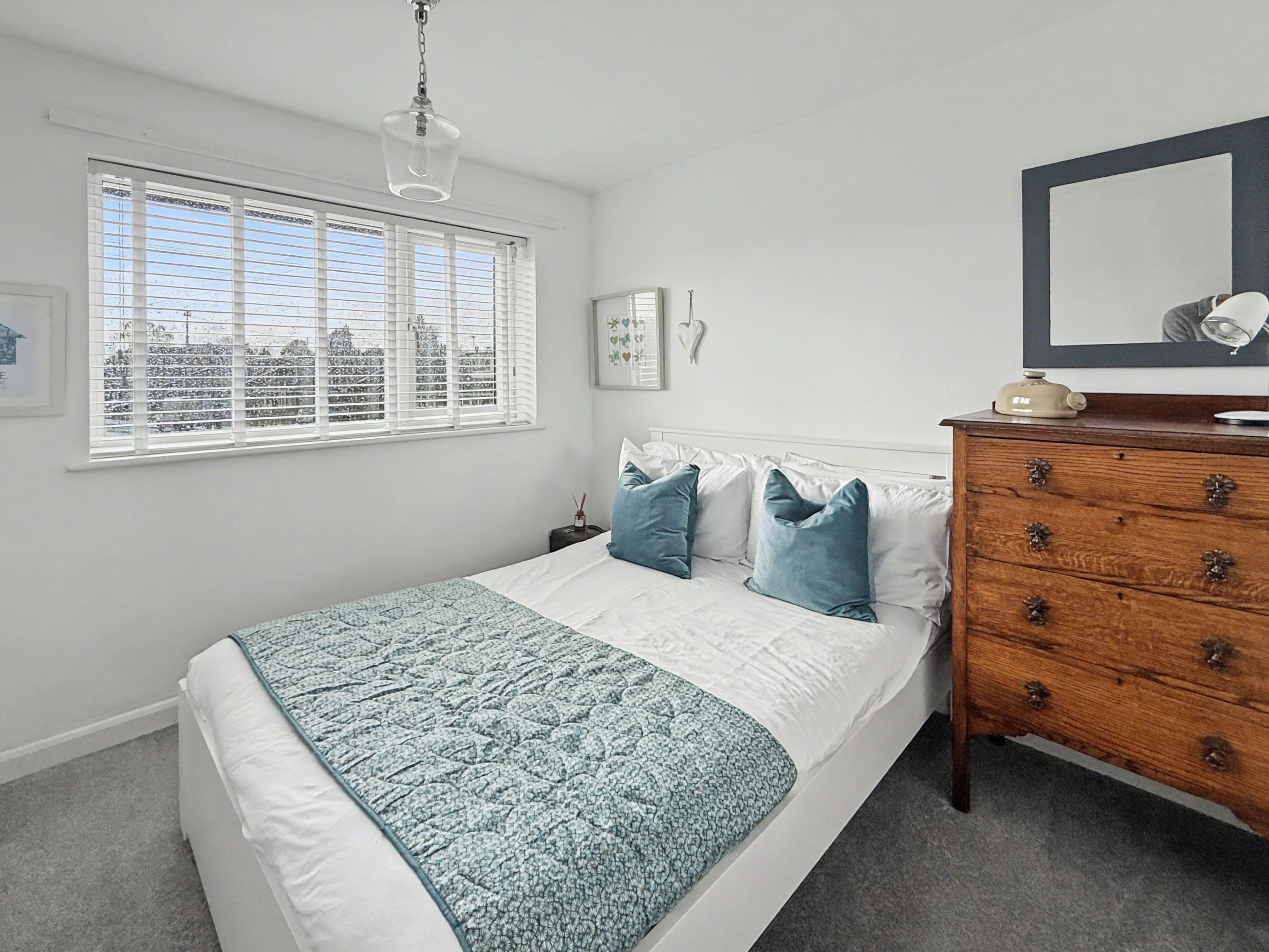 To the first floor, three well-proportioned bedrooms provide comfortable living spaces, each finished with care and attention. The principal bedroom is particularly striking, featuring bi-folding doors that open onto a unique elevated outdoor terrace, positioned above the kitchen extension. This tranquil space offers the perfect spot to enjoy a morning coffee or unwind while taking in the peaceful riverside outlook.