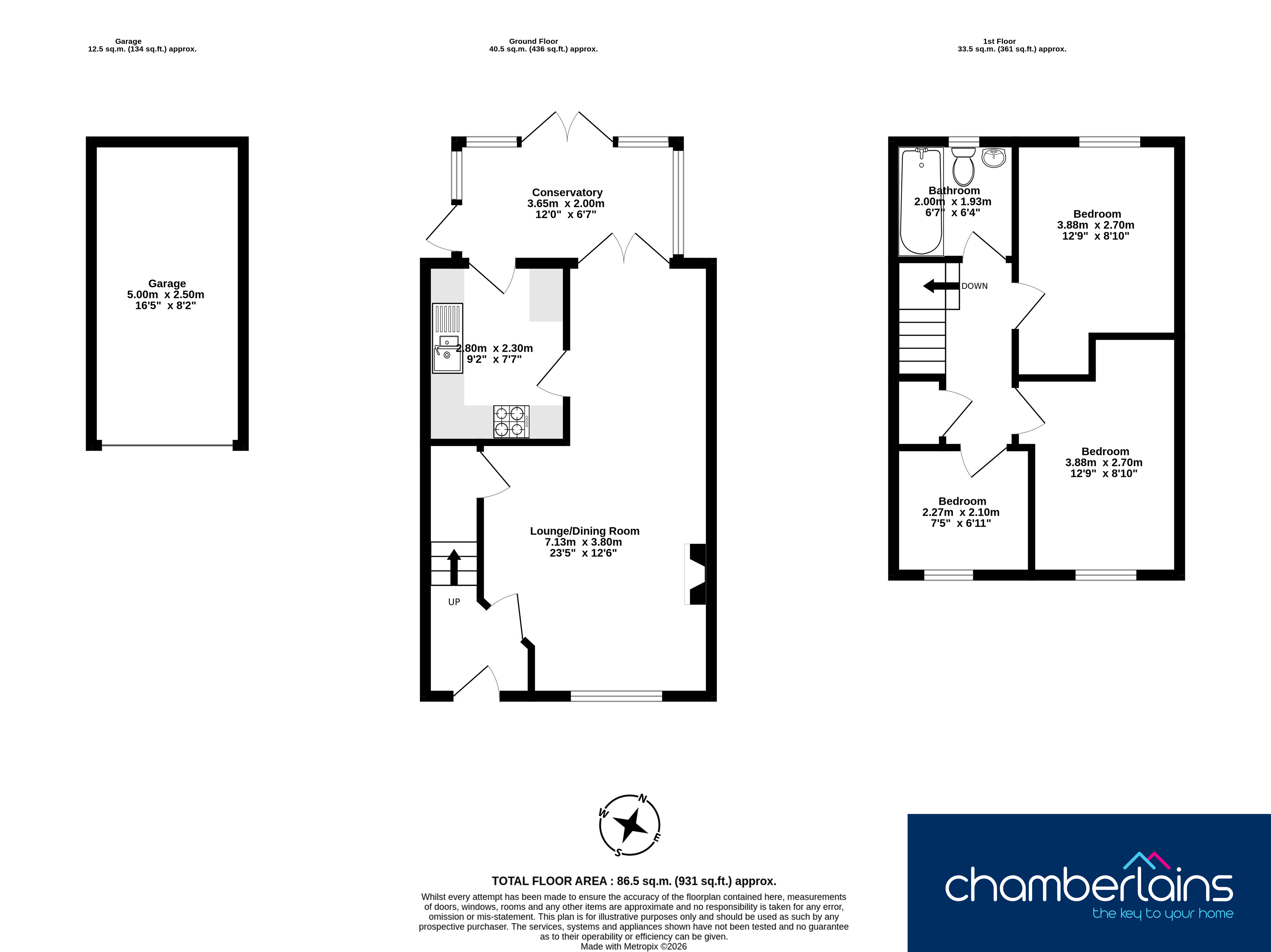 MEASUREMENTS: Lounge/Dining Room 23’5” x 12’6” (7.13m x 3.80m), Kitchen 9’2” x 7’7” (2.80m x 2.30m), Conservatory 12’0” x 6’7” (3.65m x 2,00), Bathroom 6’7” x 6’4” (2.00m x 1.93m), Bedroom 12’9” x 8’10” (3.88m x 2,70m), Bedroom 12’9” x 8’10” (3.88m x 2.70m), Bedroom 7’5” x 6’11” (2.27m x 2.10m), Garage 16’5” x 8’2” (5.00m x 2.50m)