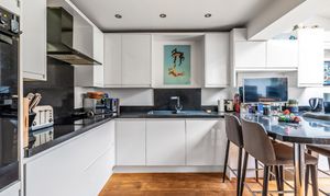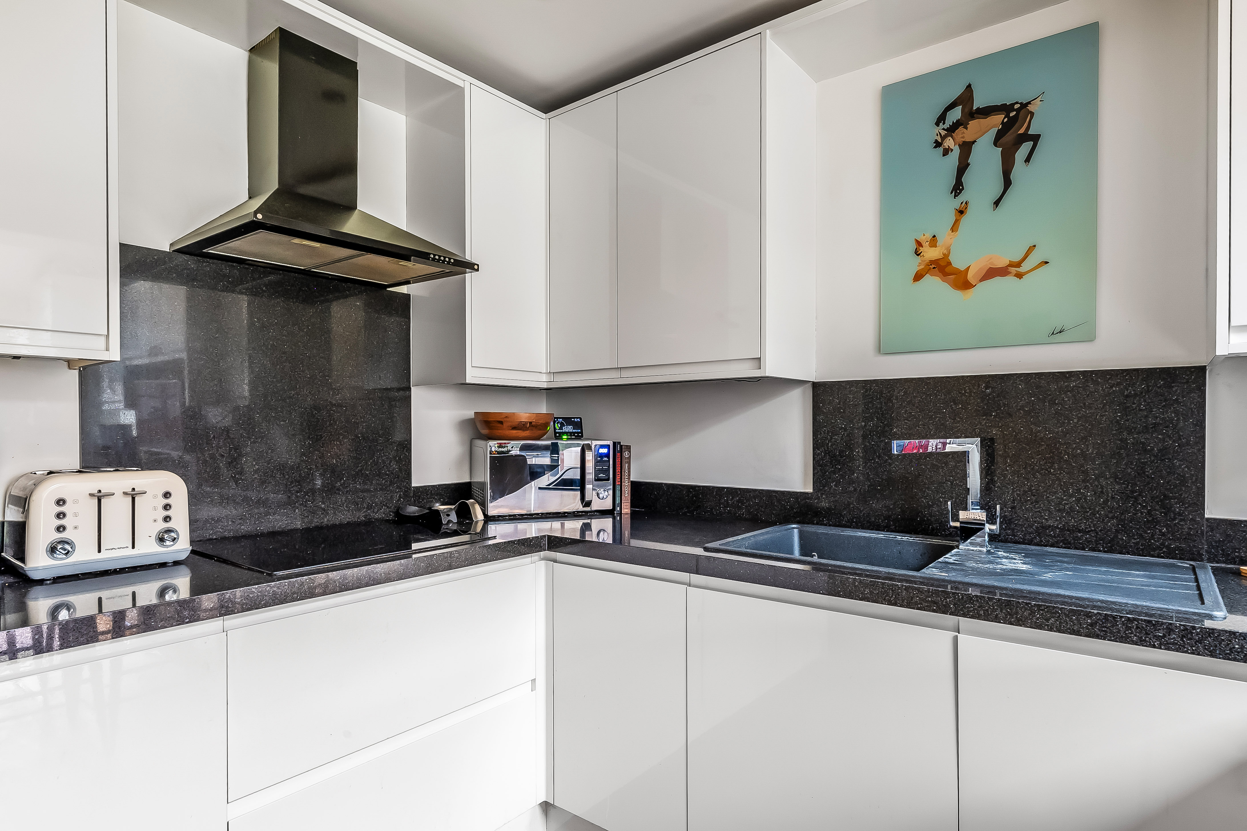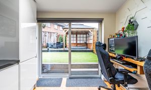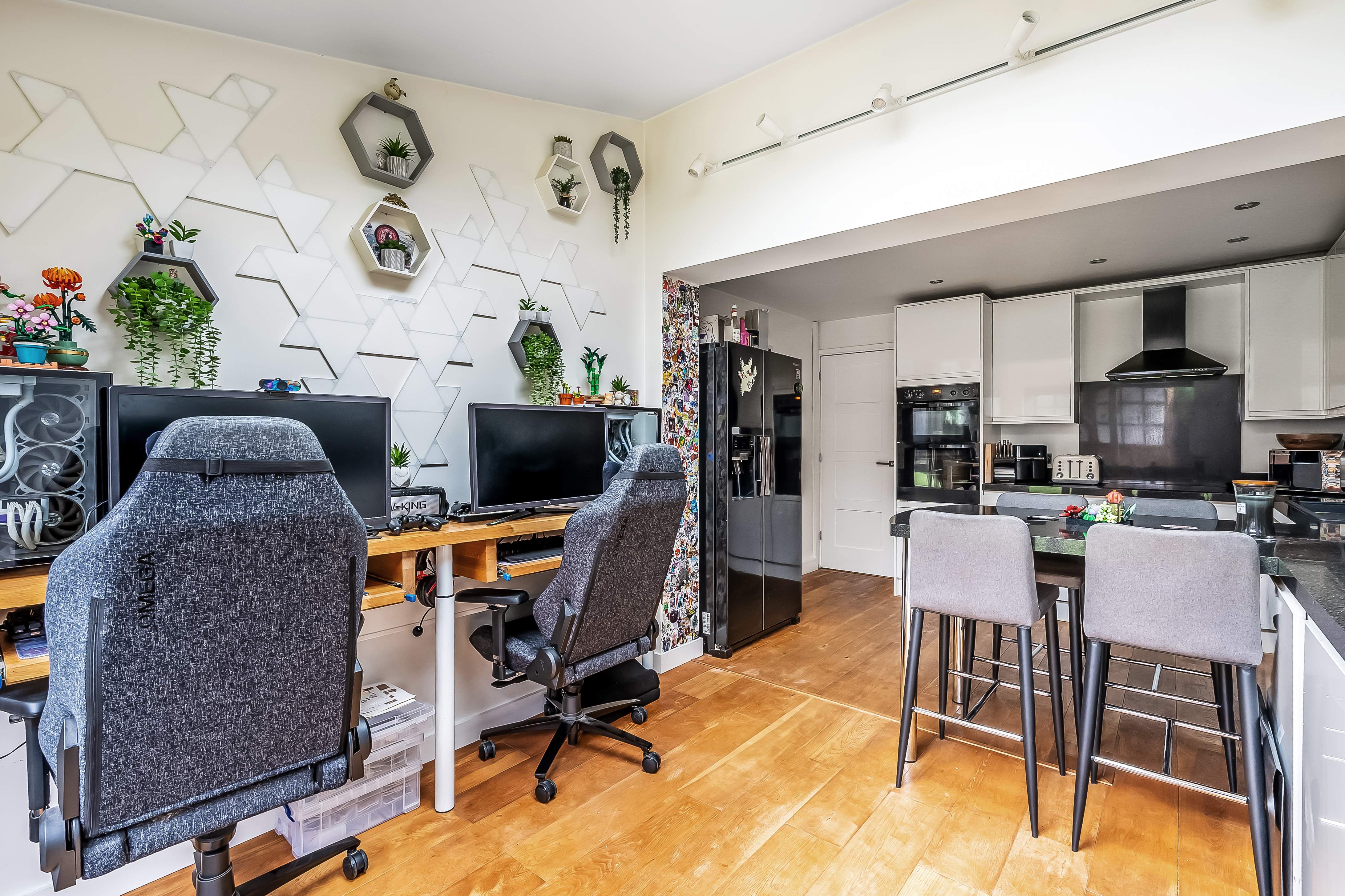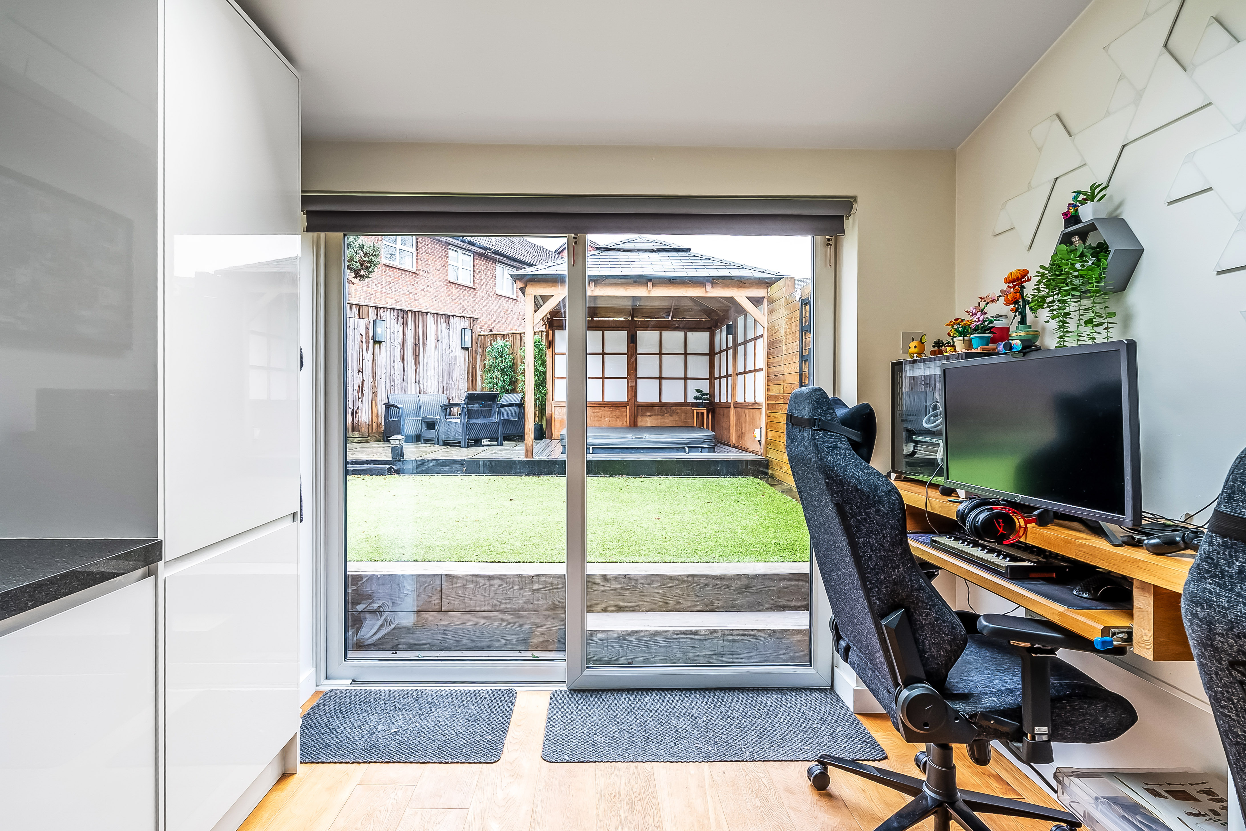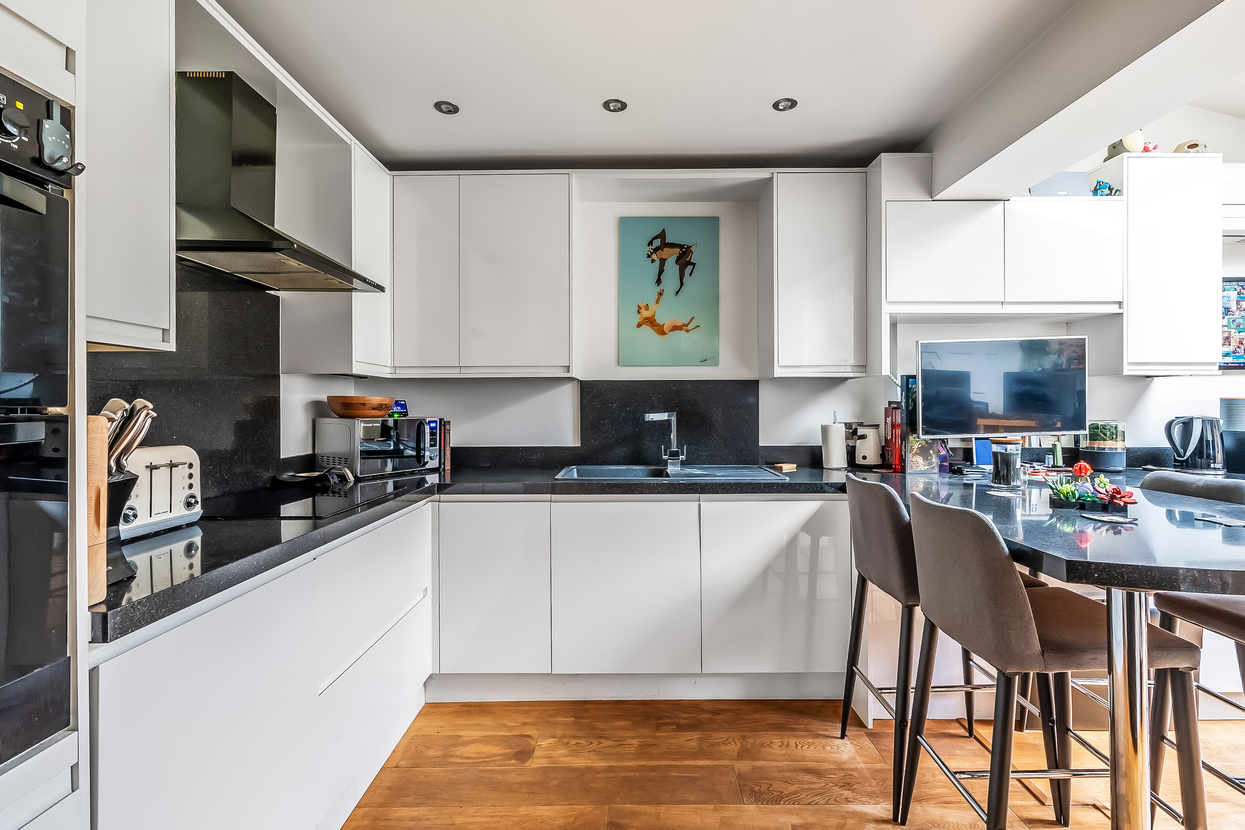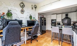 The kitchen dining room has been extended by the current owners and is a bright, spacious room designed for everyday living and entertaining. A Velux roof window and sliding patio doors flood the space with natural light and provide direct access to the garden. The kitchen is fitted with sleek gloss white units complemented by a granite effect black worktop, incorporating a breakfast bar and sink with side drainer. Integrated appliances include a double oven, ceramic hob with extractor, dishwasher and washing machine, with space for an American style fridge freezer. The dining area enjoys a part vaulted ceiling, feature lighting, wood flooring and air conditioning, creating a relaxed yet sociable environment.