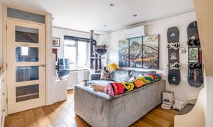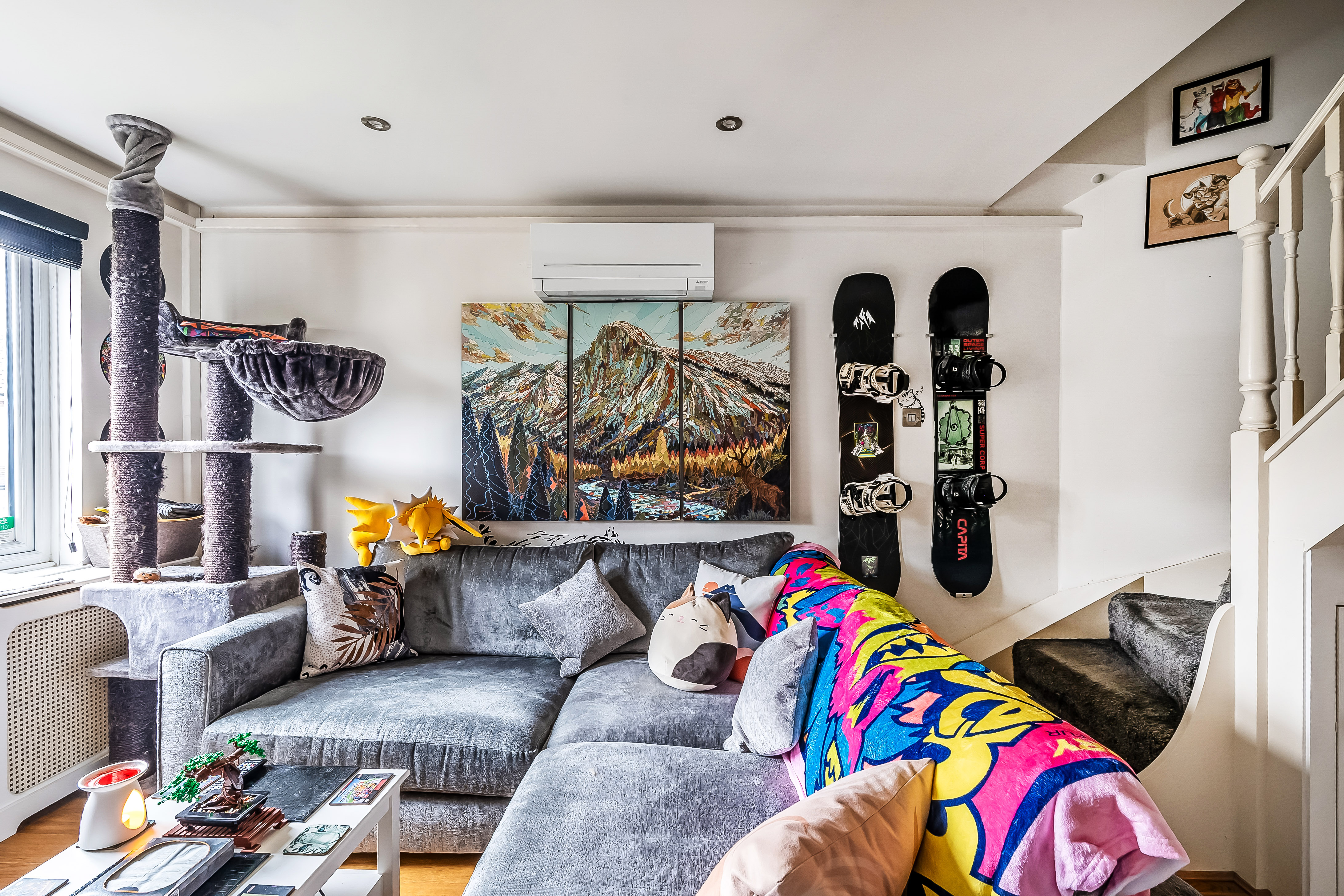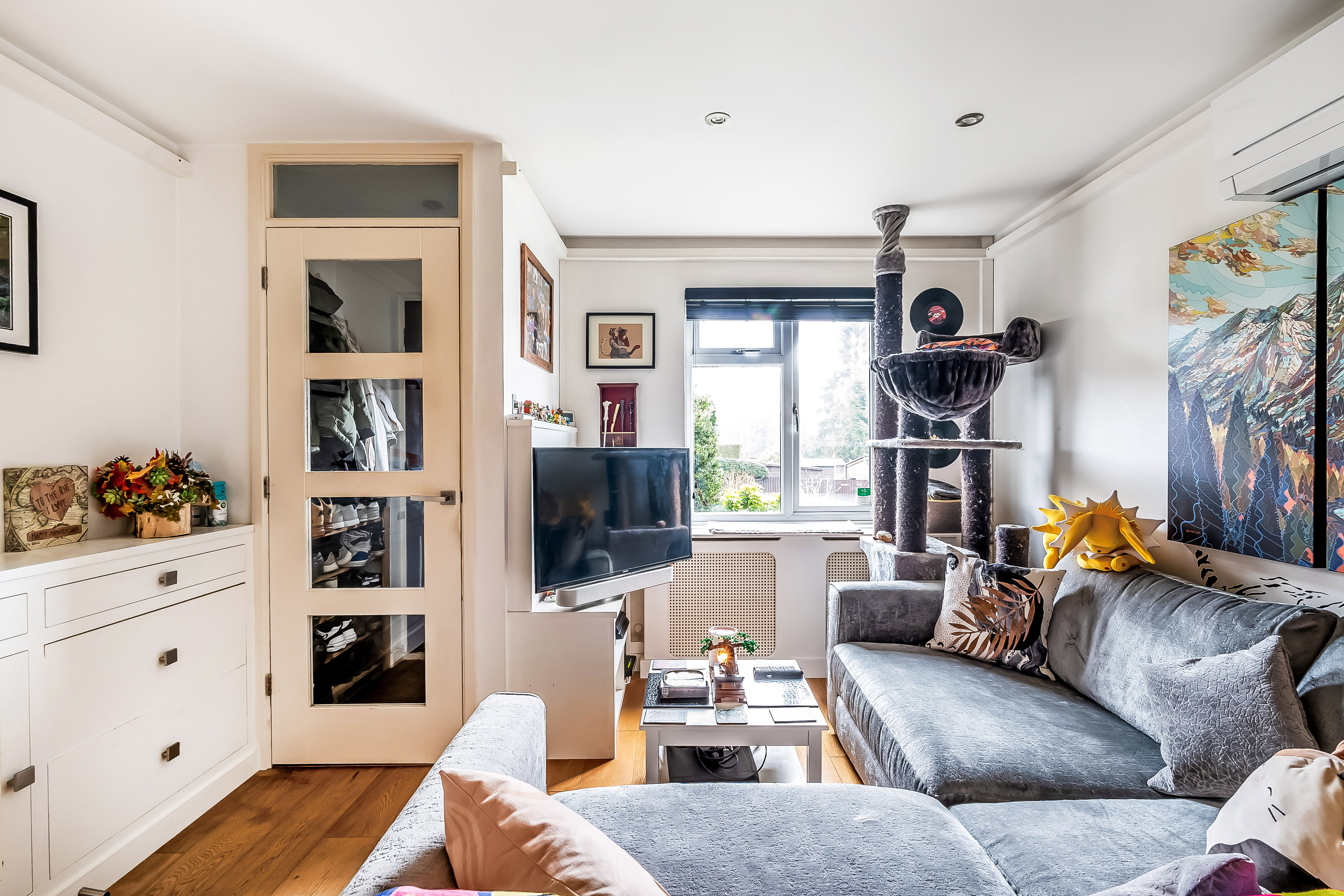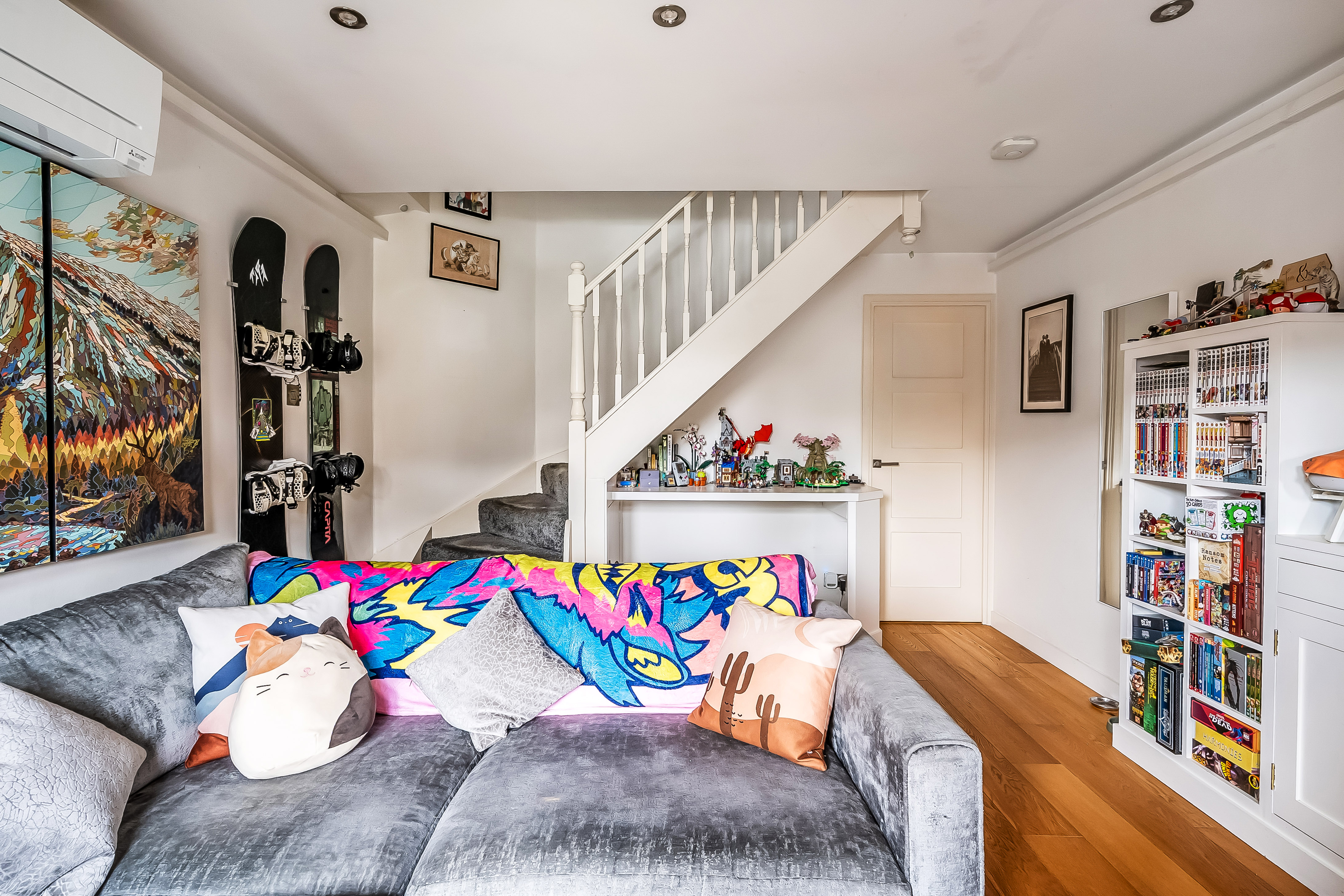 The front door opens into an entrance porch which leads through to a generous sitting room, a welcoming space with a front aspect window, warm wood flooring, bespoke fitted shelving and discreet storage. Carefully placed downlighters enhance the feel, while an air conditioning unit ensures comfort throughout the seasons. Stairs rise to the first floor and a door opens into the heart of the home.