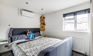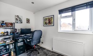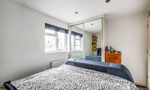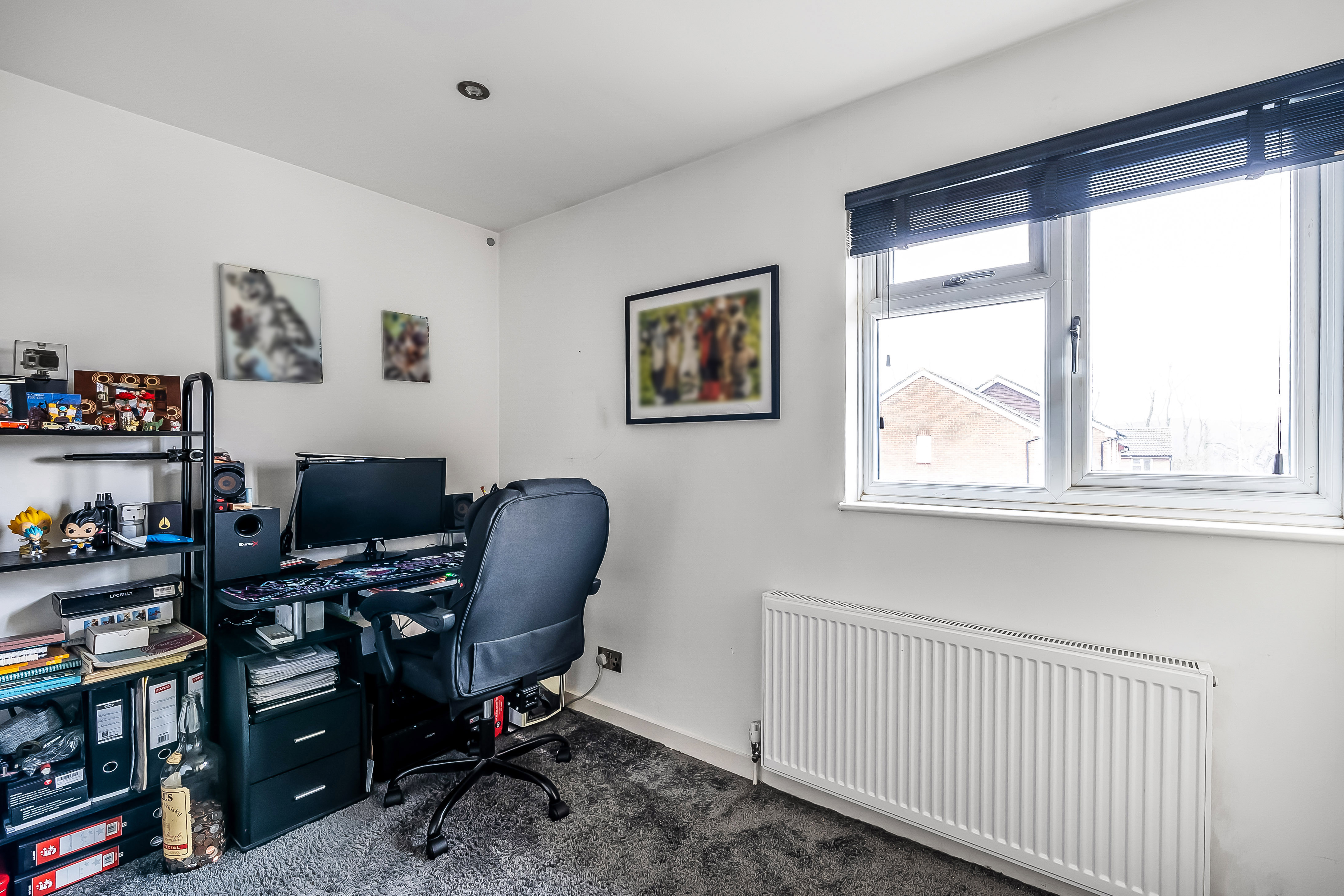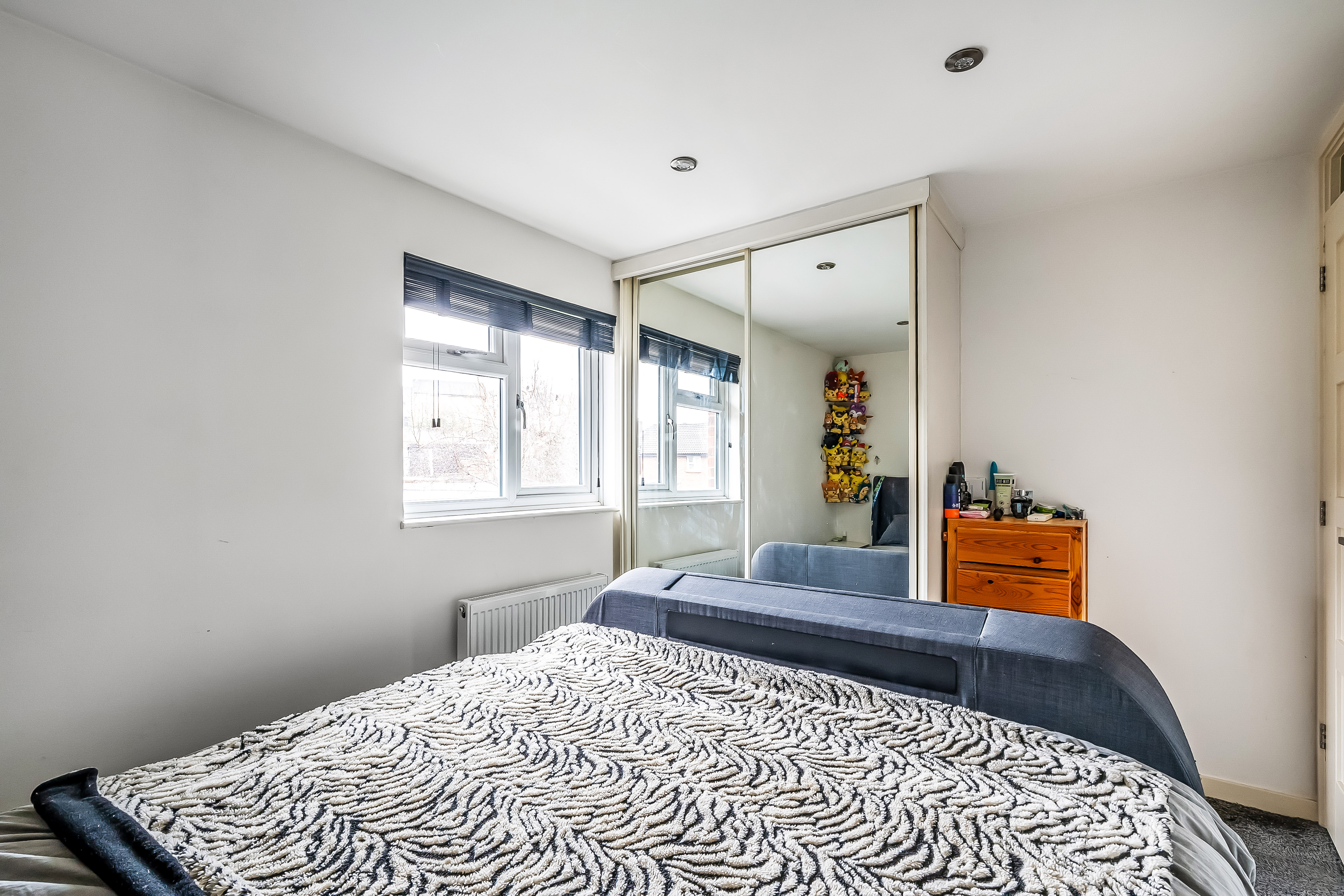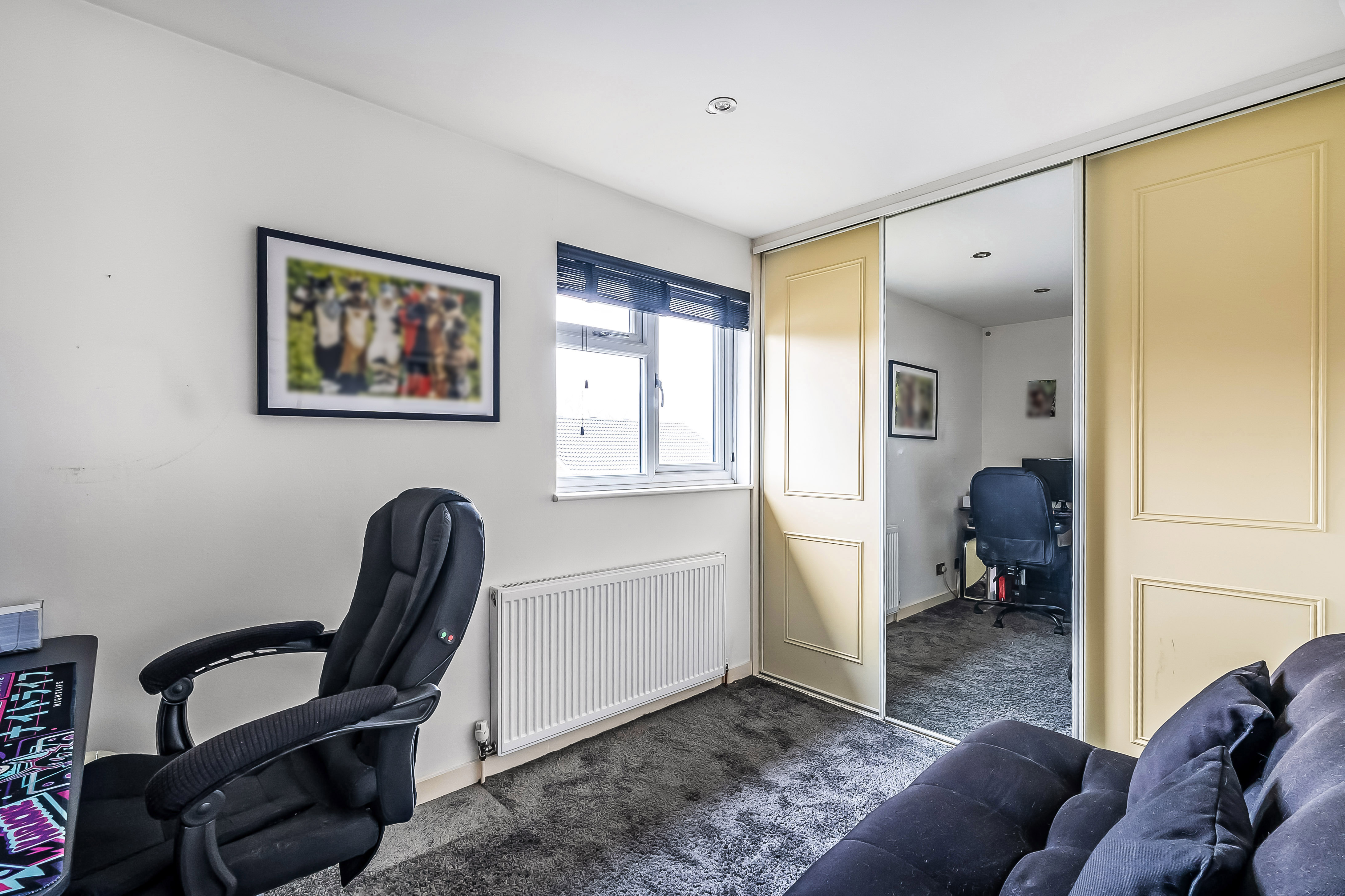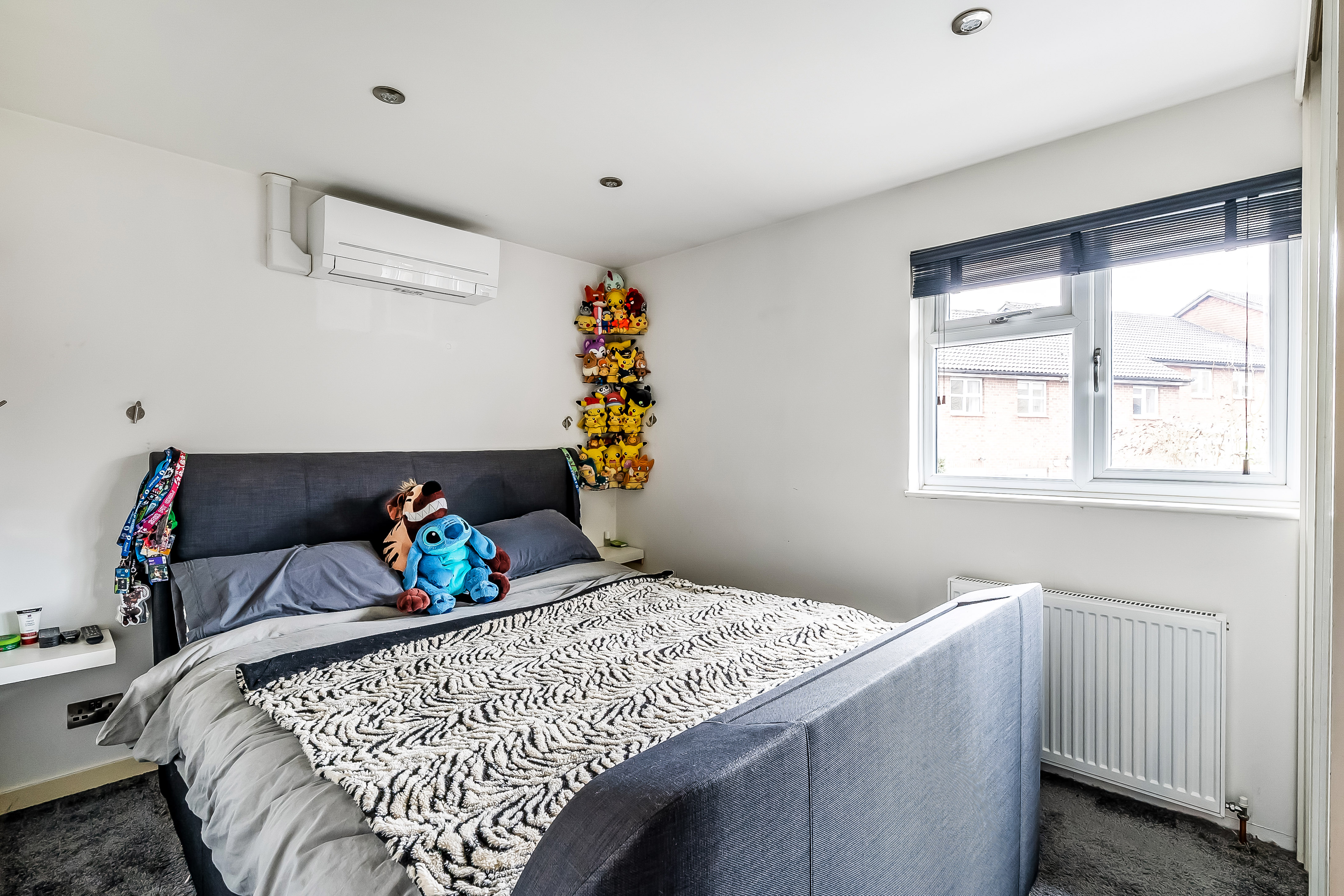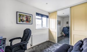On the first floor are two well-proportioned bedrooms. The principal bedroom is positioned to the rear, overlooking the garden, and benefits from a mirror fronted double wardrobe, fitted carpet, downlighters and air conditioning. Bedroom two is currently arranged as a home office with sofa bed, featuring a fitted wardrobe unit to one wall, downlighting and fitted carpet, making it a flexible space to suit a range of needs.