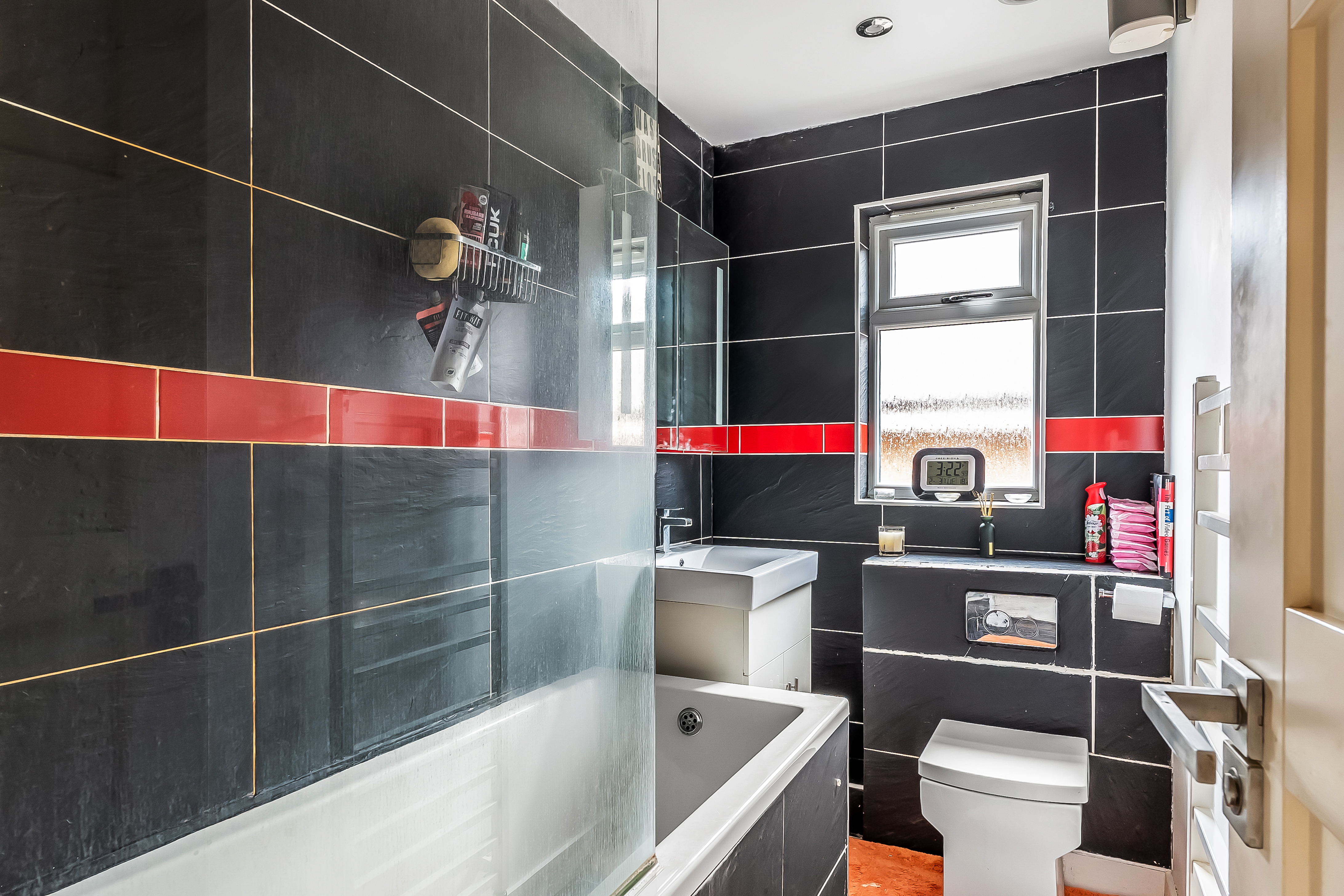 The bathroom is finished with a modern white suite including a concealed flush WC, vanity unit sink, bath with glass shower screen and shower over. An obscure glazed window provides natural light, complemented by a heated towel rail and ceiling downlighters.