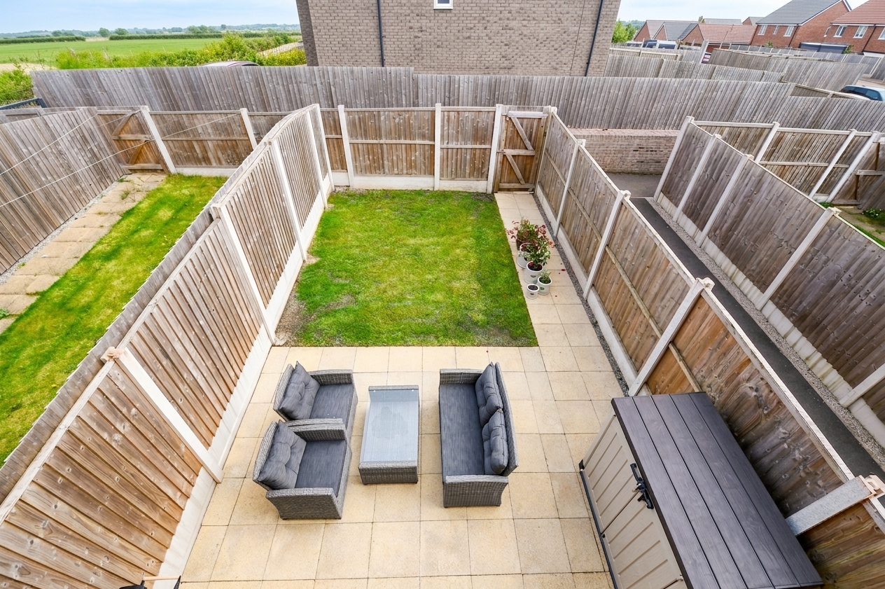 - Low maintenance rear garden complete with paving and laid-to-lawn grass