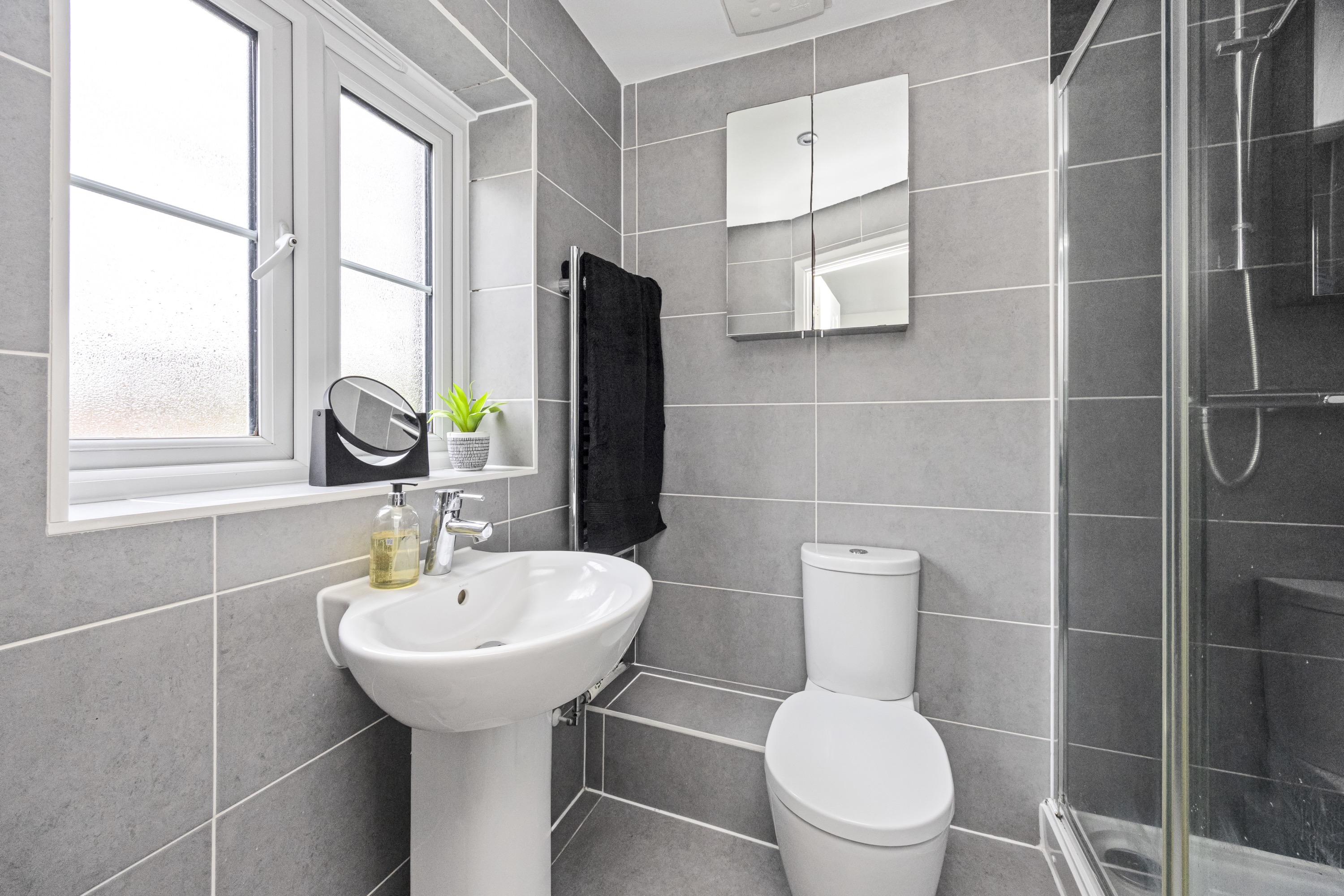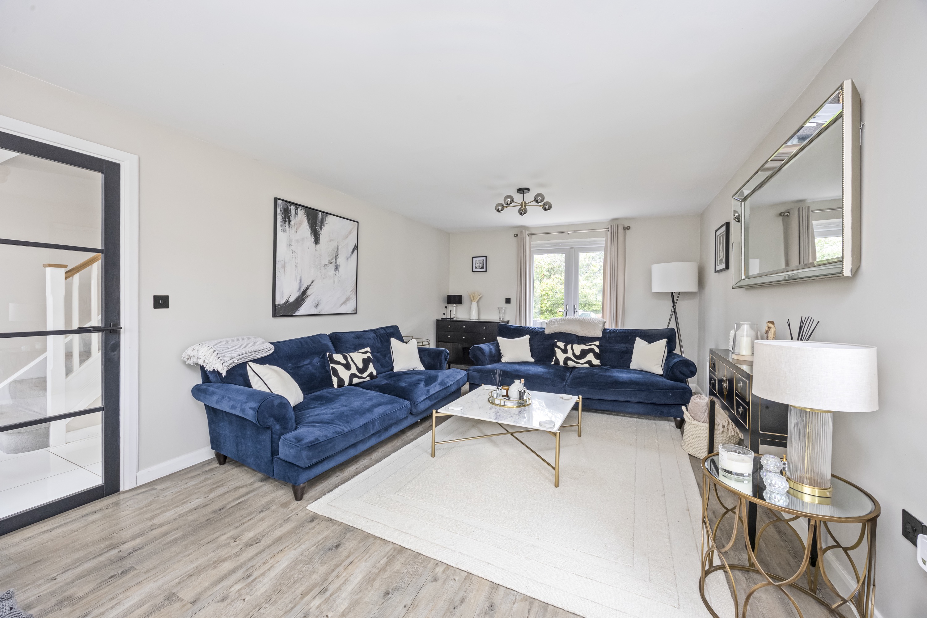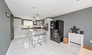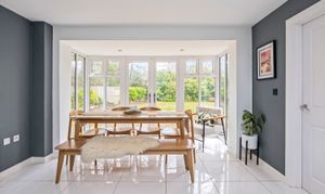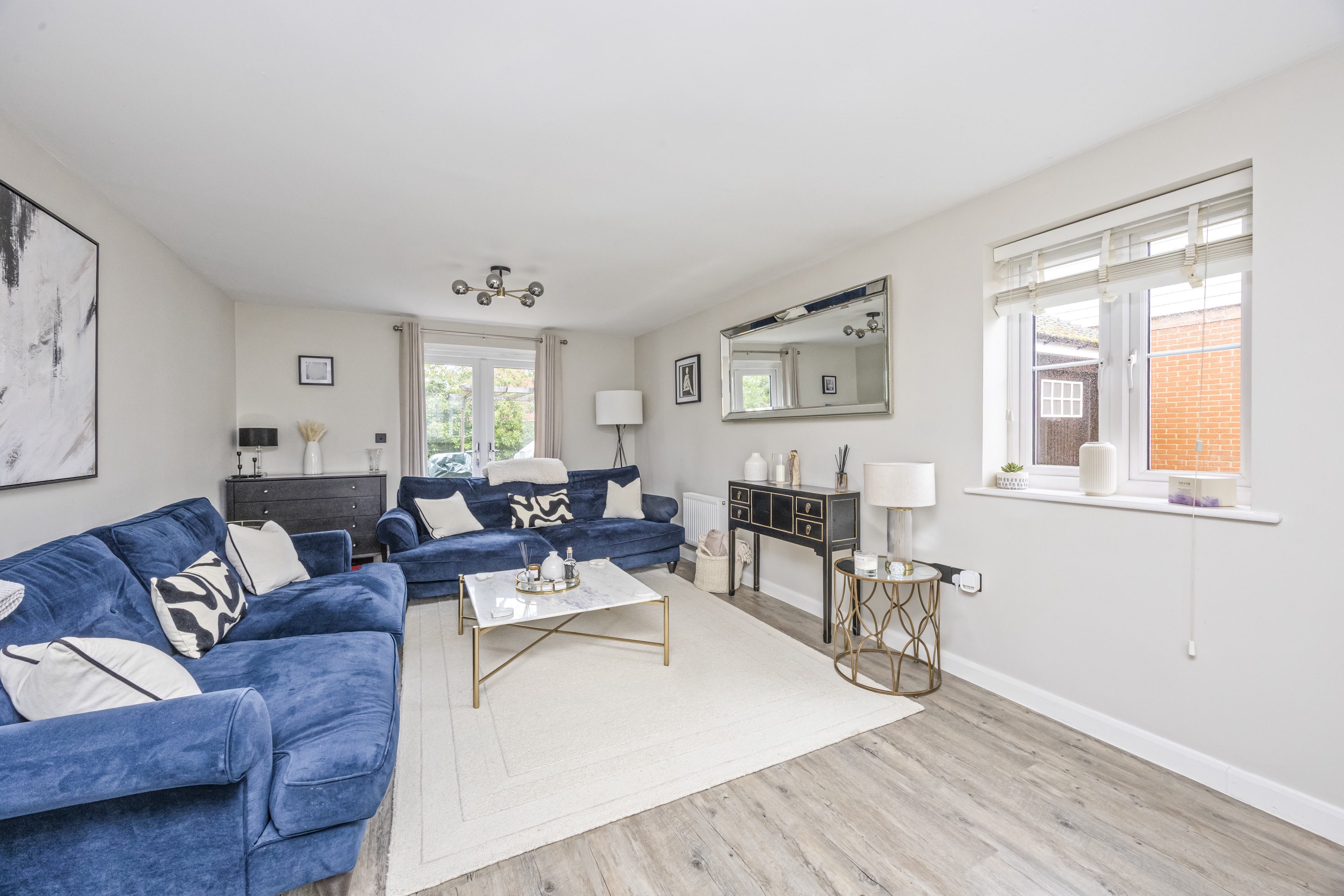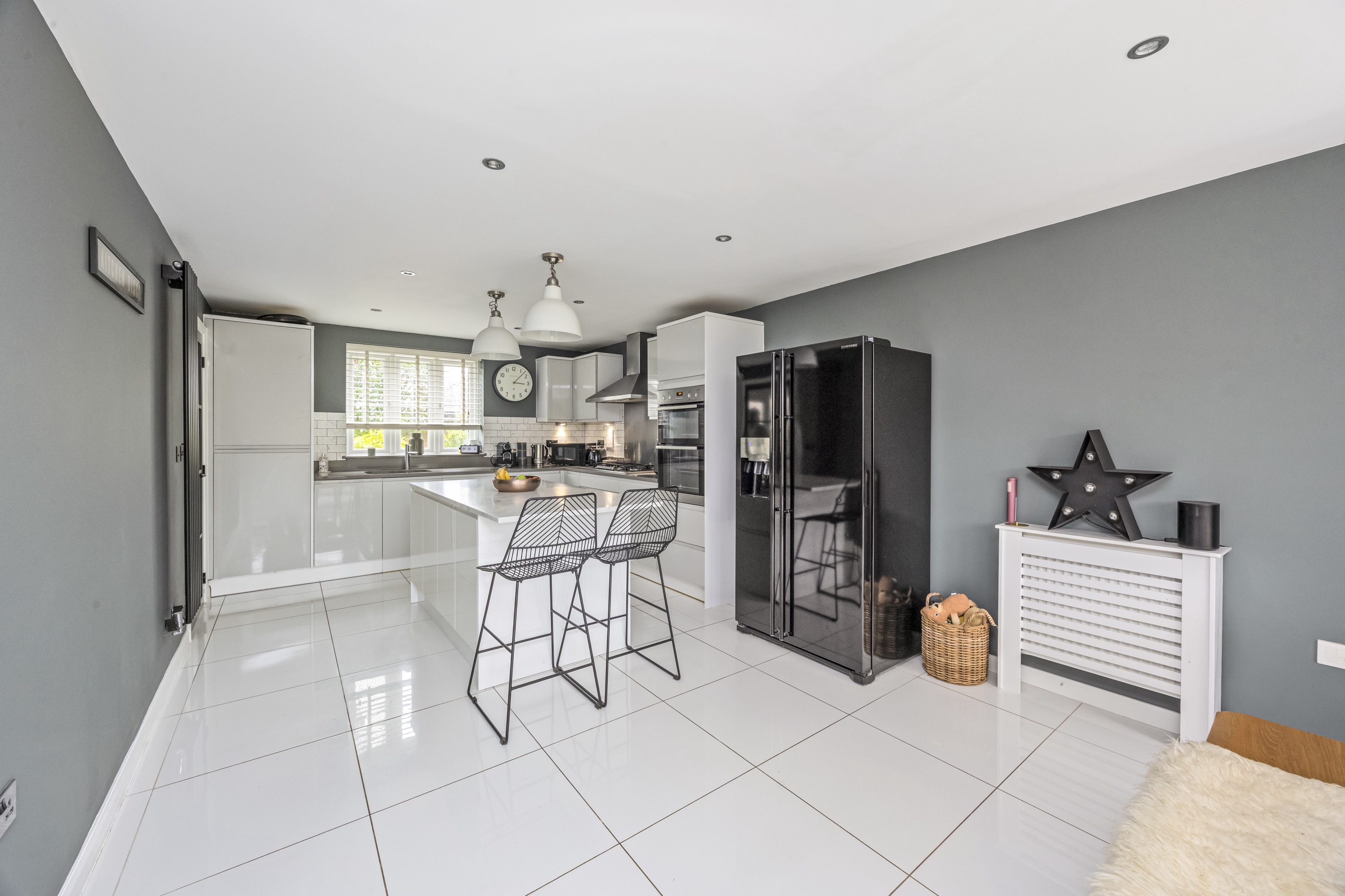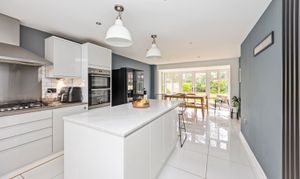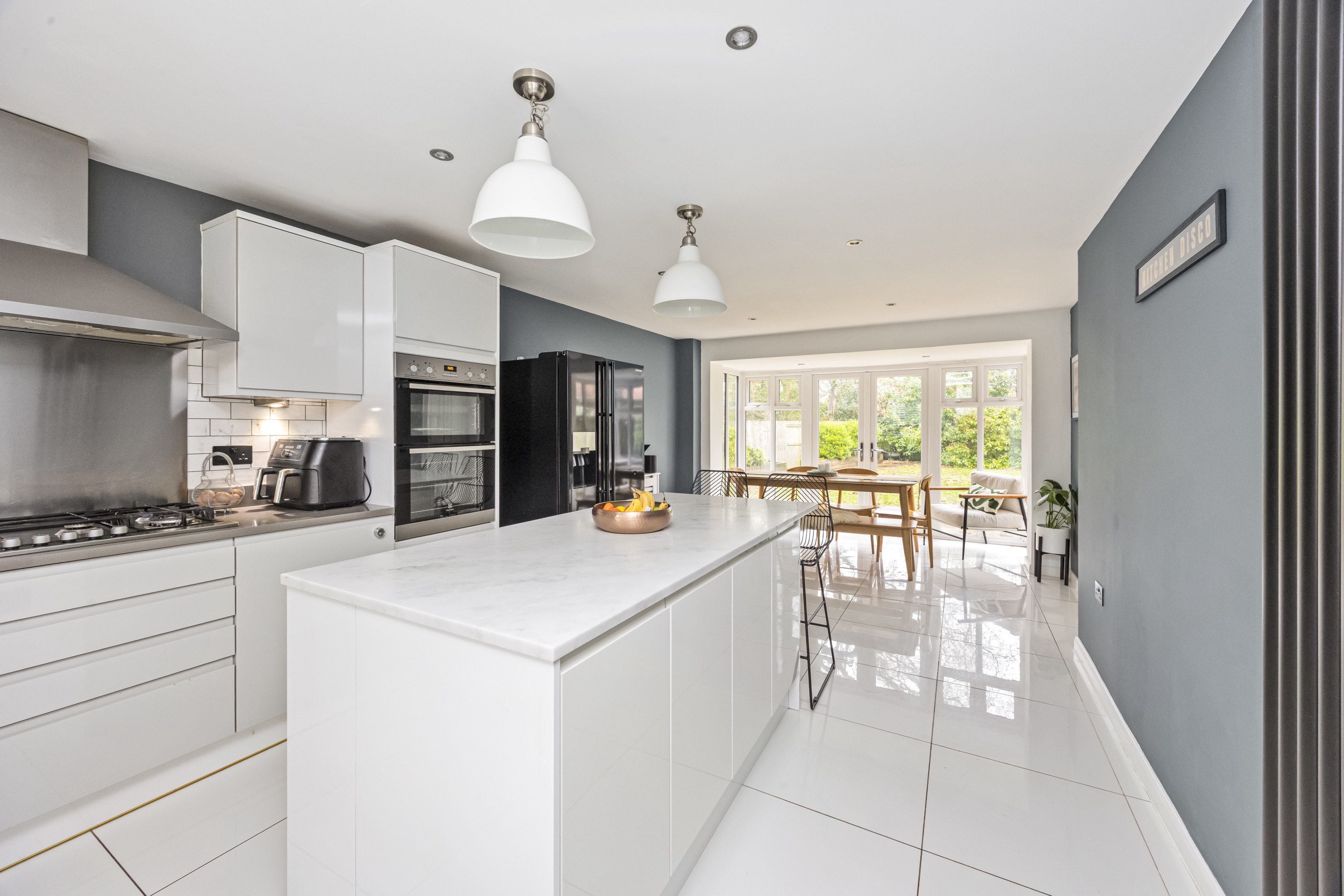 A stunning modern kitchen designed with sleek grey and white units, quality worktops, and integrated appliances. Finished to a high standard, this space combines functionality with contemporary style. The layout benefits from a versatile island unit that can be repositioned to complement your lifestyle and is flooded with natural light thanks to double doors opening directly onto the rear garden, creating a seamless indoor-outdoor flow – perfect for entertaining.