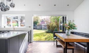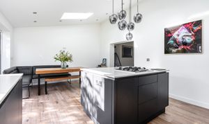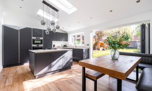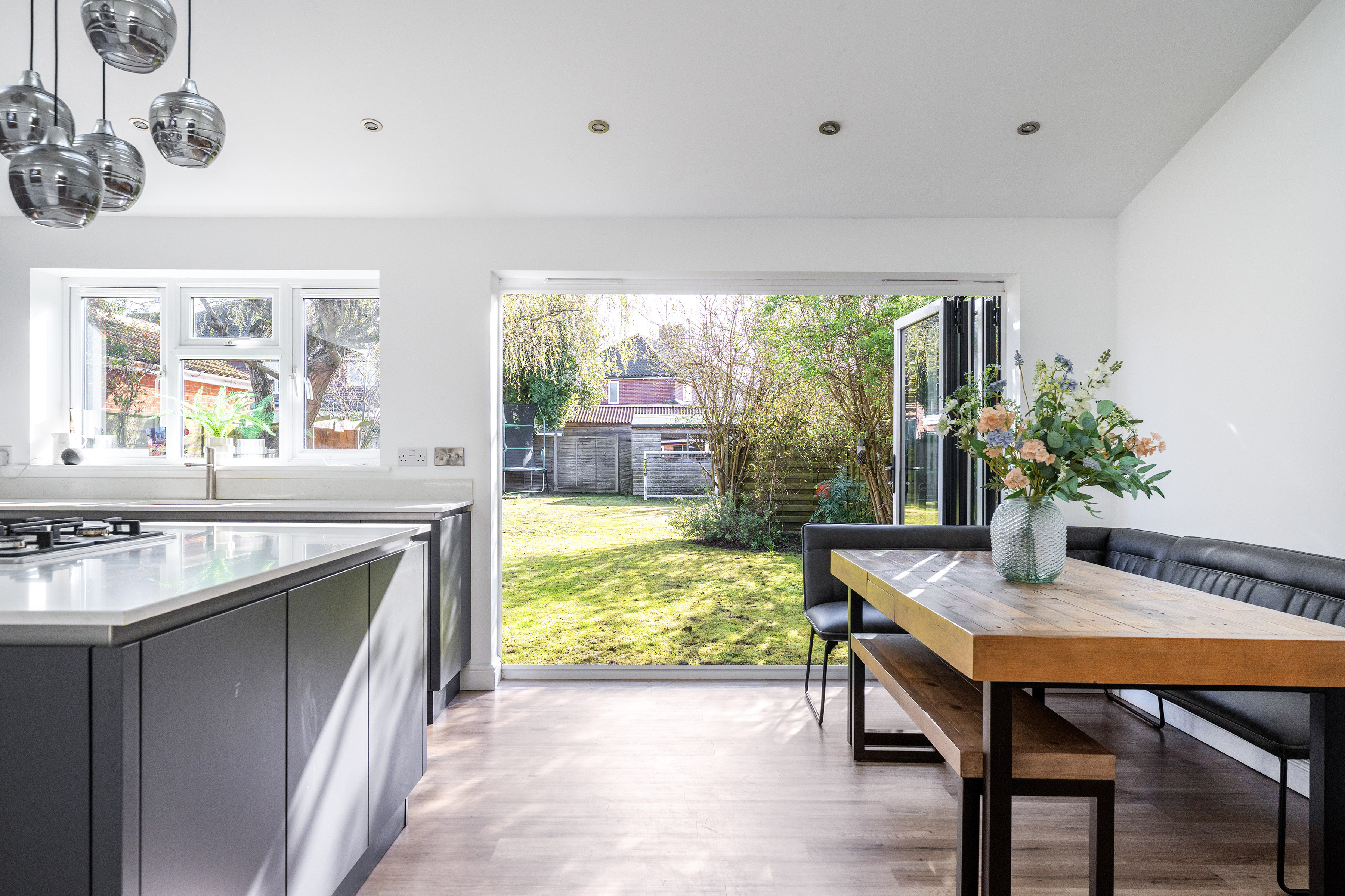 Velux windows above bring in even more daylight, while bi-fold doors extend the space out into the garden, creating a connection between indoors and out, perfect for relaxed family time or entertaining.