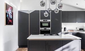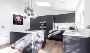 - Contemporary kitchen fitted with sleek monochrome units and a central island, providing both functionality and a sociable focal point