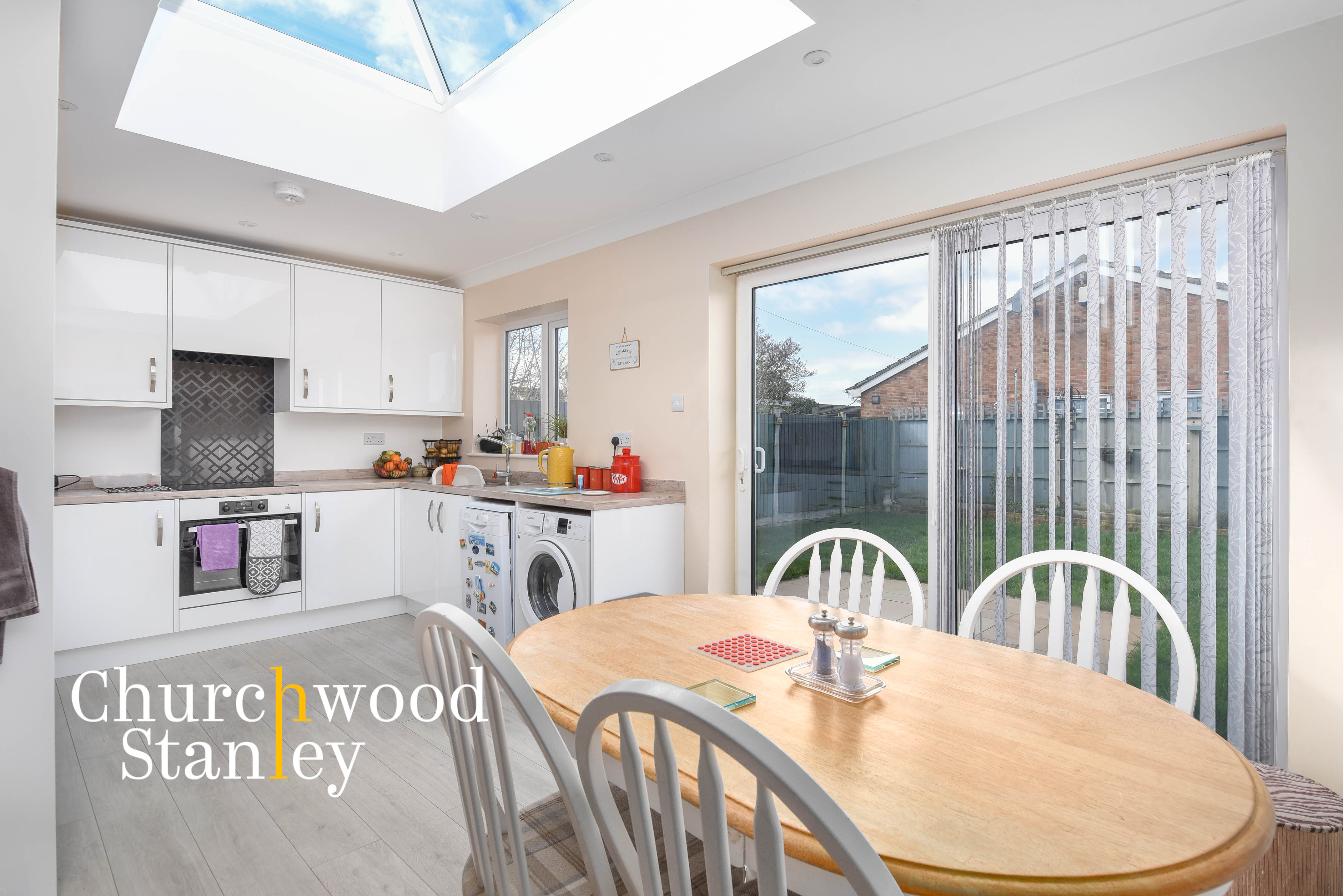 The kitchen and open plan dining area of the home occupies the footprint of a brilliantly designed and light filled extension completed in 2018,. The kitchen area features white gloss fronted soft closing units beneath a square edged work surface with upstand and matching wall mounted units. Integral appliances include a tall fridge freezer, an AEG electric oven and grill sat beneath a four ring AEG induction hob with (hidden) extractor hood over. Beneath the counter you will also find plumbing for a slimline dishwasher and also for a washing machine. Etched into the counter is a stainless steel stink with mixer tap found behind the window to the rear elevation. There are also a set of sliding patio doors that lead out onto the sandstone patio of the rear garden but the main focal feature of this stunning space is the large roof lantern above, ensuring plenty of natural light.
