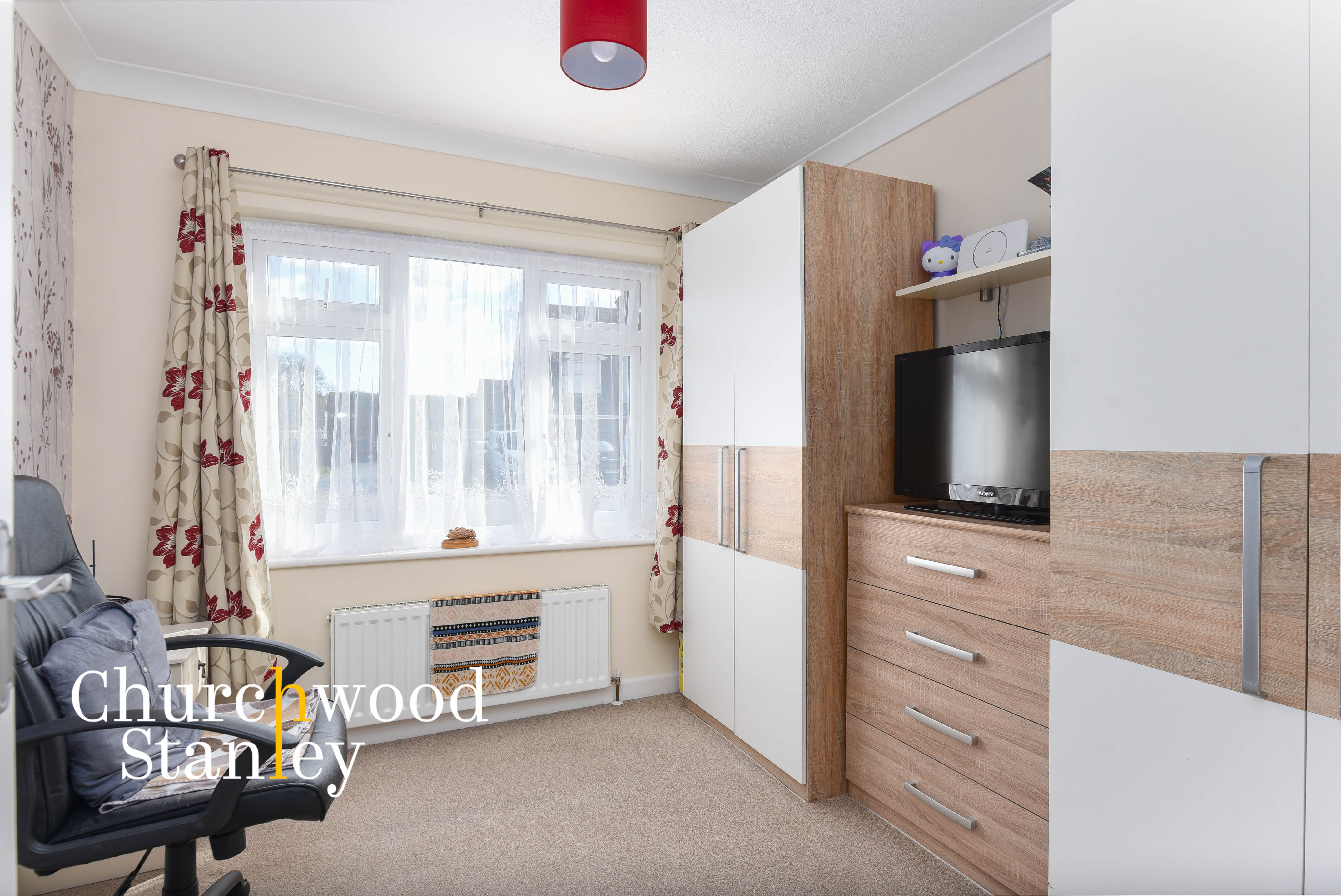 Almost perfectly square, the third carpeted bedroom found at the front of the home is also naturally illuminated by large window to the front elevation.