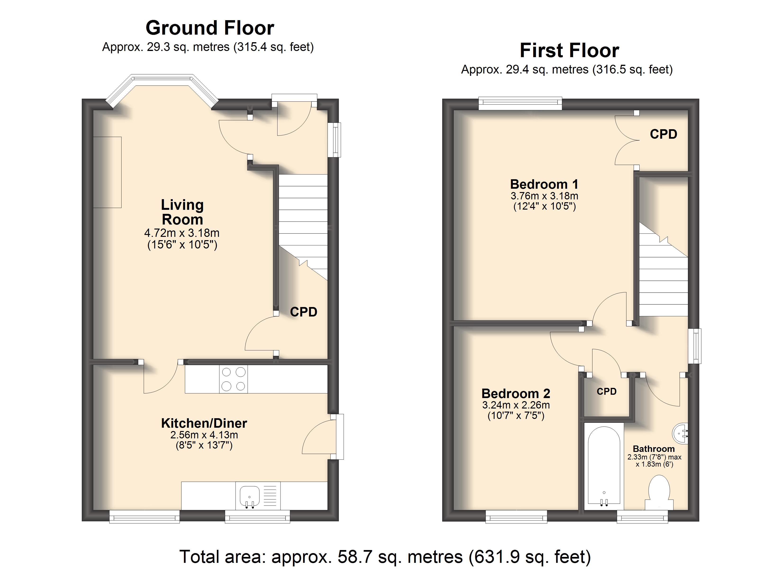 The first floor is home to two well-appointed double bedrooms, both offering ample room for standalone furniture, with bedroom one further benefiting from built-in storage. A modern bathroom accompanies the bedrooms, complete with a sleek three-piece suite.