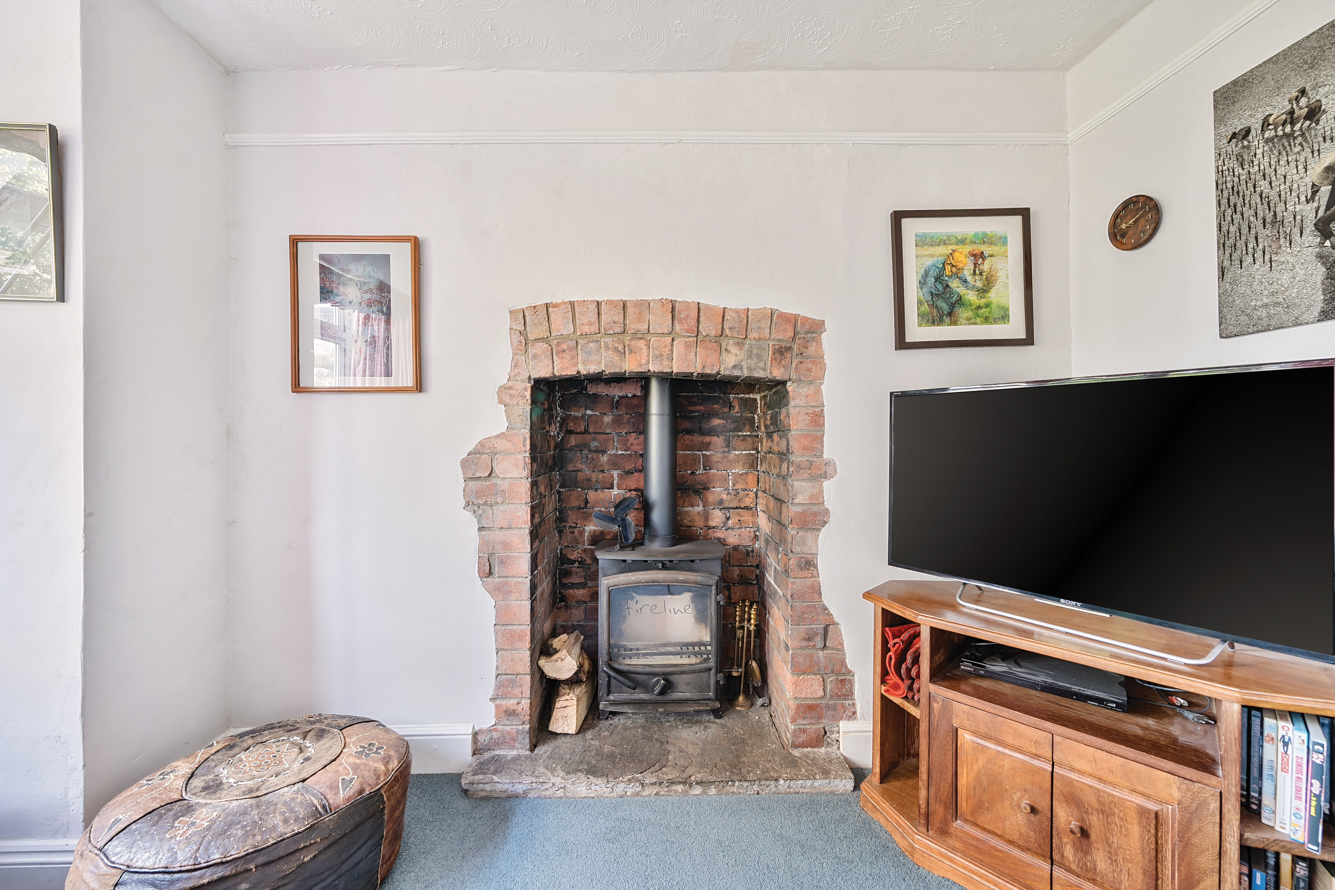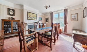To the right is the dining room — another elegant space — large and airy, with plenty of room for a sizeable dining table. A picture rail and log burner add even more character.