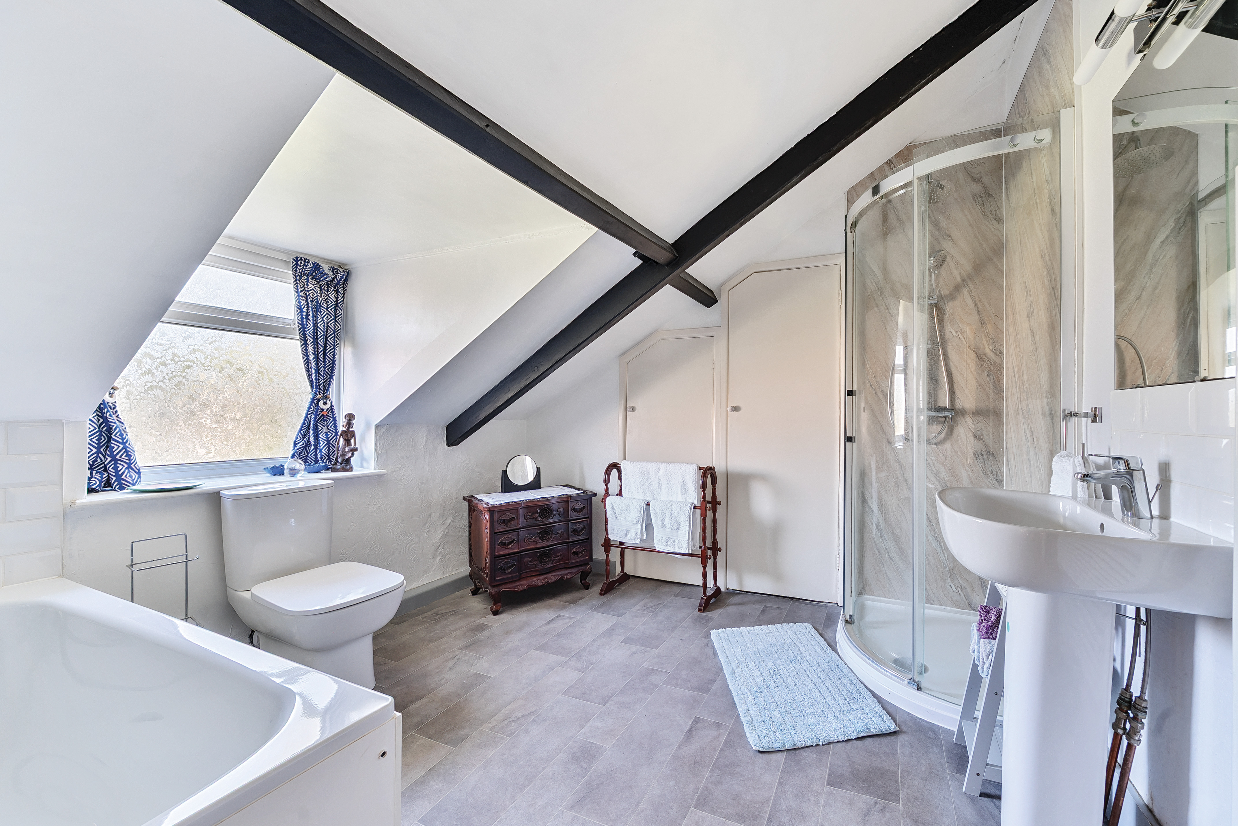 The family bathroom has been recently refurbished and includes cottage styling, a bath, and a separate shower. A "secret" passage from here leads to the en-suite bathroom of bedroom four.