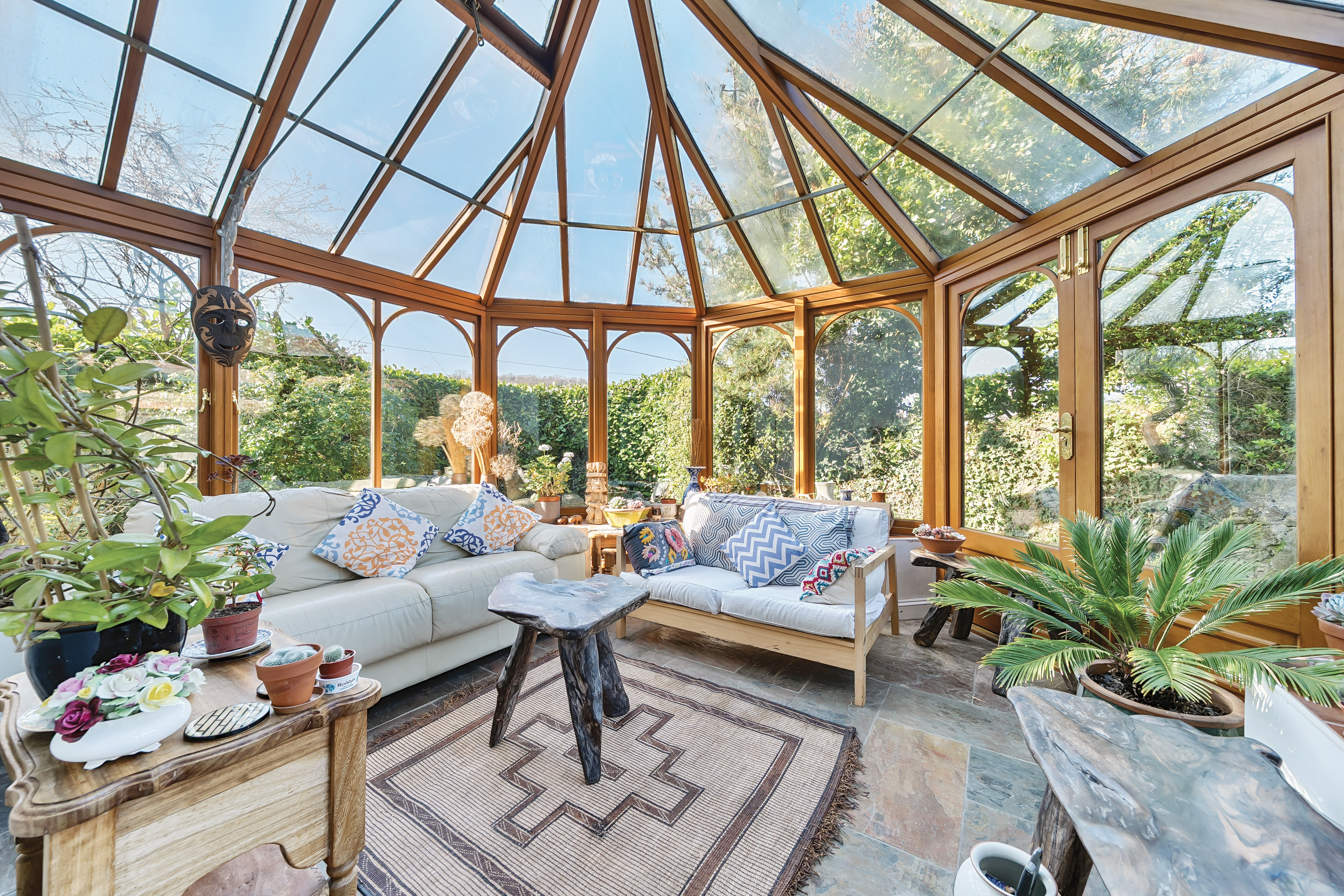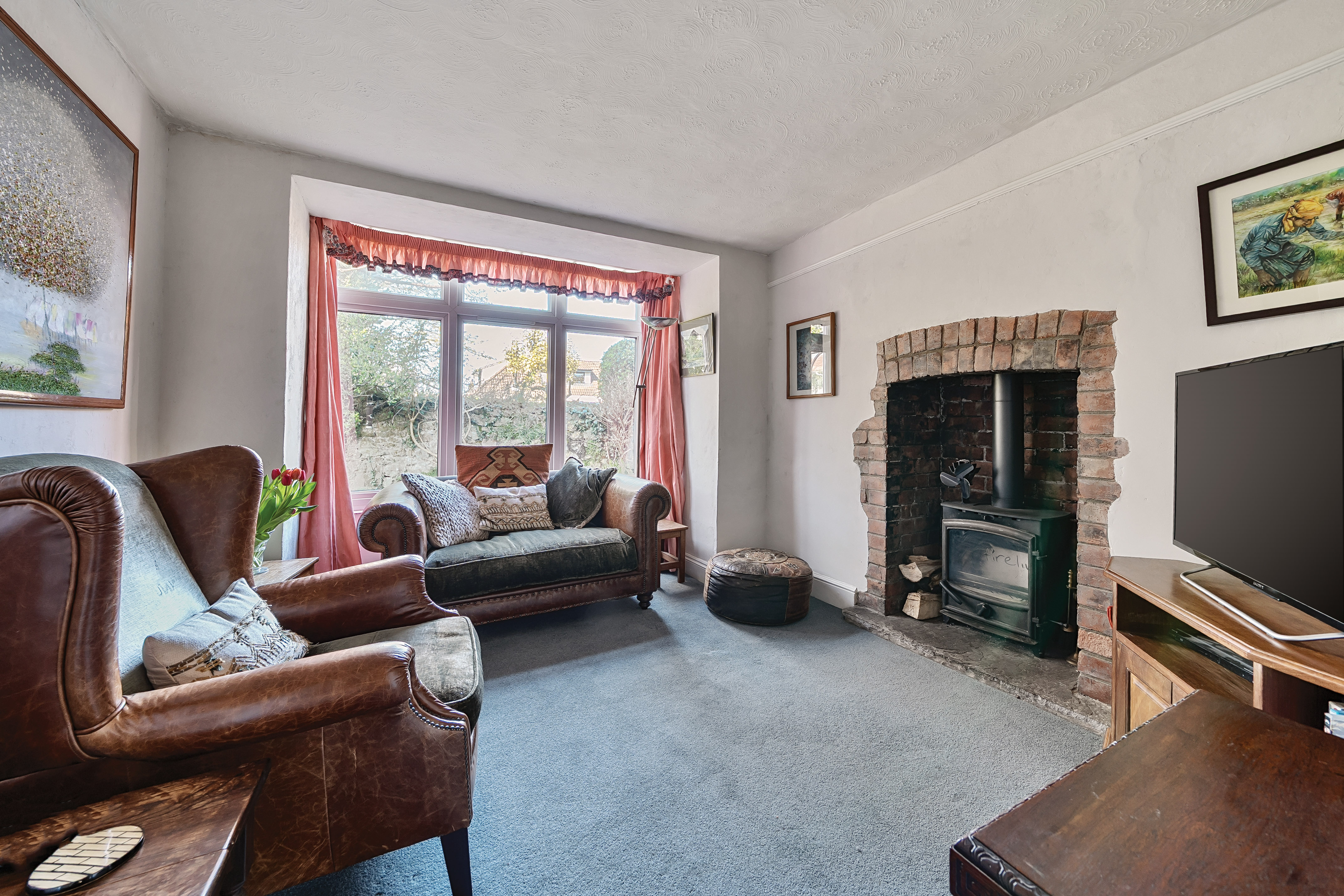 A storm porch and front door open into a surprisingly spacious hallway. To the left is the generous sitting room, complete with picture rail, open fire, and a bay window. Double doors lead to a conservatory with attractive slate flooring and windows on all sides, creating the feeling of being at the heart of the garden.