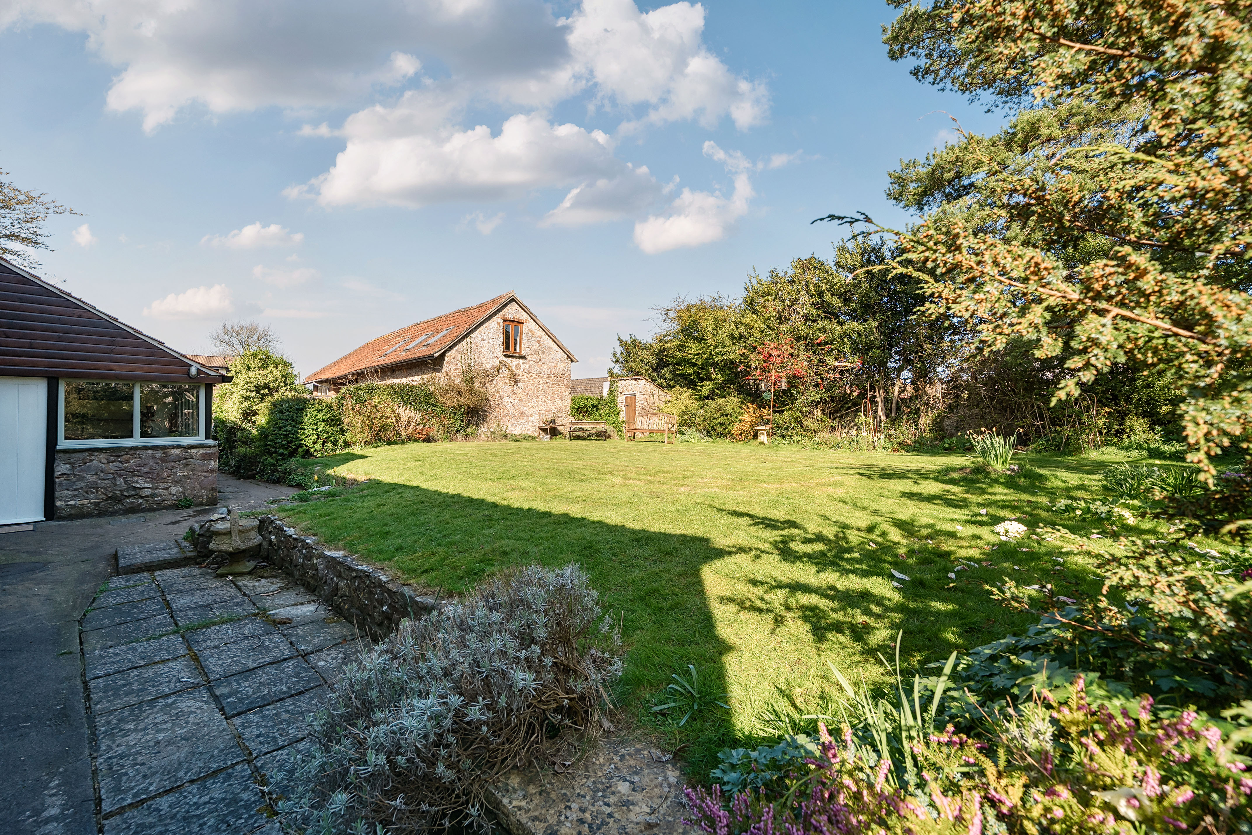 Outside - Lily Cottage sits in grounds of just over 0.25 acres. The rear garden is fully enclosed, very private, and features a mix of attractive stone walling and evergreen hedging, along with a spectacular Scots pine in the corner. There is also a stone garden tool store/potting shed. The courtyard of the cider barn offers driveway parking for several cars.