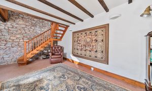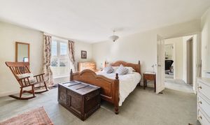 Also, conveniently placed off here is a versatile room (originally the stables) that could be a playroom/office or another reception room. It has a door to the garden, high ceilings, and stairs leading to what was the hayloft. Here, you'll find a double bedroom with exposed beams and an en-suite bathroom featuring a corner bath.