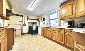 At the rear of the hallway, an inner hall with a gorgeous flagstone floor leads to the snug: a cosy room with a log burner and bay window. Beyond this is the kitchen, which overlooks the garden. Bright and airy, it is fully fitted with a range of wall and floor units, along with an original pine dresser. Appliances include an oil-fired AGA and a separate oven and there is also space for a dishwasher. A latched door leads to the utility room, which offers space for a washing machine and fridge/freezer, together with a walk-in pantry.