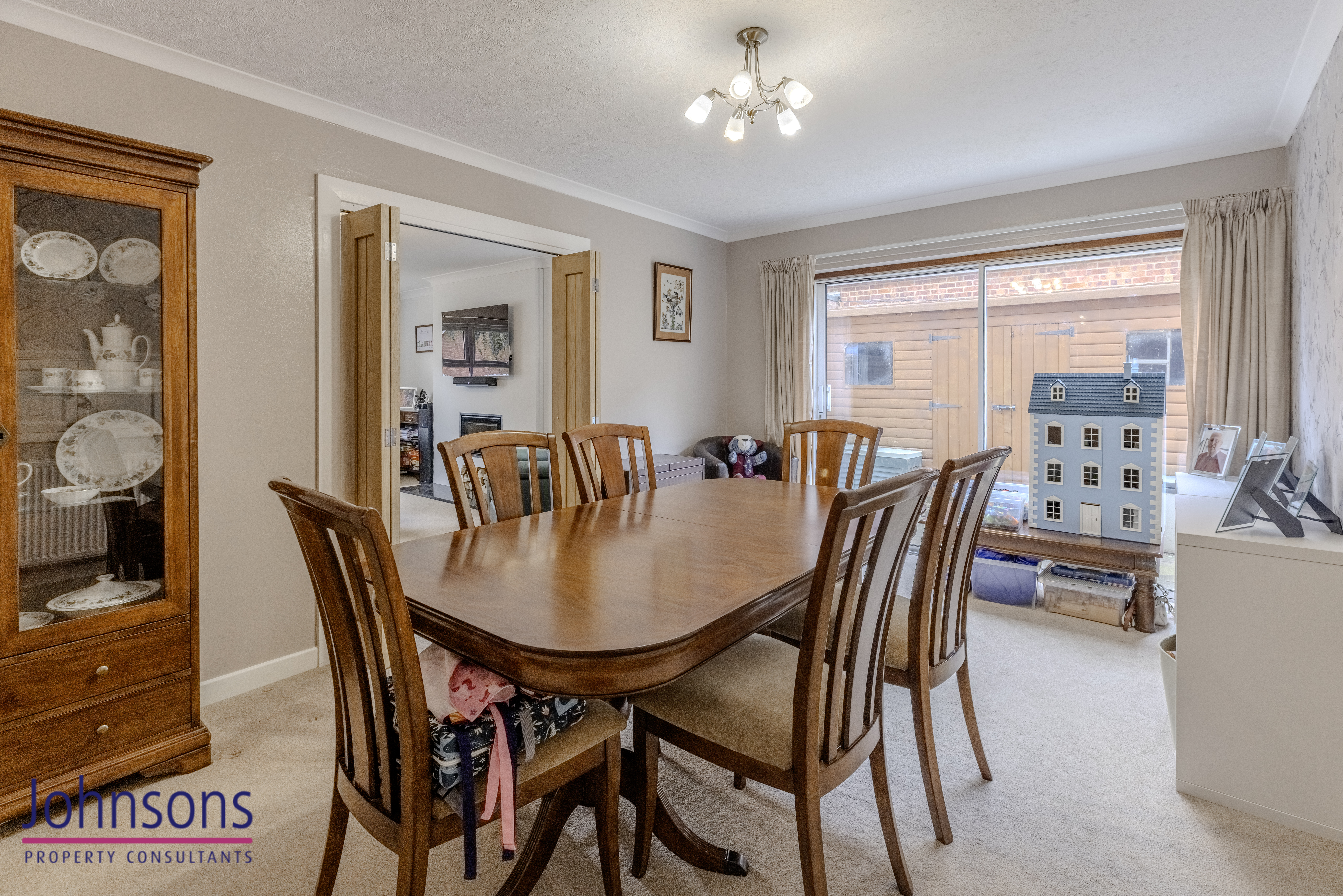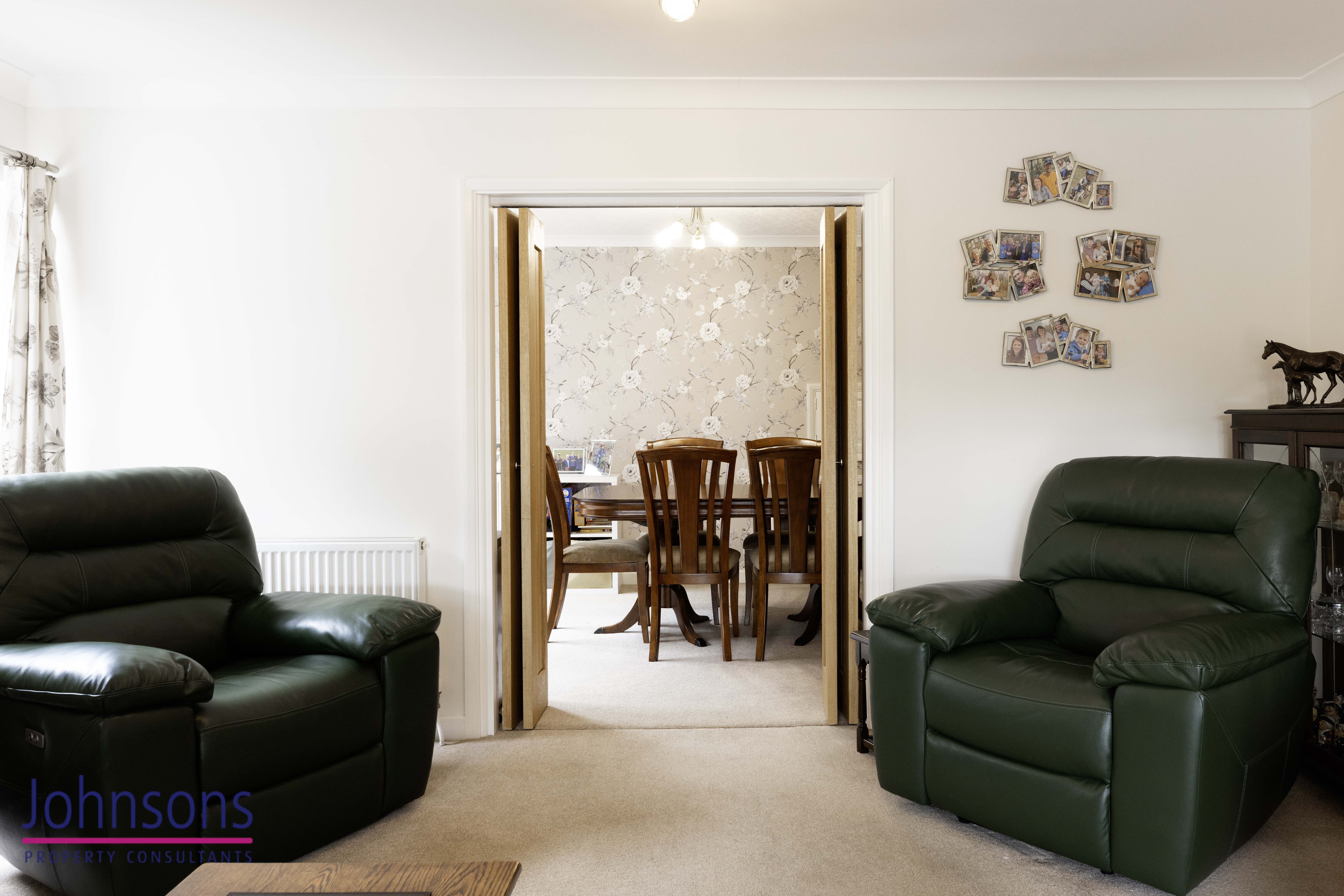 - Dining room with connecting double doors, opening into the living room to create an open plan family/ social space