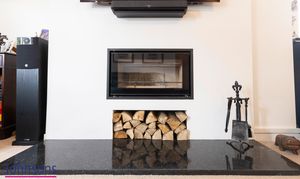 - Spacious living room with dual aspect windows and a central feature fireplace and solid fuel burner