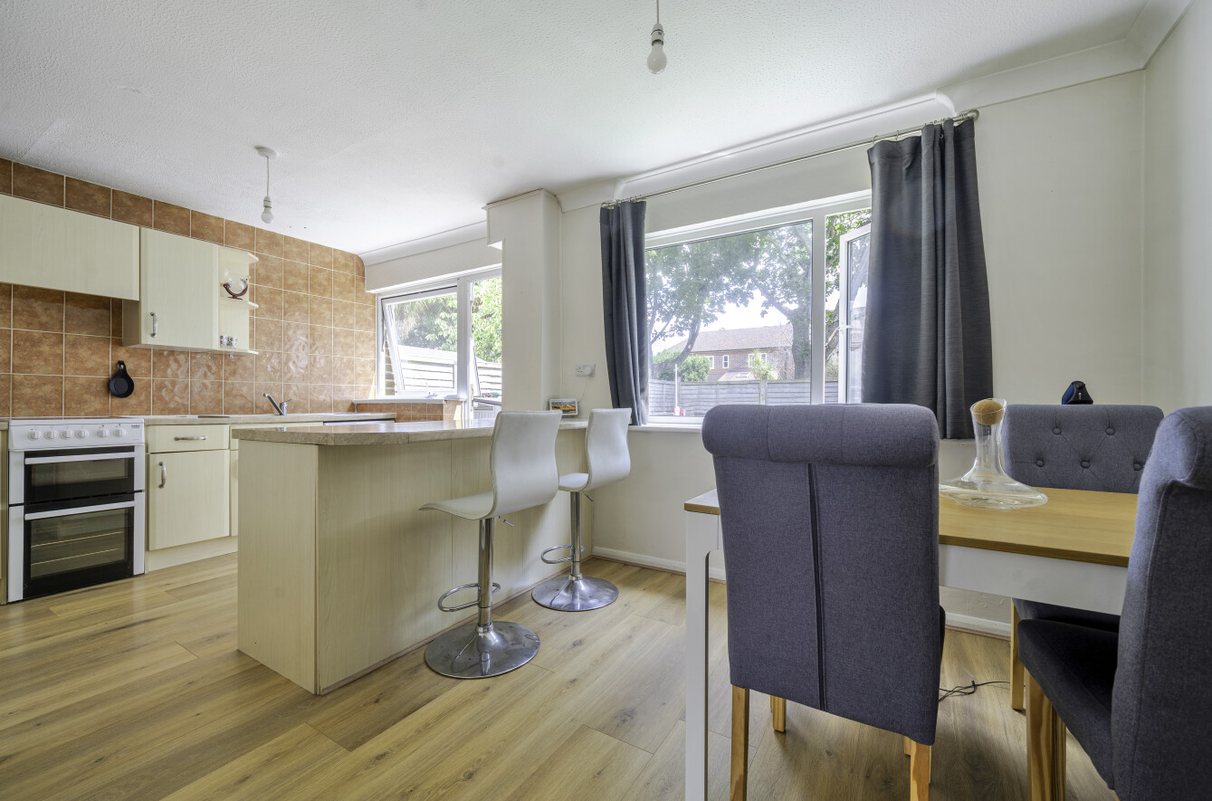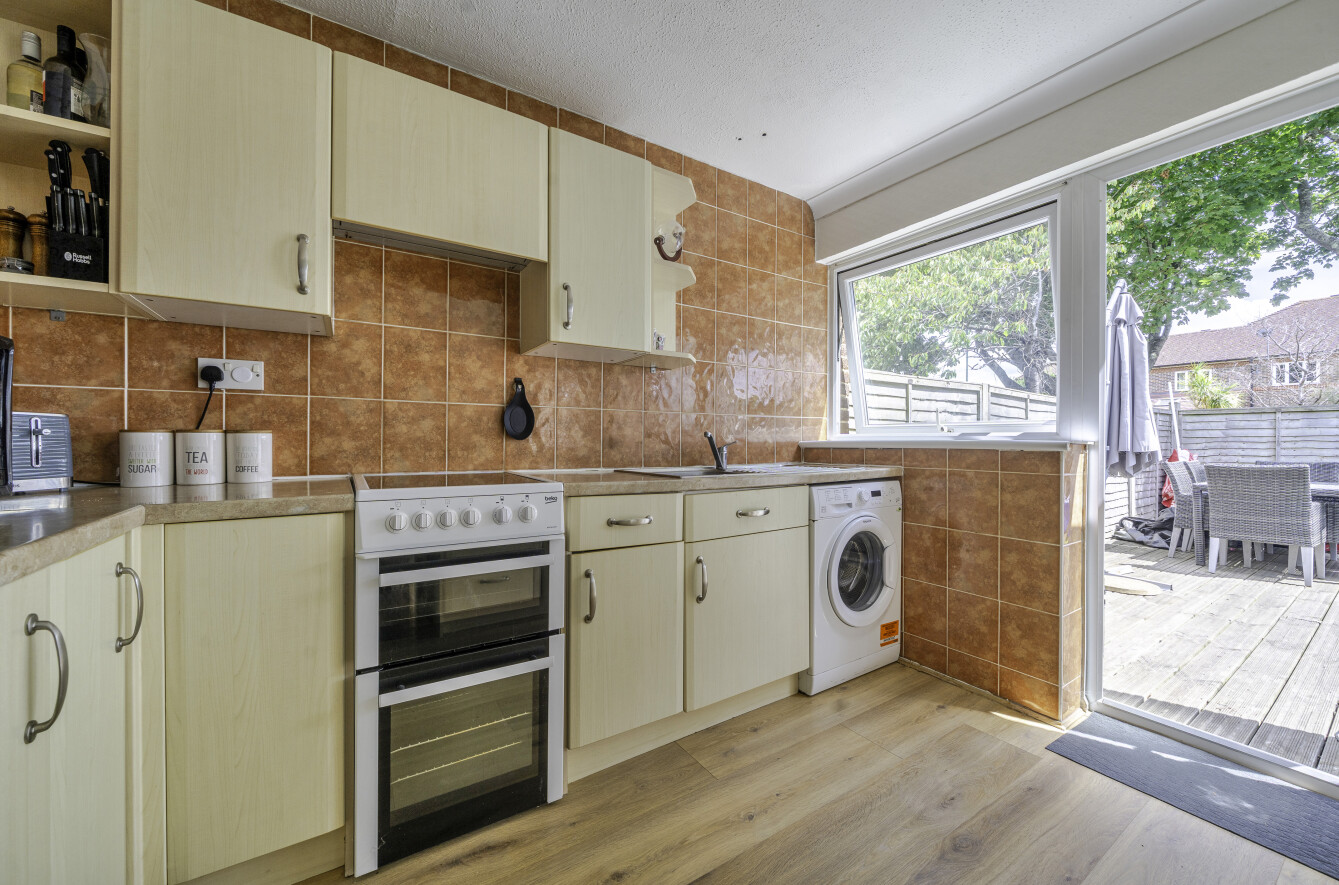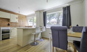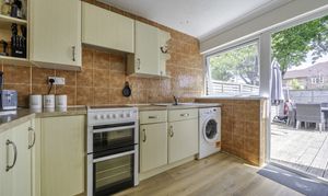 To the rear, you'll find a spacious open-plan kitchen and dining area, ideal for everyday family meals or hosting. The kitchen is well-equipped with plenty of worktop and cupboard space, and benefits from direct access to the private rear garden—perfect for indoor-outdoor living during the warmer months.