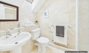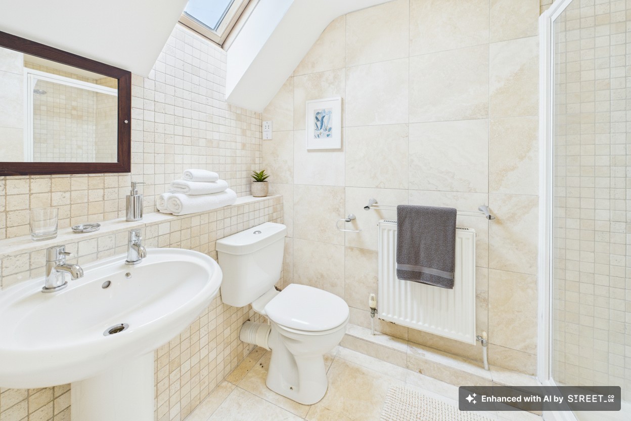 A generous four-piece suite including double-ended bath with mixer tap, separate shower cubicle, wash basin and WC. Finished with modern tiles, radiator and obscure glass window.