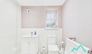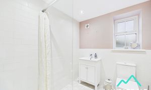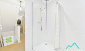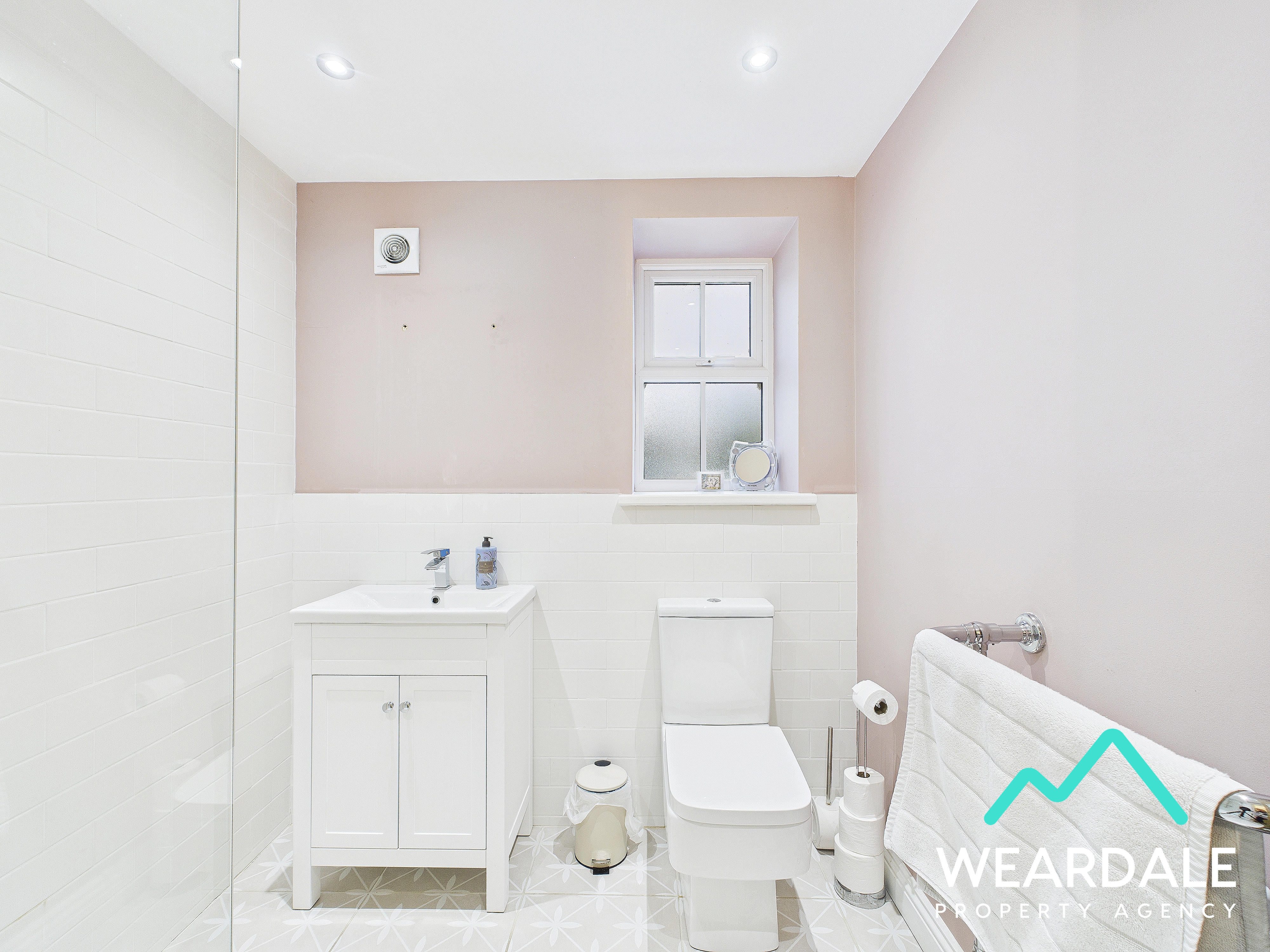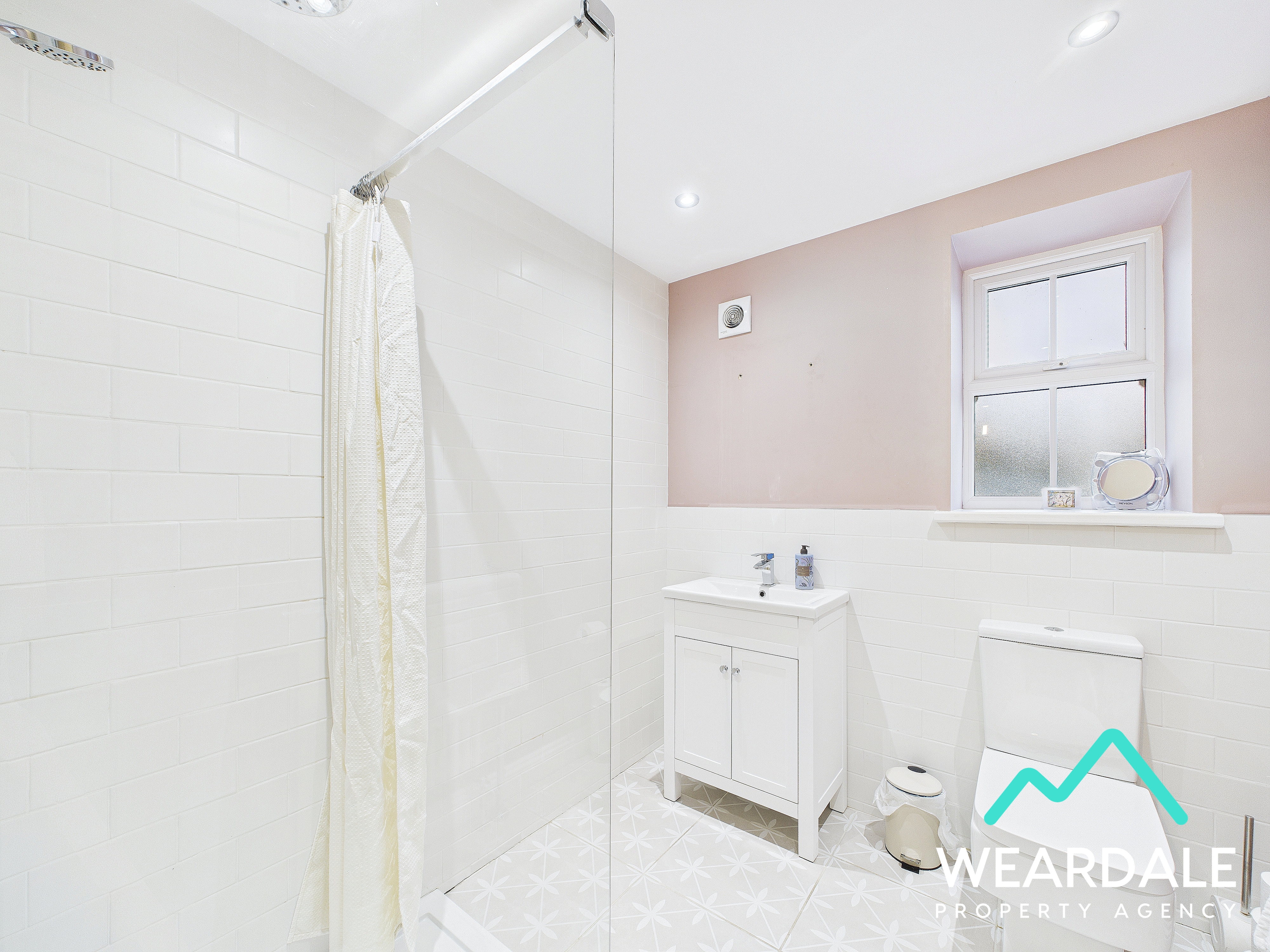 - Positioned to the rear of the property and accessed from the first floor landing - Double-glazed uPVC window to the North-Eastern aspect, with frosted pane and deep wooden sill - Tiled flooring - Neutrally decorated - Walk-in corner shower with glass screen, shower curtain, and mains-fed shower with overhead rainfall showerhead - WC - Hand-wash basin set on a pedestal unit with under counter storage cupboards - Ceiling spotlights - School style heated towel rail - Extractor fan