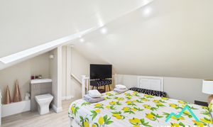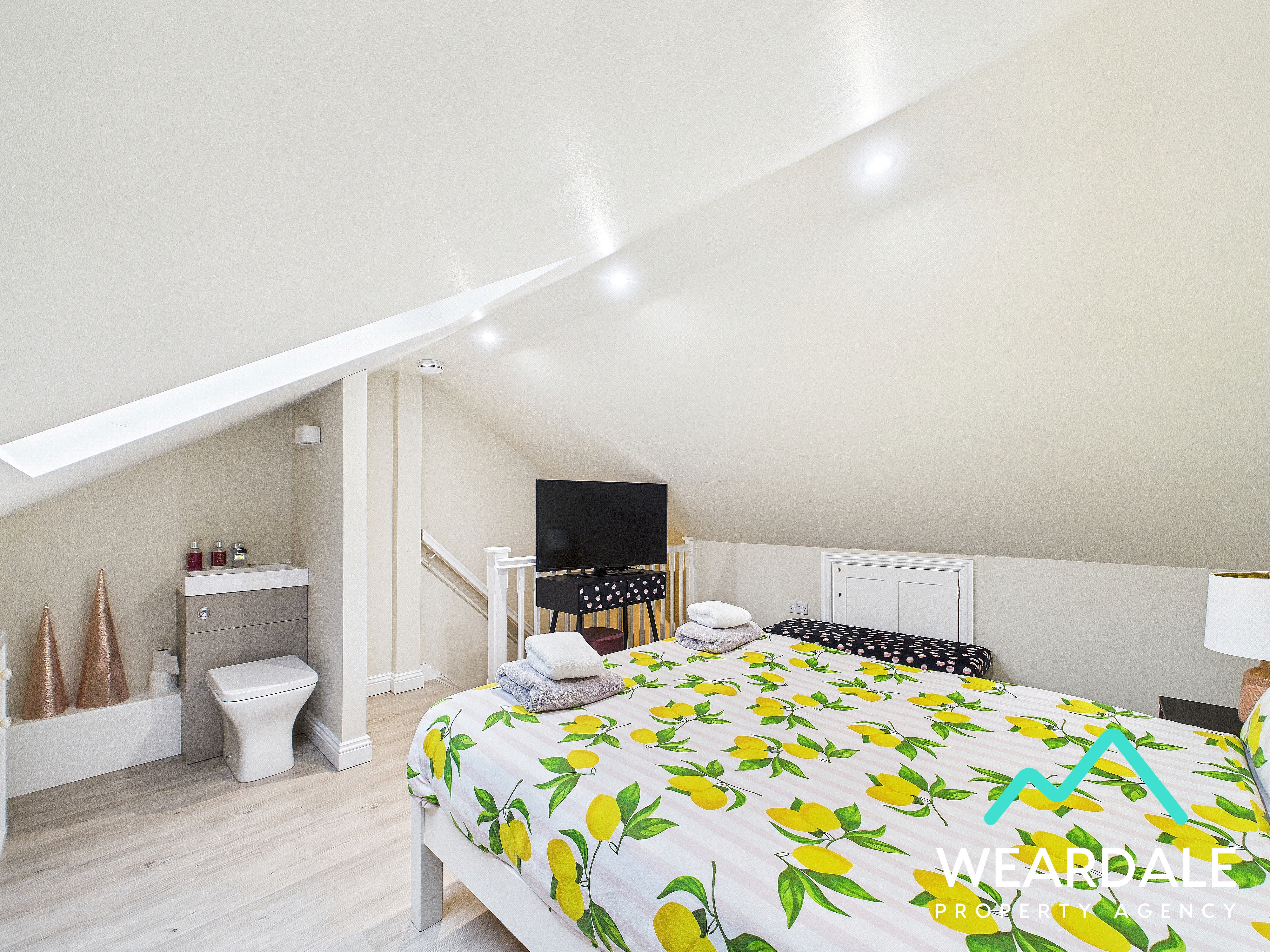 - A carpeted staircase rises from the first floor landing to bedroom 1 - Well-proportioned double room - Double-glazed uPVC roof light window to the North-Eastern aspect, looking over the rear of the property and providing beautiful views of the surrounding hillsides - Laminate flooring - Vaulted ceiling - Neutrally decorated - WC with built-in hand-wash basin - Two built-in storage cupboards - Ceiling spotlights - School style radiator - Ample space for free-standing storage furniture