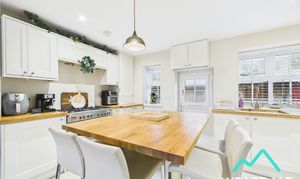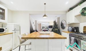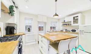 - Positioned to the rear of the property, being open-plan (7.06m x 4.18m) with the living room, and providing external access to the rear of the property via a double-glazed uPVC stable style door with frosted panes - Two double-glazed uPVC windows with deep wooden sills to the North-Eastern aspect, looking over the rear of the property - Laminate flooring with built-in coir matting next to the rear door - Neutrally decorated - Range of over/under counter storage units - Central island with under counter storage cupboards and drawers - Oak work surfaces - Belfast sink - Free-standing range cooker - Space for free-standing appliances - Ceiling spotlights - School style radiator - The property’s gas Combi boiler is located in a cupboard in this room - The property’s electrical consumer unit is located in a high-level cupboard in this room