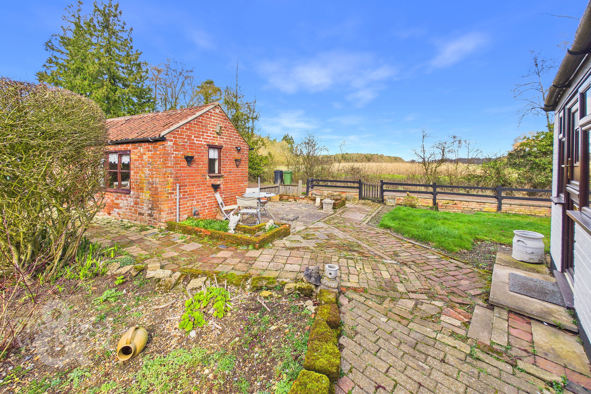 The property sits towards the end of a private un-made road, with off road parking provided for several vehicles. A timber gate leads to a pathway where courtyard style seating can be found, with a well and views across the gardens.