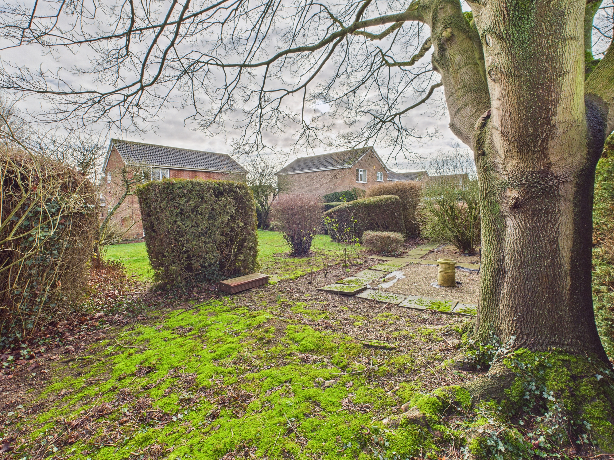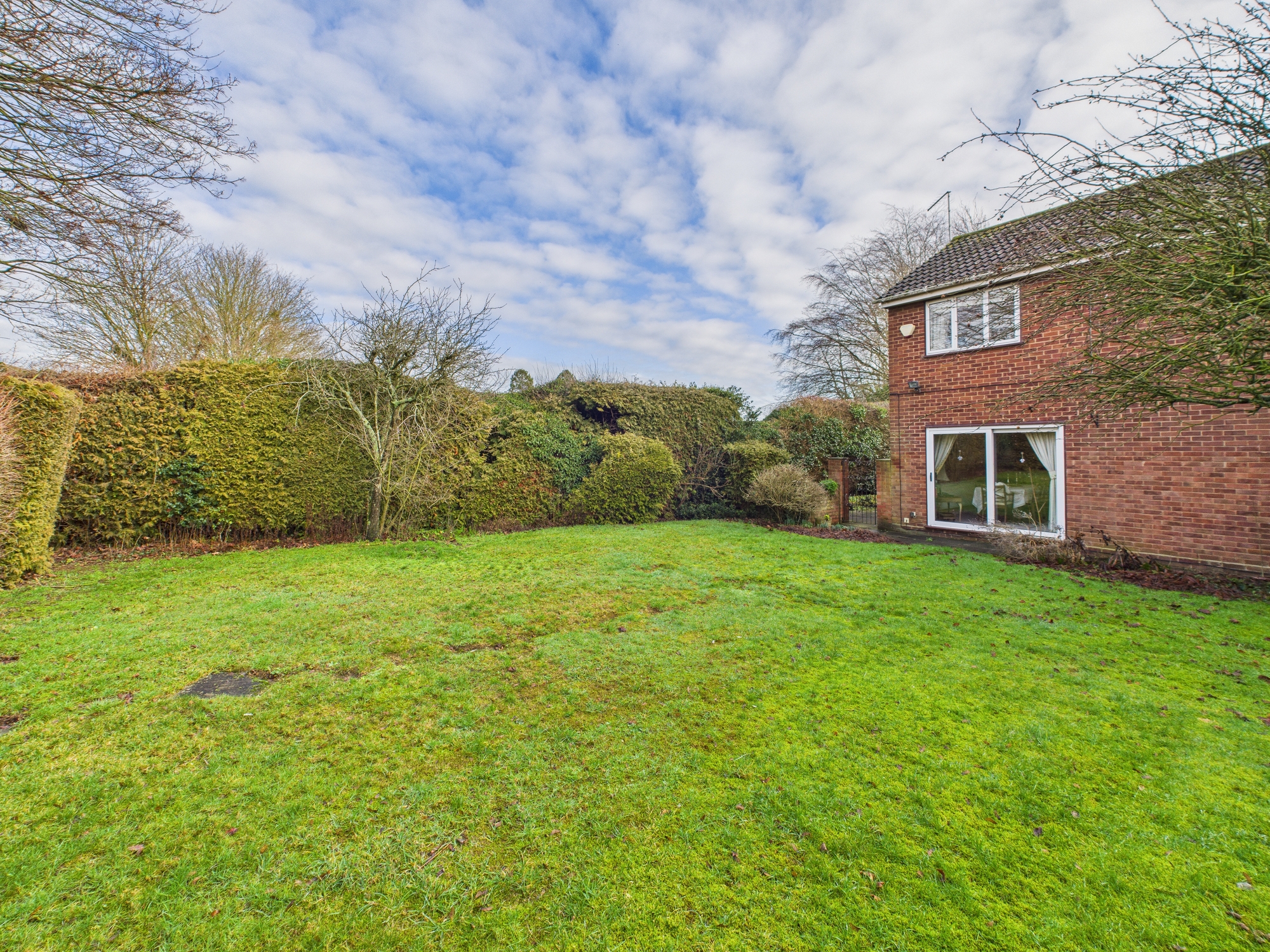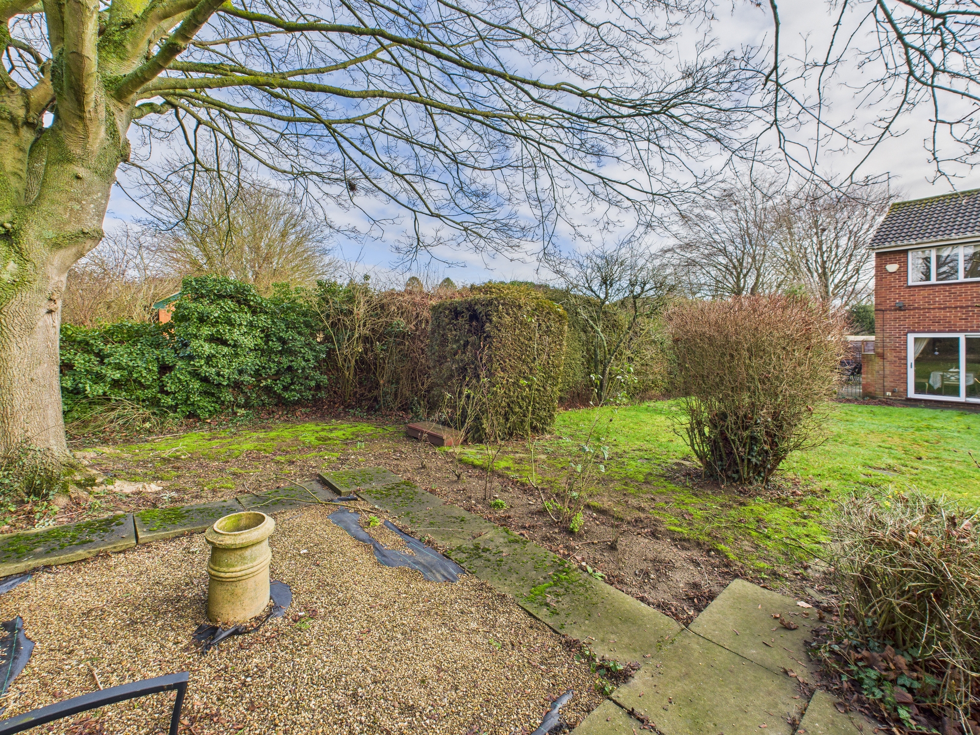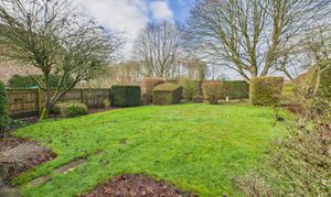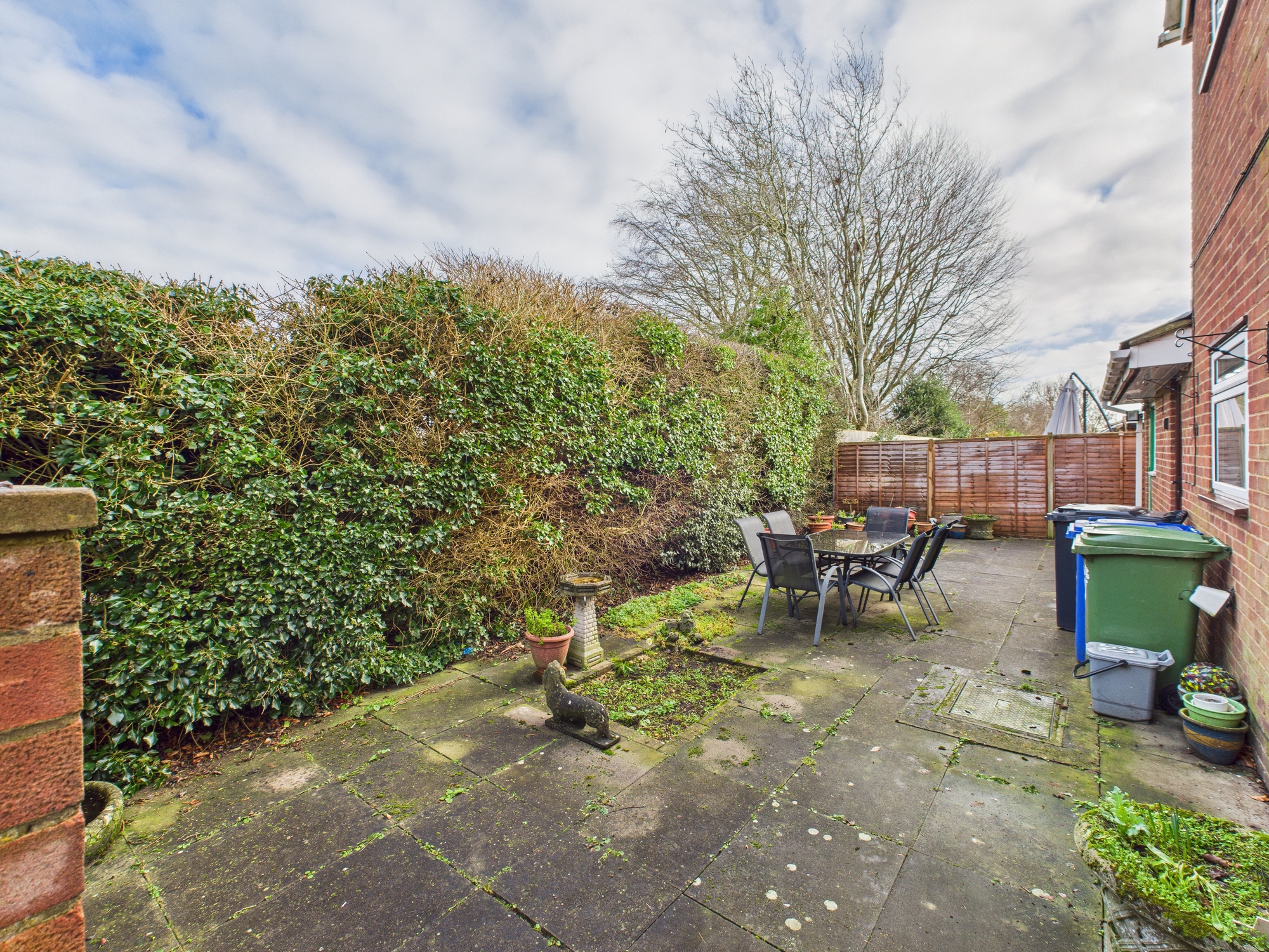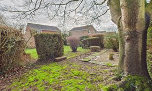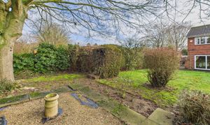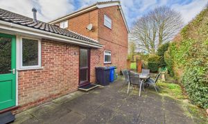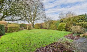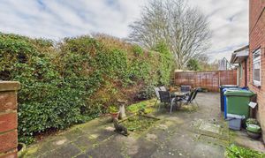 The rear aspect of the garden is paved with access to the front and side garden, where there is a smaller patio and mature planting.