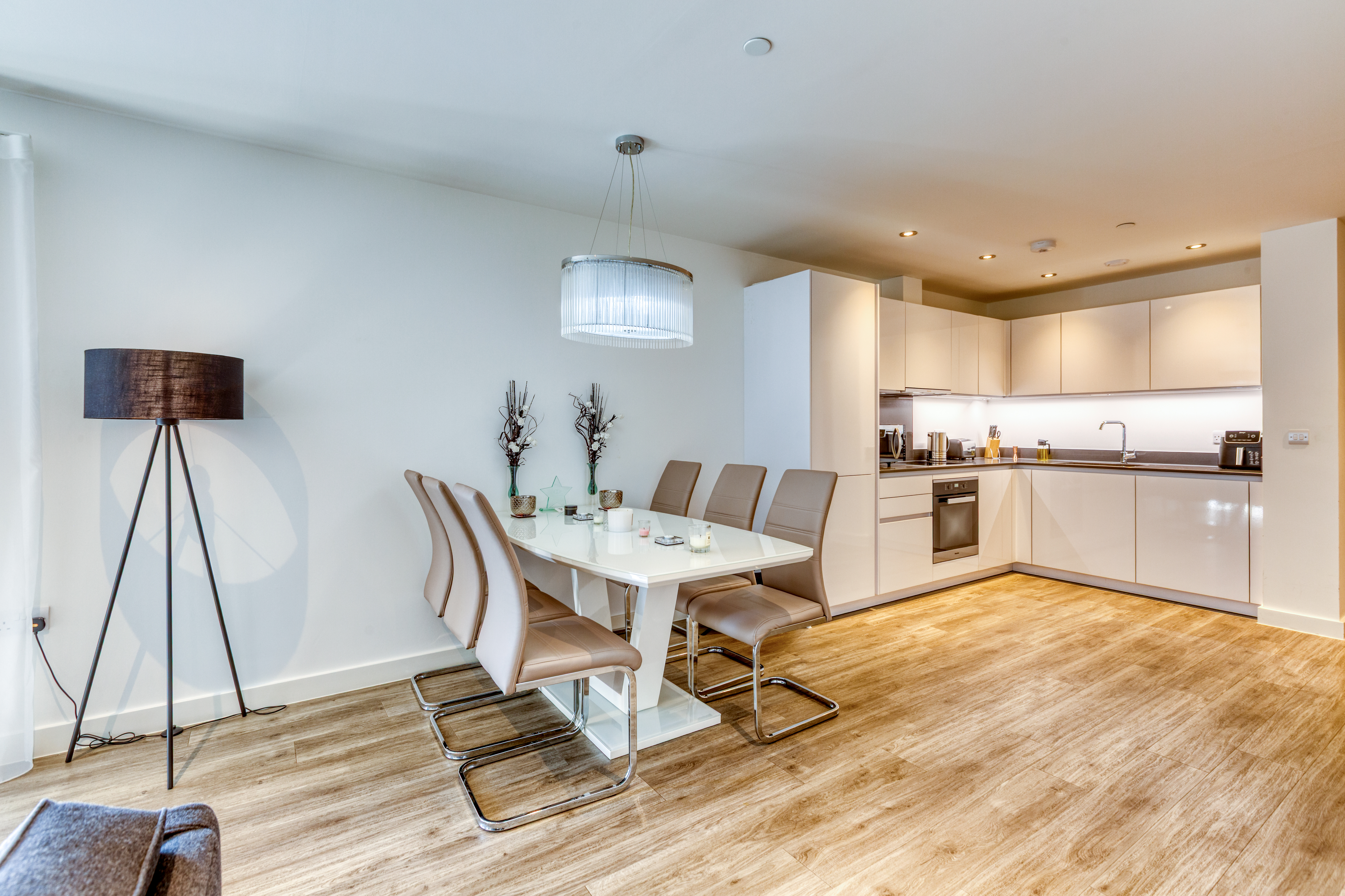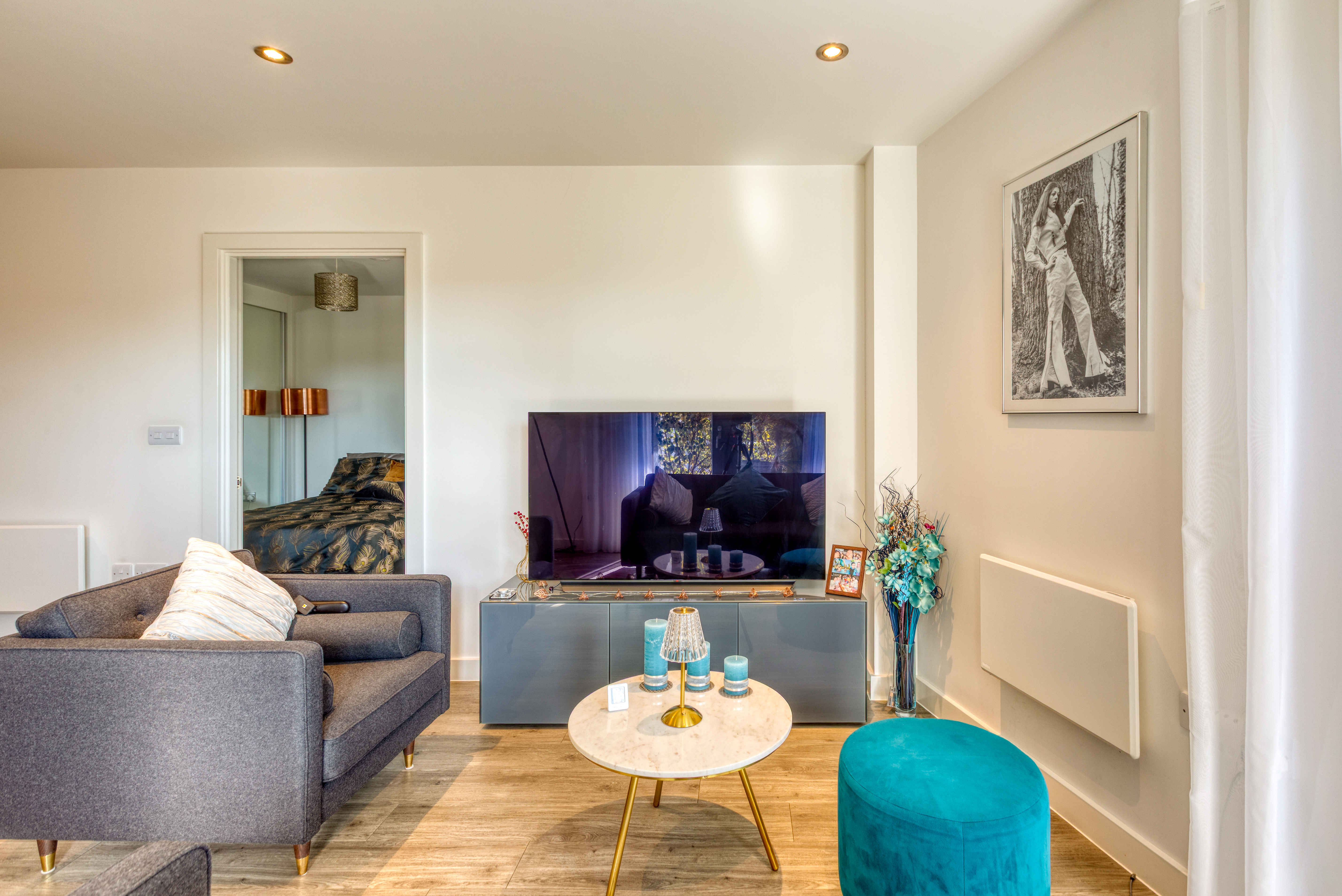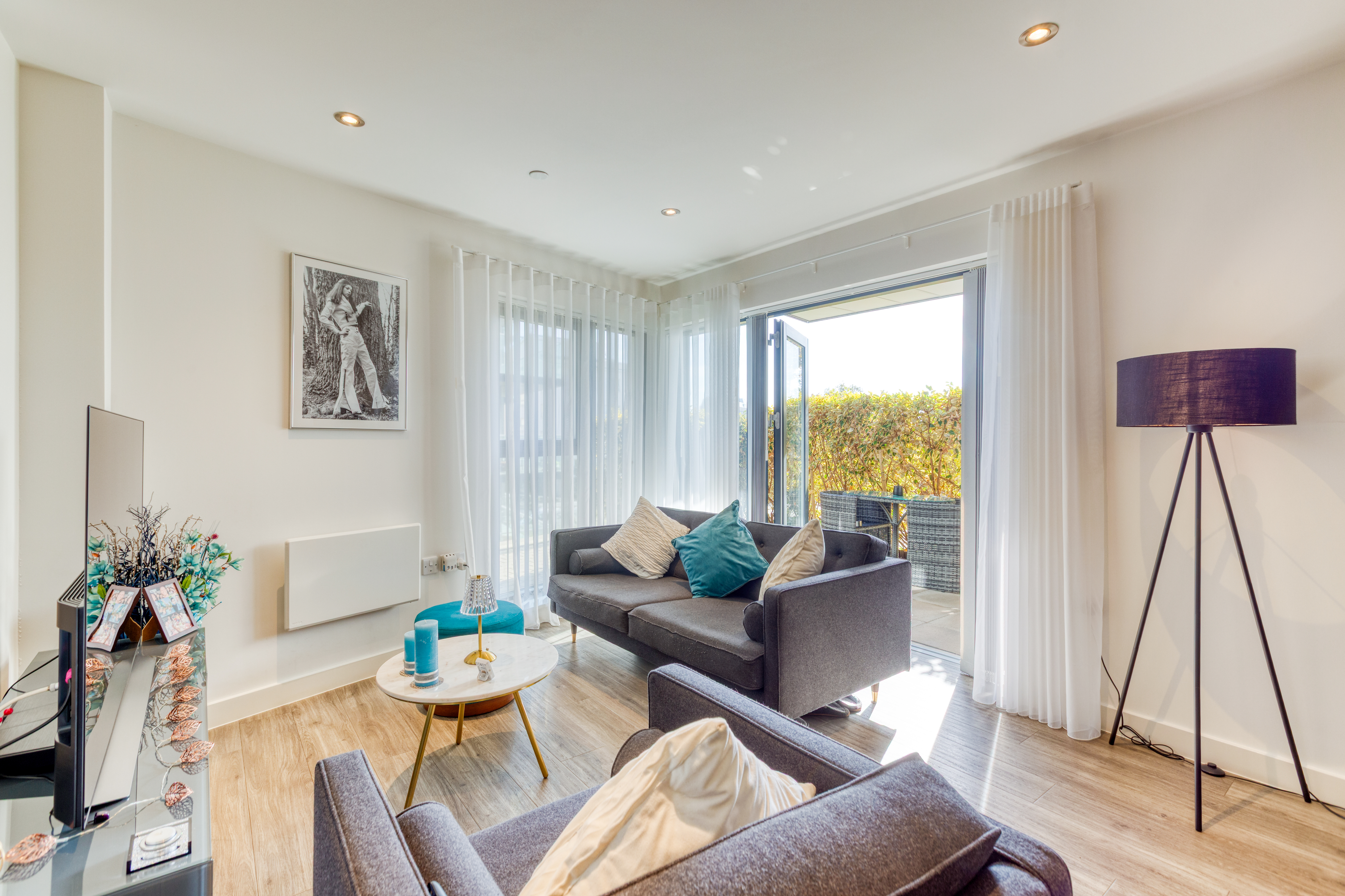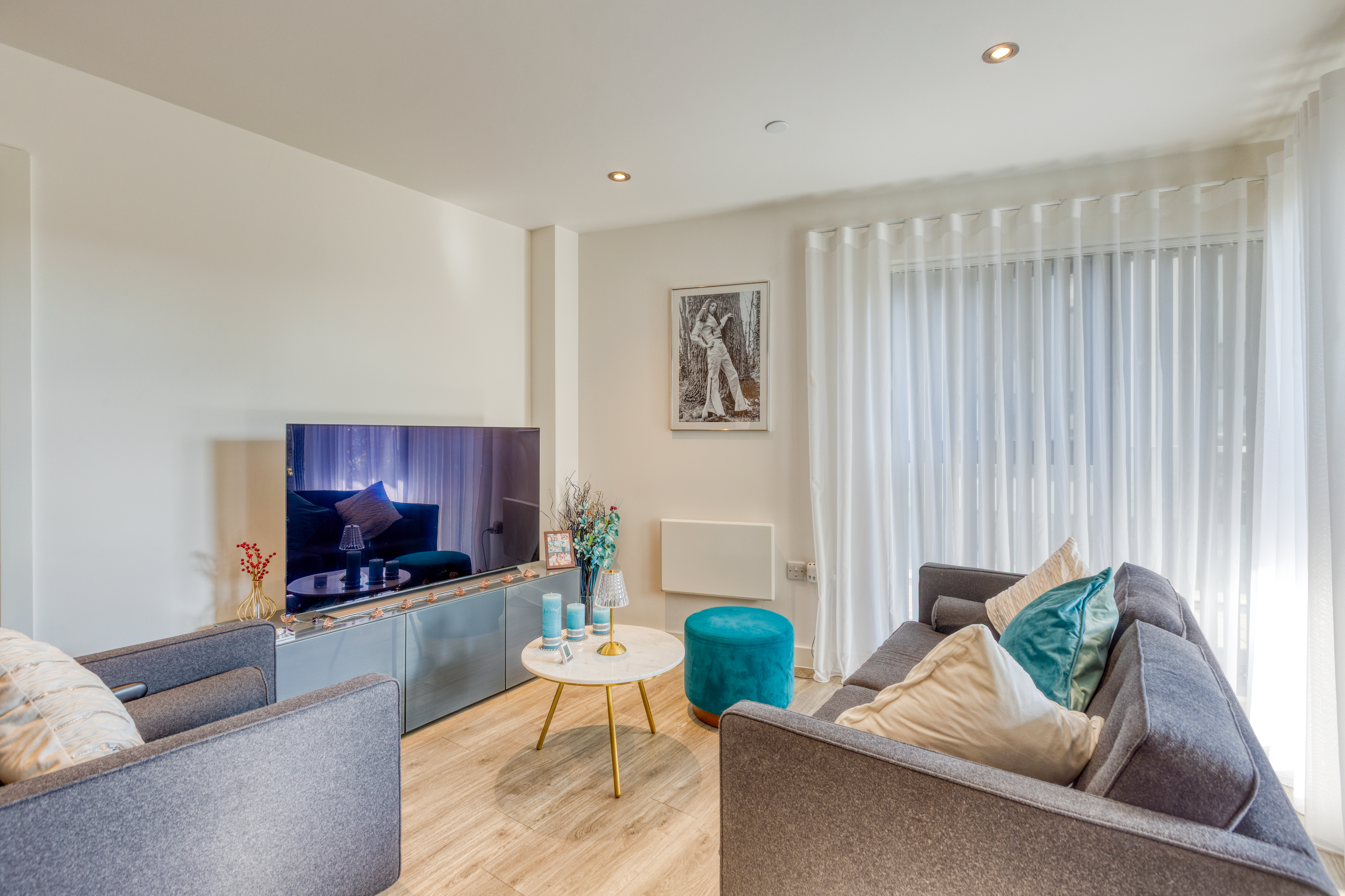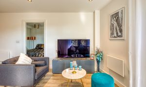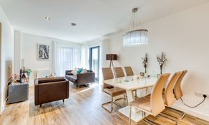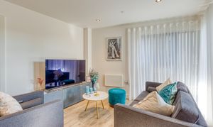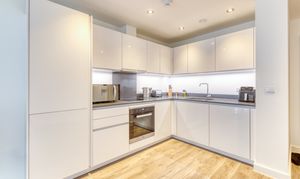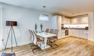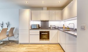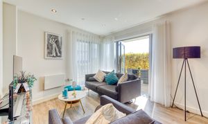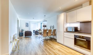 The stylish open-plan living offers a kitchen which is fitted with high-quality Miele appliances, offering both form and function for modern living. A walk-in utility cupboard provides excellent additional storage, whilst the double bedroom includes a built-in wardrobe, enhancing the apartment’s practicality.