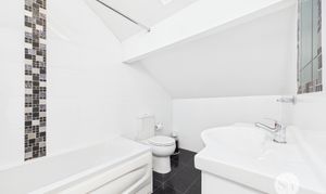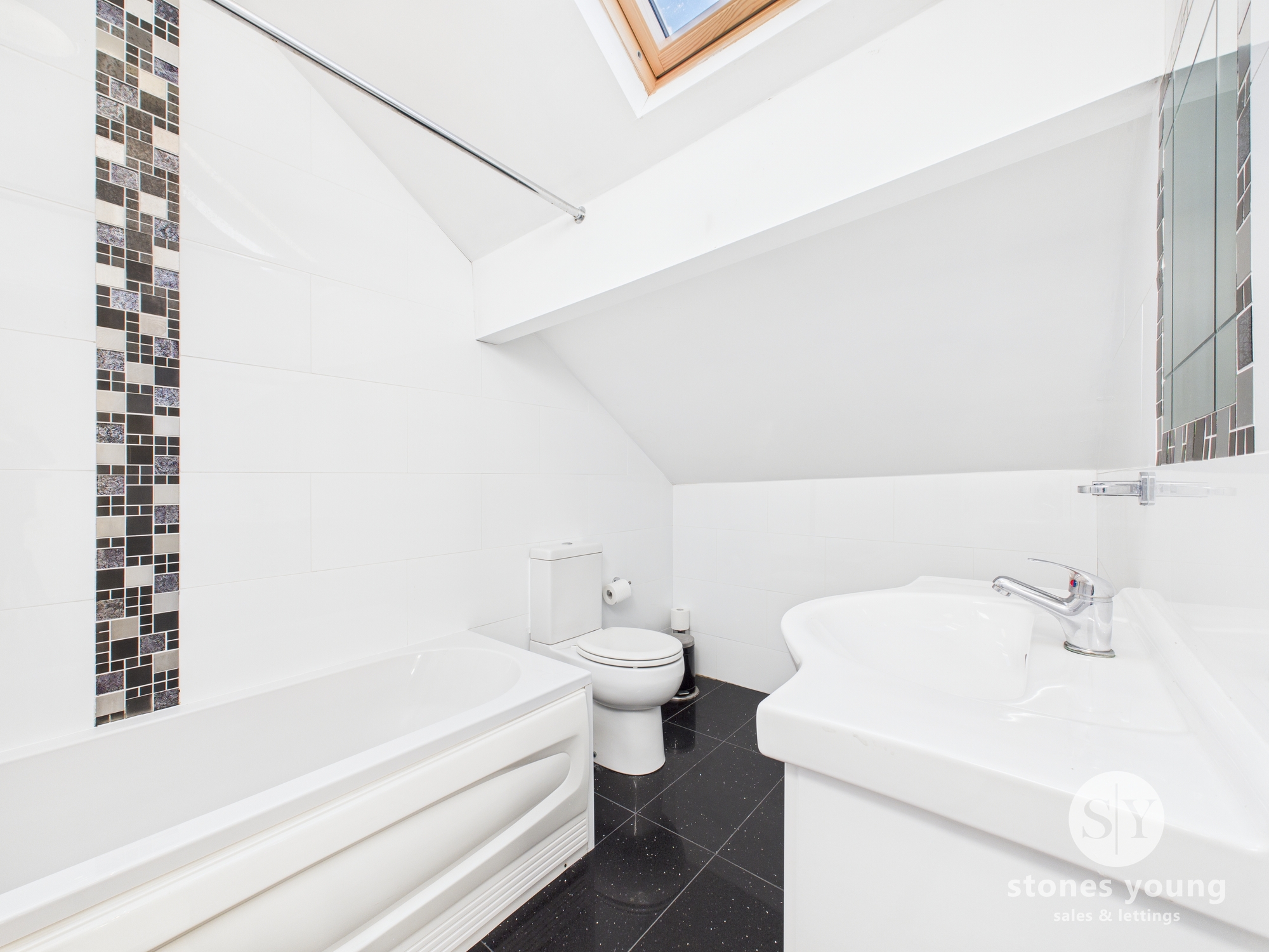 Tiled flooring, three piece in white comprising of electric shower over bath, wc and basin, tiled floor to ceiling, Velux window, towel radiator.