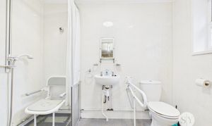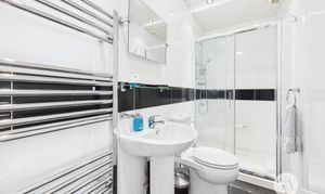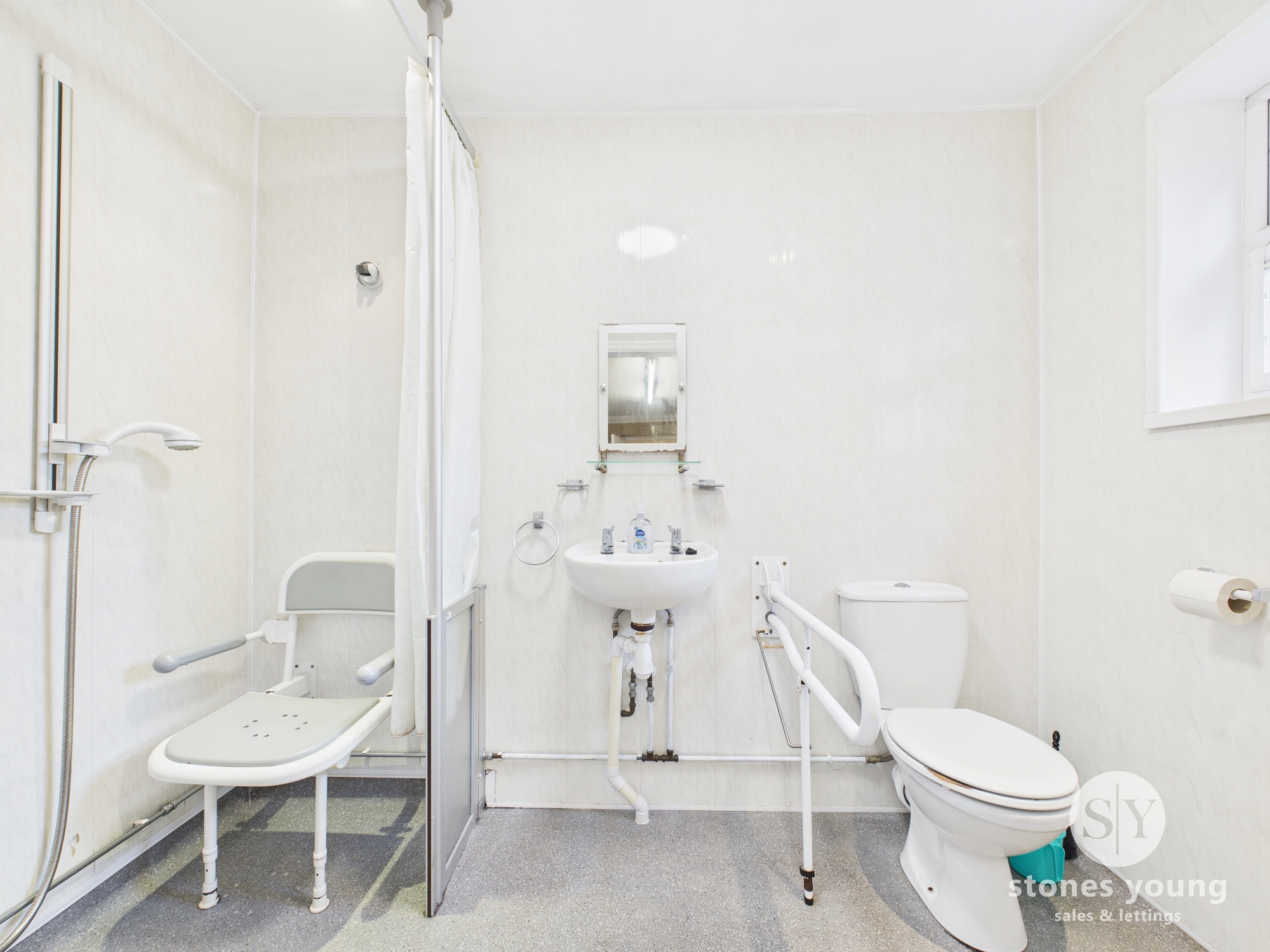 Walk in electric shower enclosure, wc and basin, ceiling spot lights, frosted double glazed uPVC window, towel radiator.
