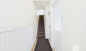 Carpet flooring, stairs leading up to second floor, panel radiator.
