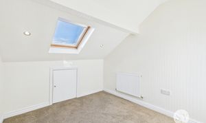 Single bedroom with carpet flooring, under eaves storage, Velux window, panel radiator.