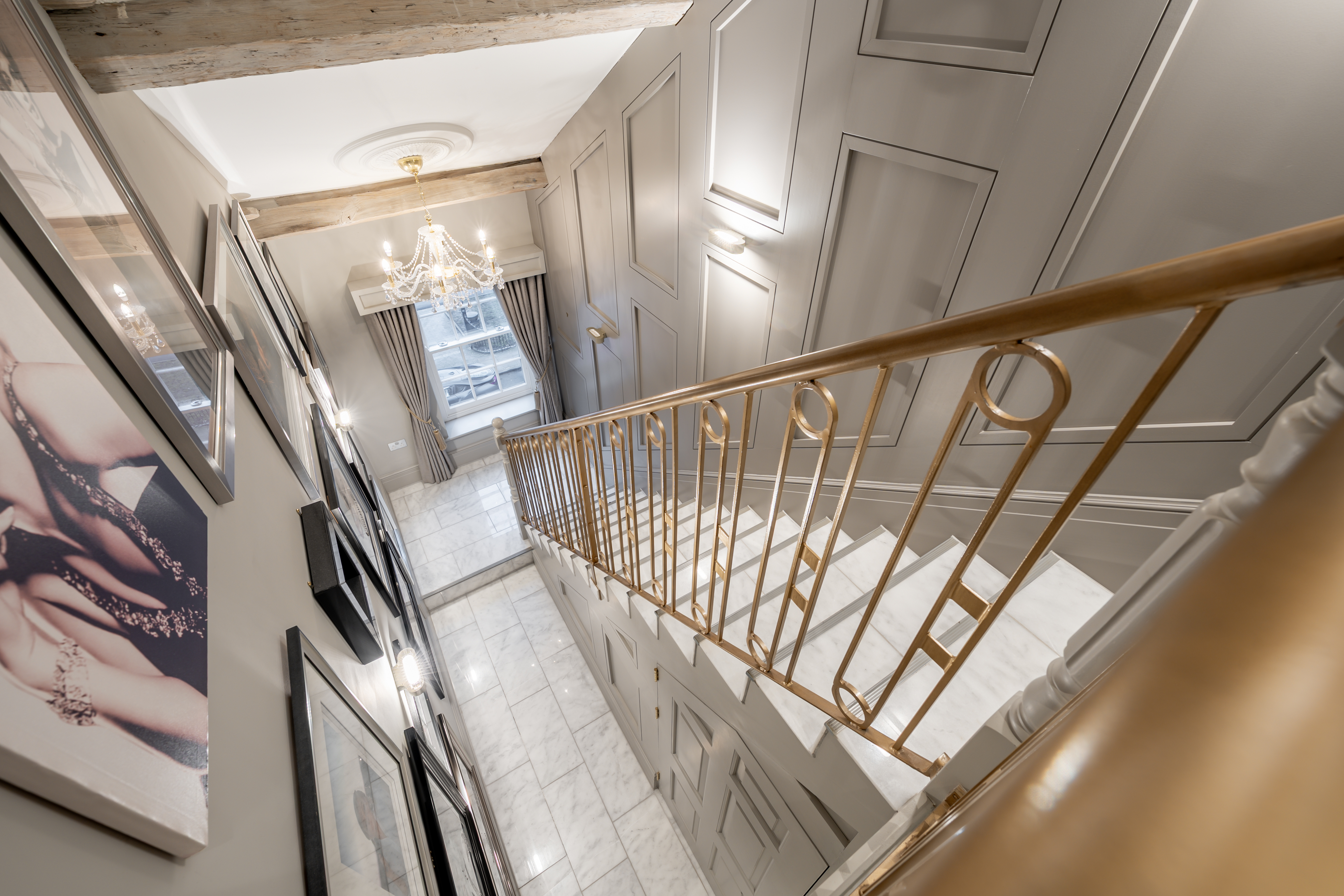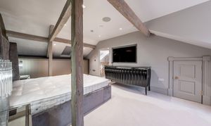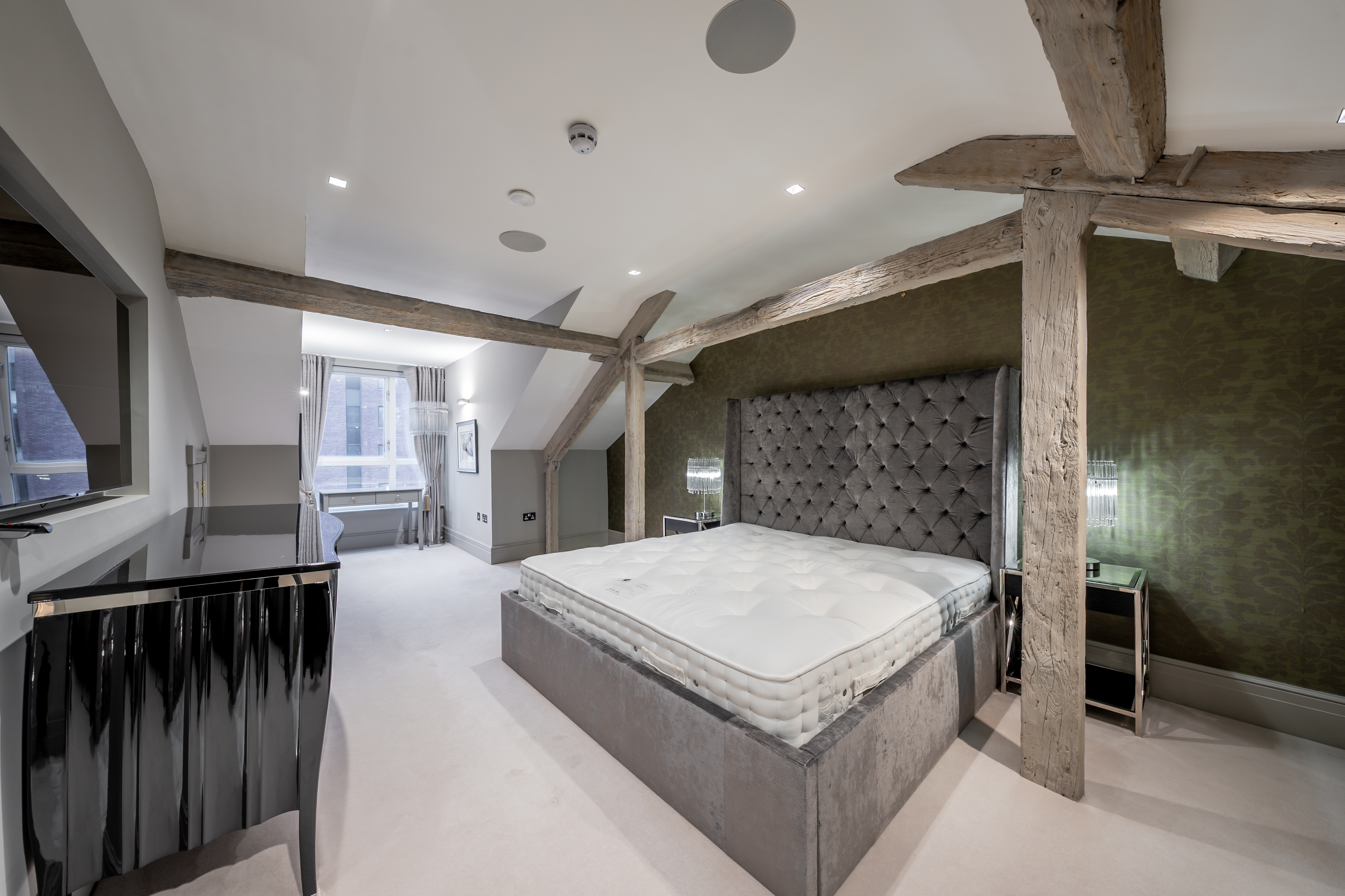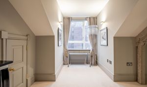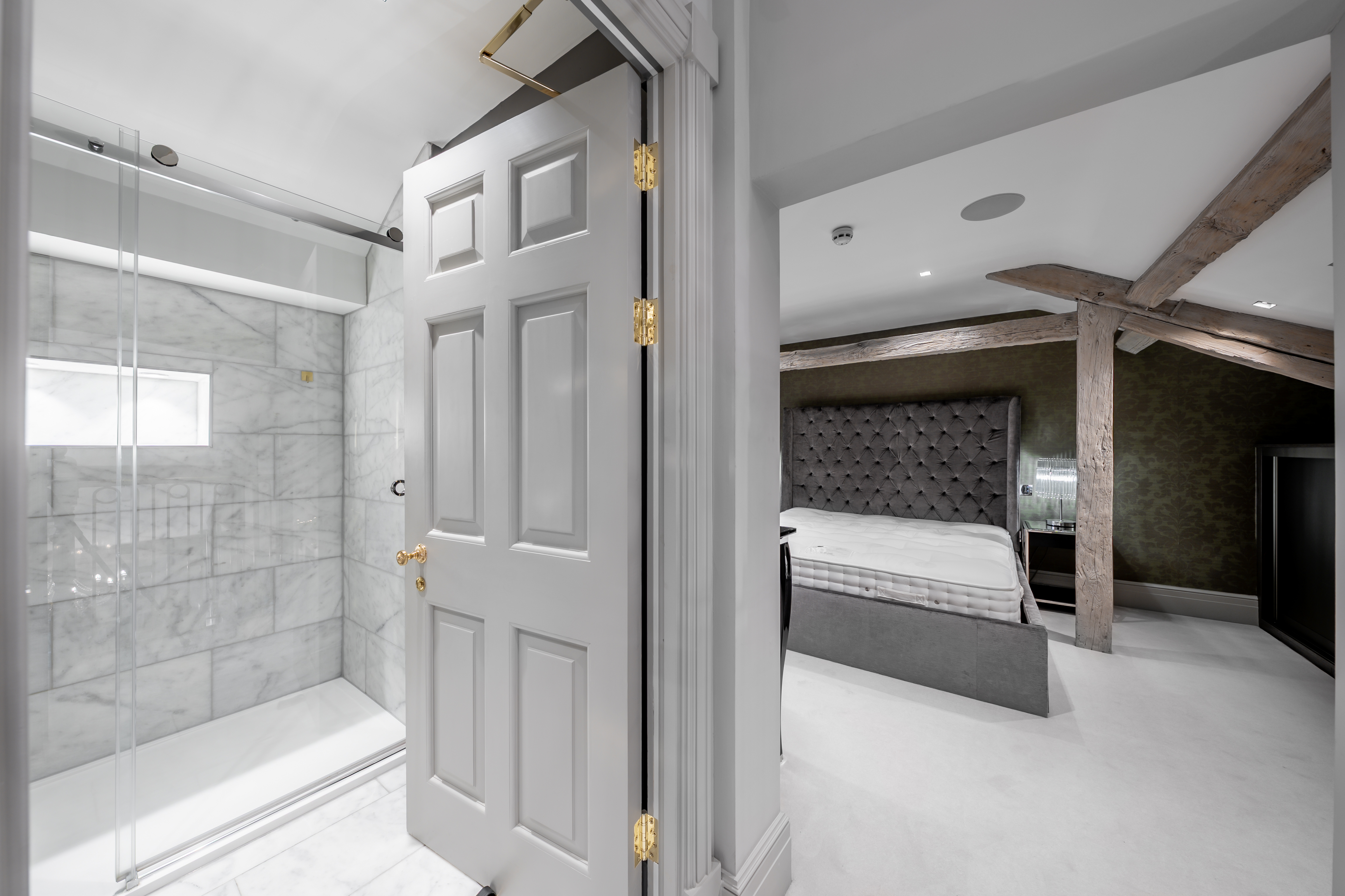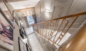 Upstairs, the top floor is devoted to an exceptional main bedroom suite, complete with high-end furnishings and a flexible space for additional furniture, a dressing area, or a quiet home office nook. Off the landing, cleverly integrated built-in storage and a beautifully appointed bathroom create a private, serene retreat away from the main living space below.