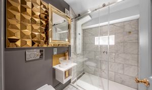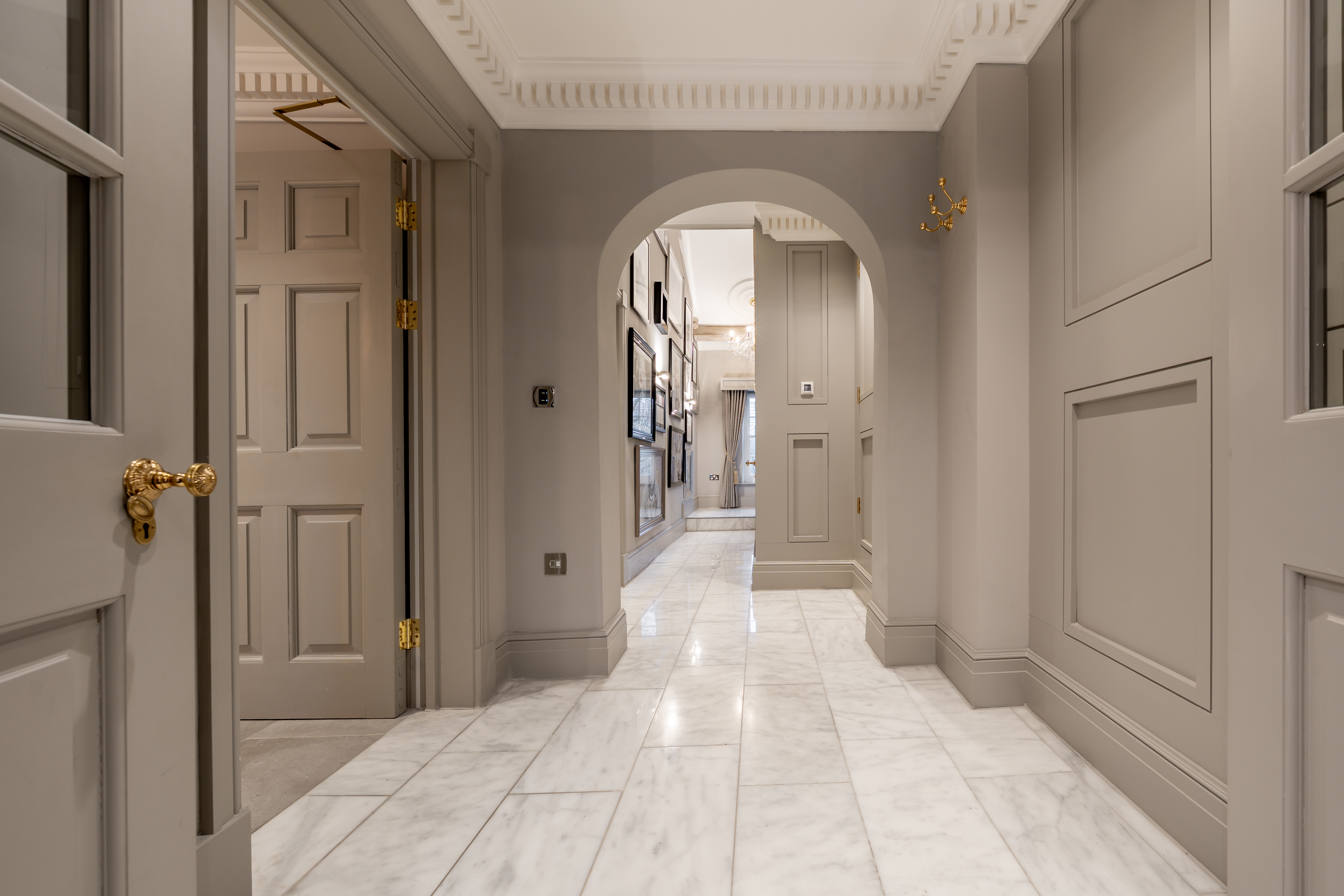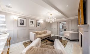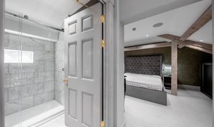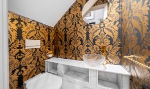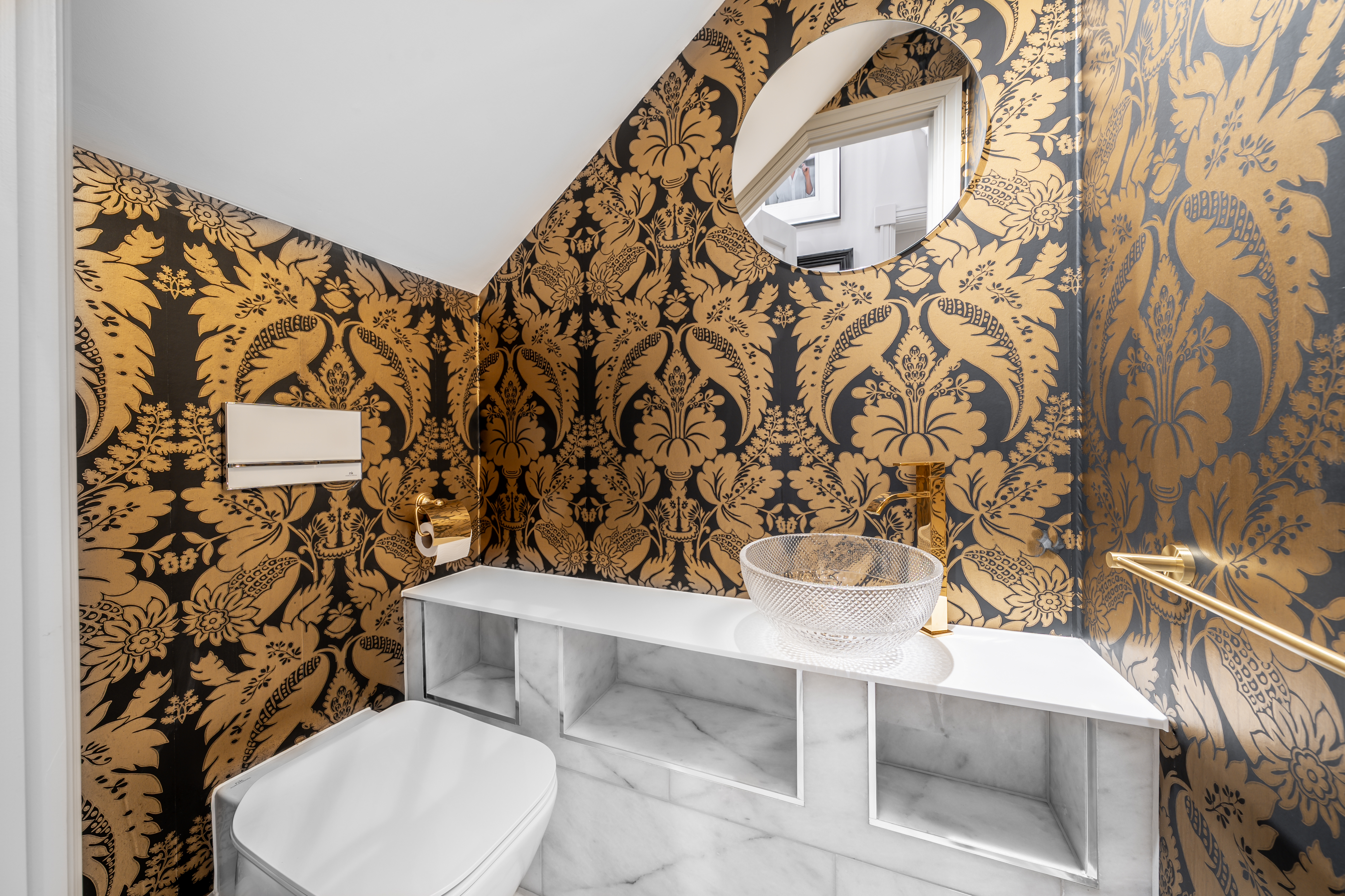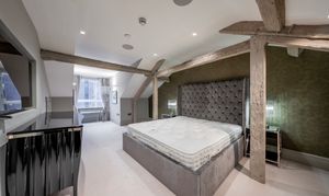 Upstairs, the top floor is devoted to an exceptional main bedroom suite, complete with high-end furnishings and a flexible space for additional furniture, a dressing area, or a quiet home office nook. Off the landing, cleverly integrated built-in storage and a beautifully appointed bathroom create a private, serene retreat away from the main living space below.