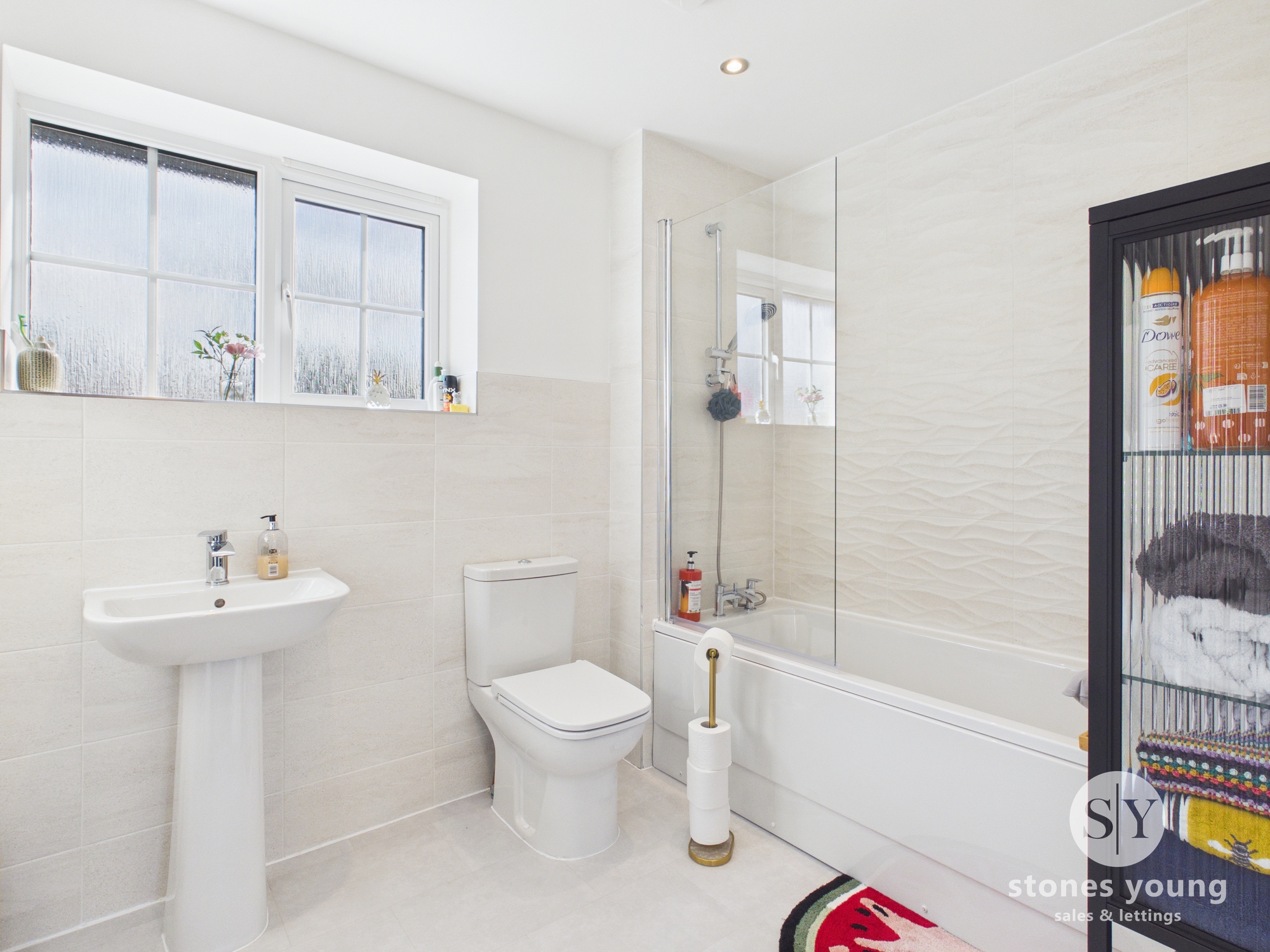 LVT flooring, three piece in white comprising of mains fed shower over bath, wc and basin, tiled splash backs, ceiling spot lights, frosted double glazed uPVC window, towel radiator.