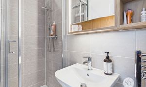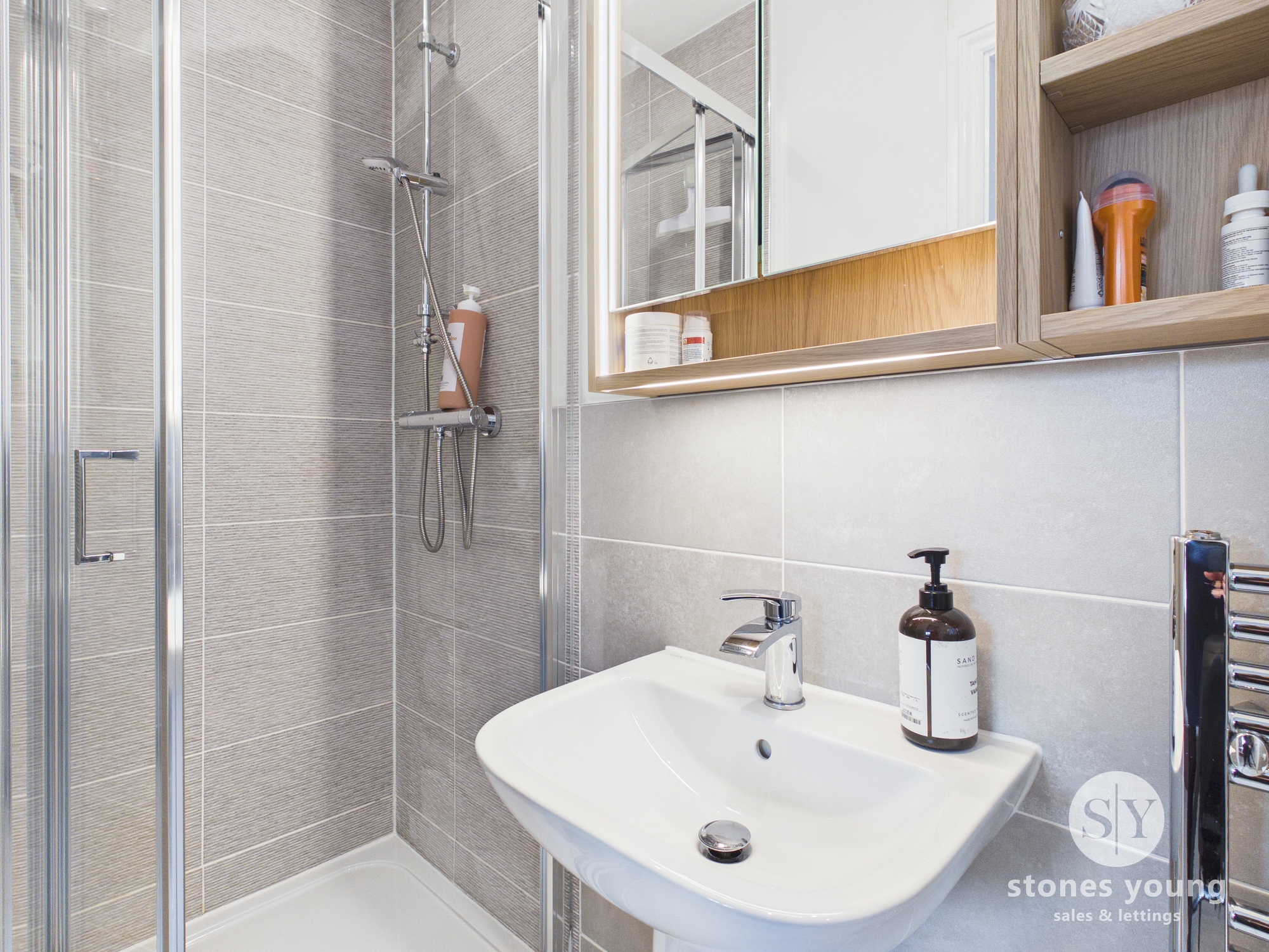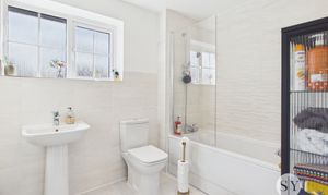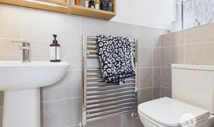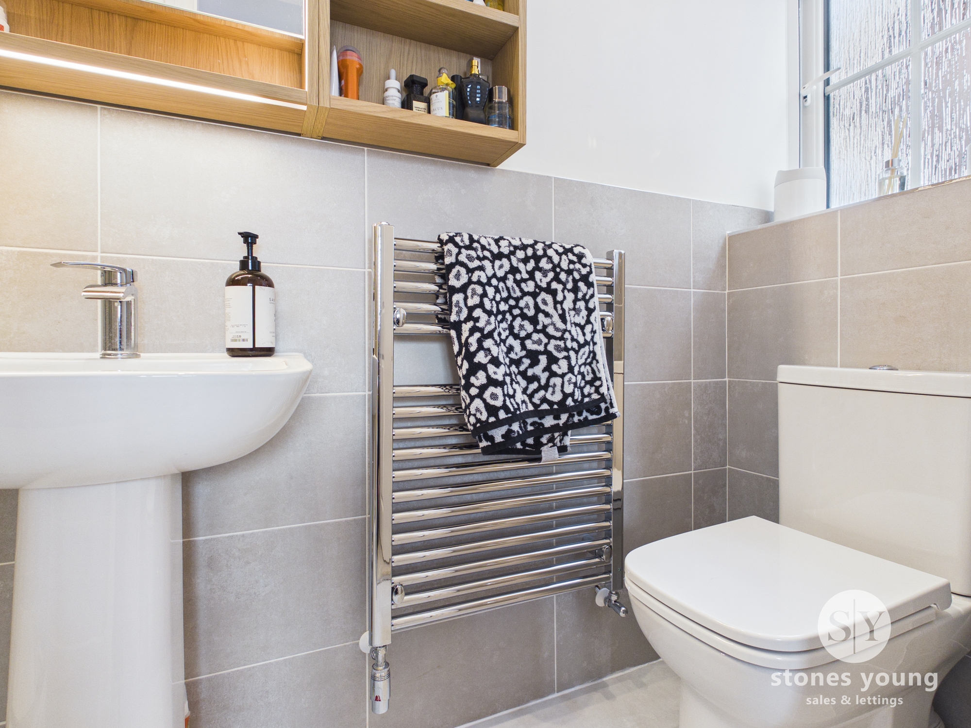 LVT flooring, three piece in white comprising of mains fed shower enclosure, wc and basin, tiled splash backs, frosted double glazed uPVC window, towel radiator.