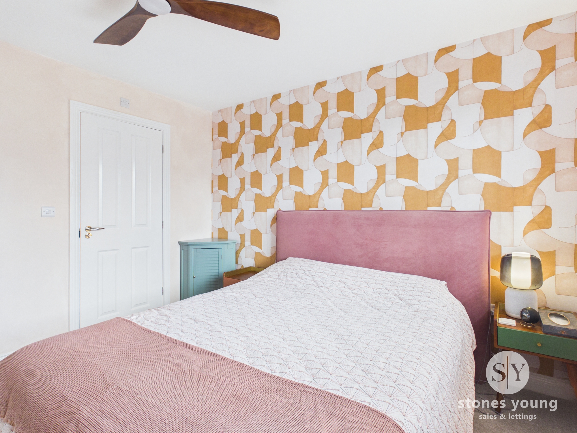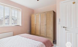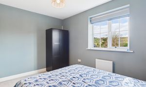 Double bedroom with carpet flooring, double glazed uPVC window, panel radiator.