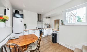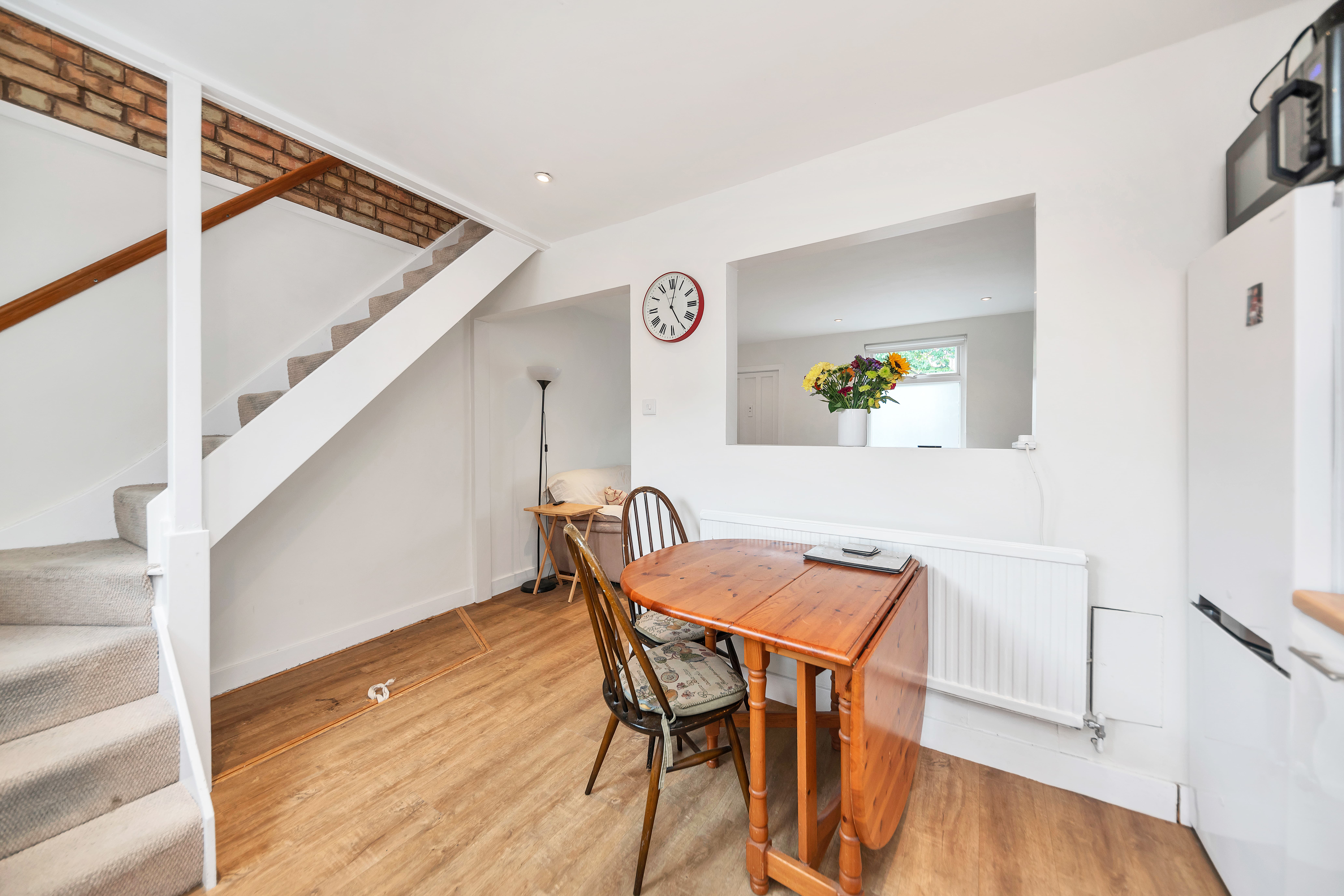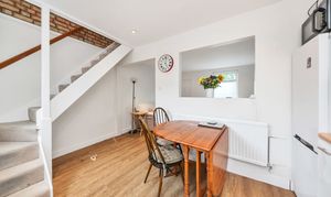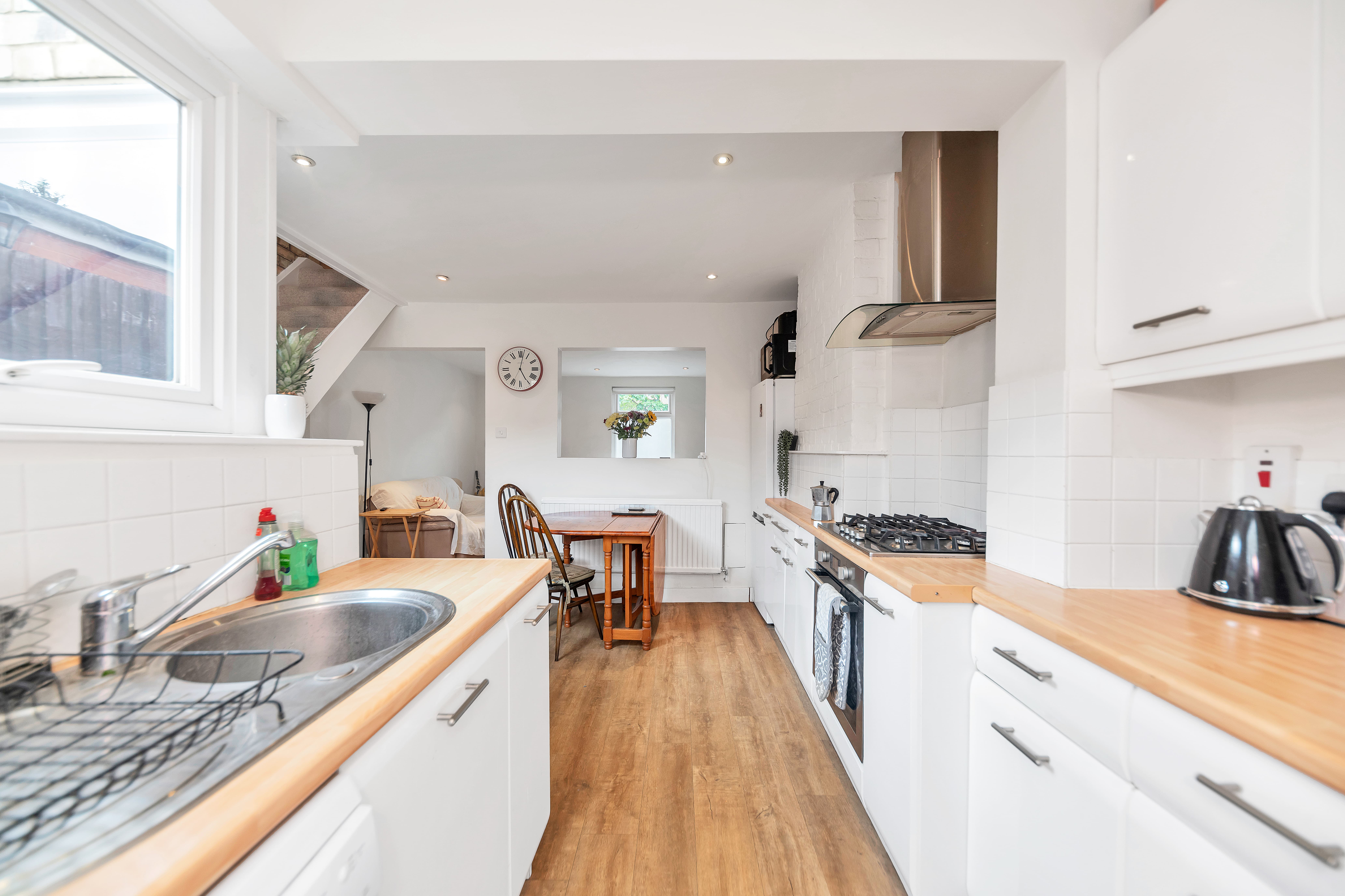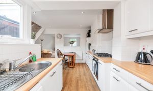 The kitchen/dining room is an excellent size, enjoying windows and a door to a garden aspect, a wide range of base and wall units, laminate worktops, wood flooring, tiled splashbacks, inset lighting, stairs to the first floor, an integrated oven, gas hob and extractor hood, and space for a fridge/freezer, dishwasher, dining setting and other small kitchen appliances.