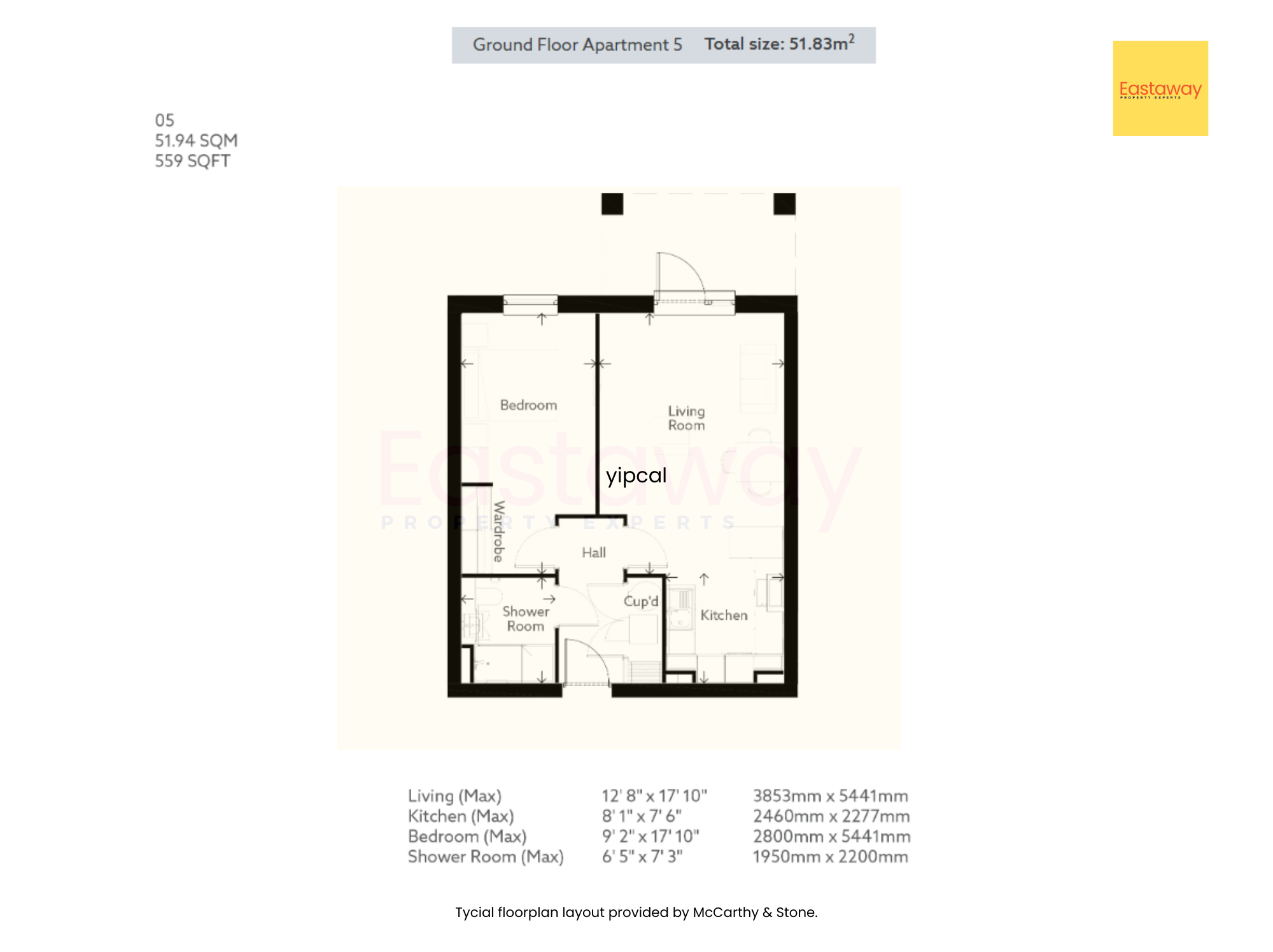 Floorplans and room dimensions are provided for guidance only. Measurements are maximum dimensions and layouts shown are typical designs provided by McCarthy & Stone. Individual apartments may vary.