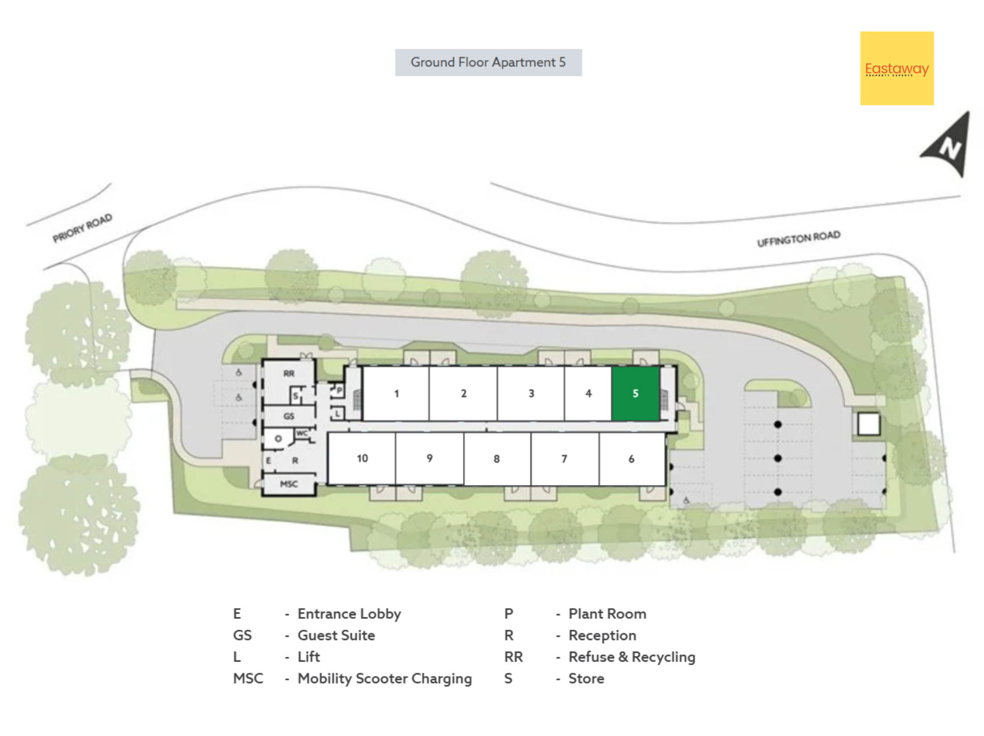 Apartment 05 is a spacious, ground floor one bedroom retirement apartment positioned with a north west aspect, offering a pleasant balance of natural light and privacy.