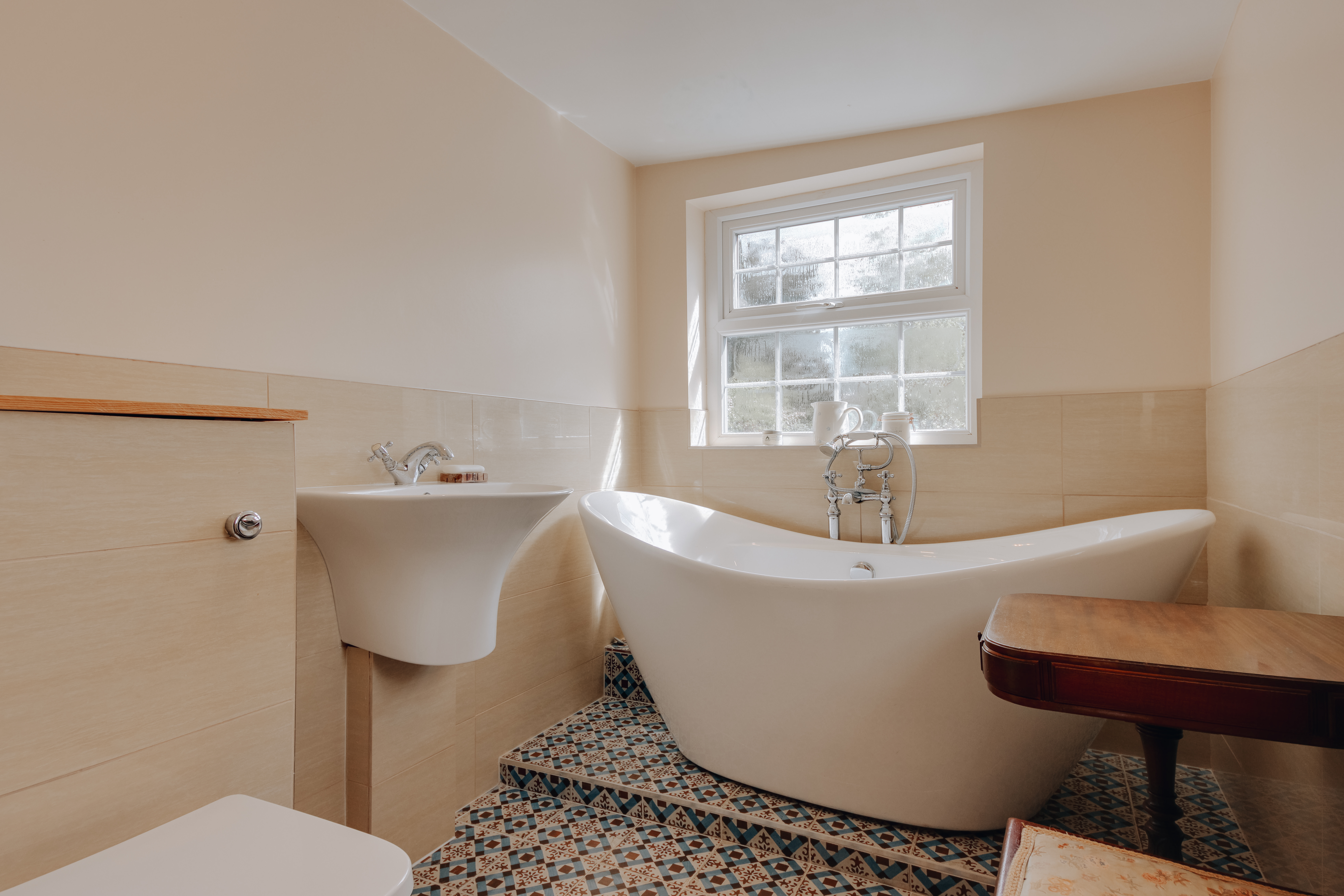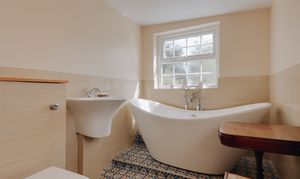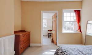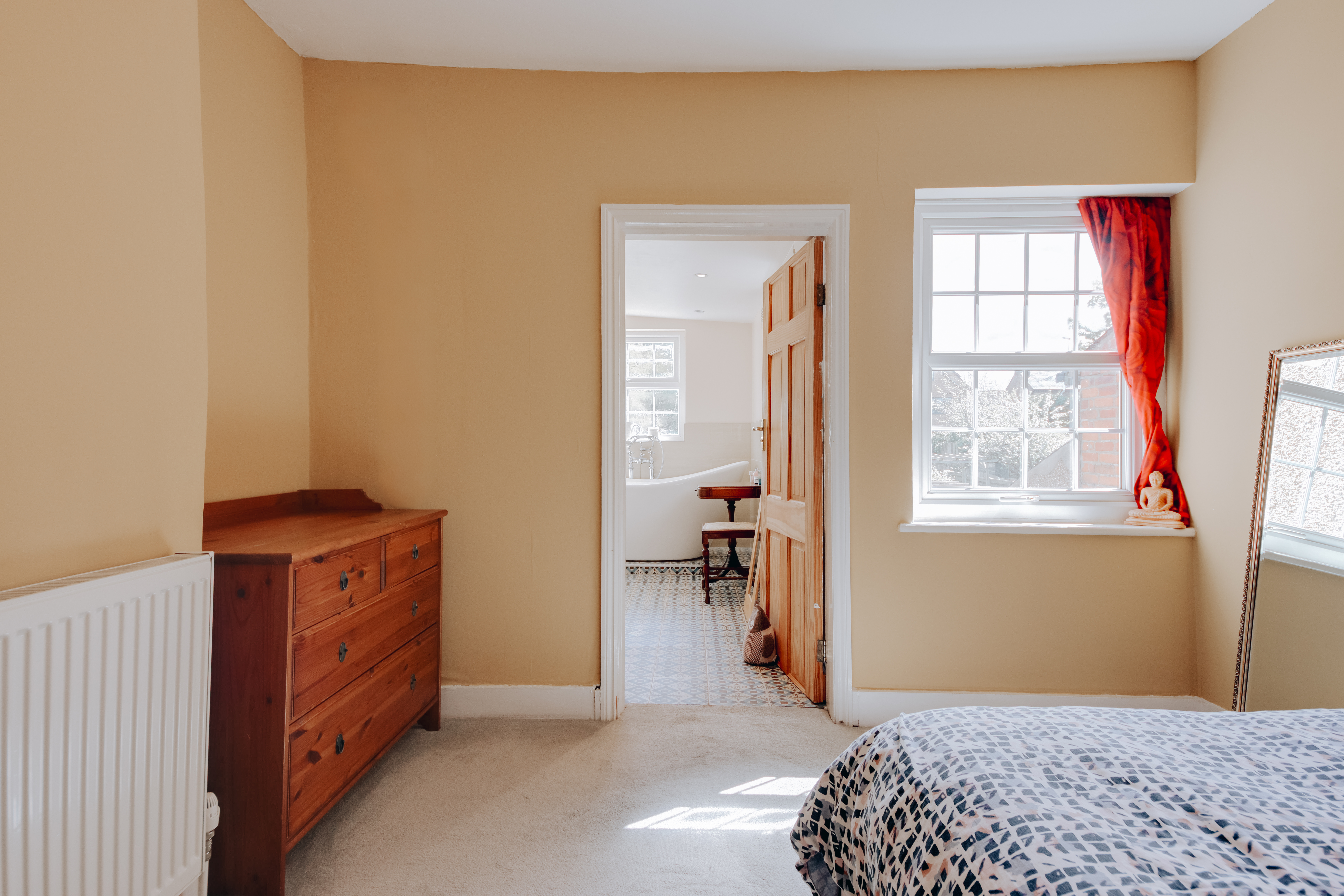 Ascending the staircase to the first floor, you'll find two generously sized double bedrooms. The main bedroom boasts large windows that bathe the room in natural light, while built-in cabinetry offers ample storage. Enjoy the luxury of an en-suite bathroom, highlighted by Westminster tiles and a stunning freestanding bathtub beneath a frosted window, perfectly positioned for privacy and ambiance.